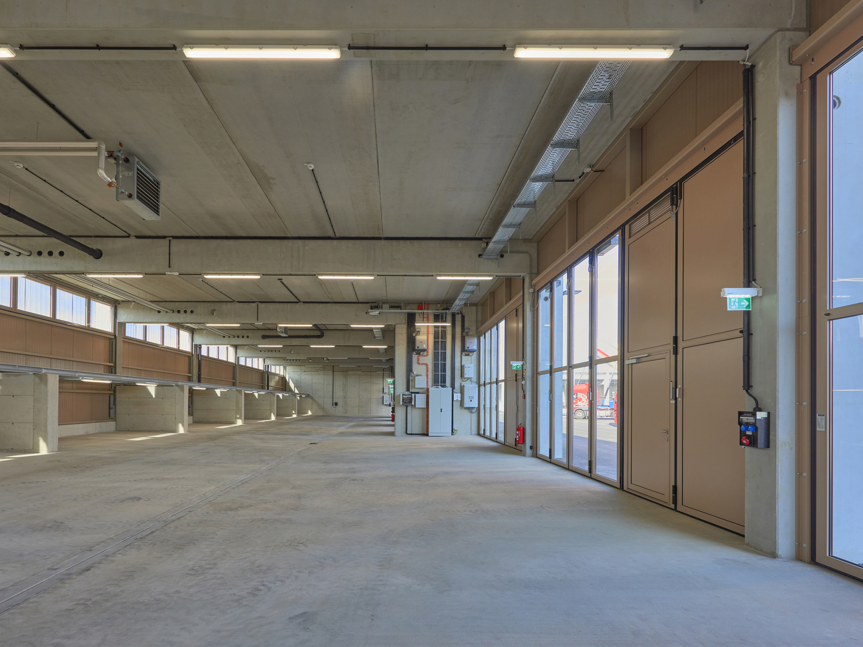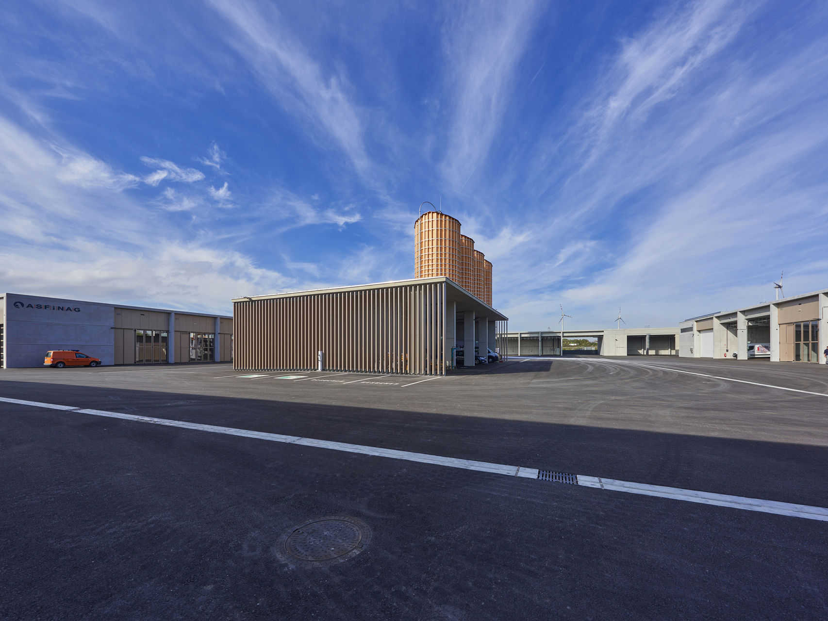Die Ein- und Ausfahrt erfolgt direkt von der A4 von Norden mit Tankstelle und Flugdachbereichen. Nach Osten hin ist der Wertstoff- und Müllbereich angeordnet. Für eine zentrale Einbringung und Befüllung befinden sich in der Mitte die Salzbehälter und die Salzhalle. Im Zentrum sind die Werkhalle, die Einstellhalle, das Magazin und Einstellbereiche. Der Hof kann von den Büros und von der Werkstatt aus gut überblickt werden. Insgesamt bündelt der Betriebshof alle Funktionen auf kurzem Weg und ermöglicht ungestörtes Arbeiten. Große Durchblicke ermöglichen den Ausblick in die Landschaft.