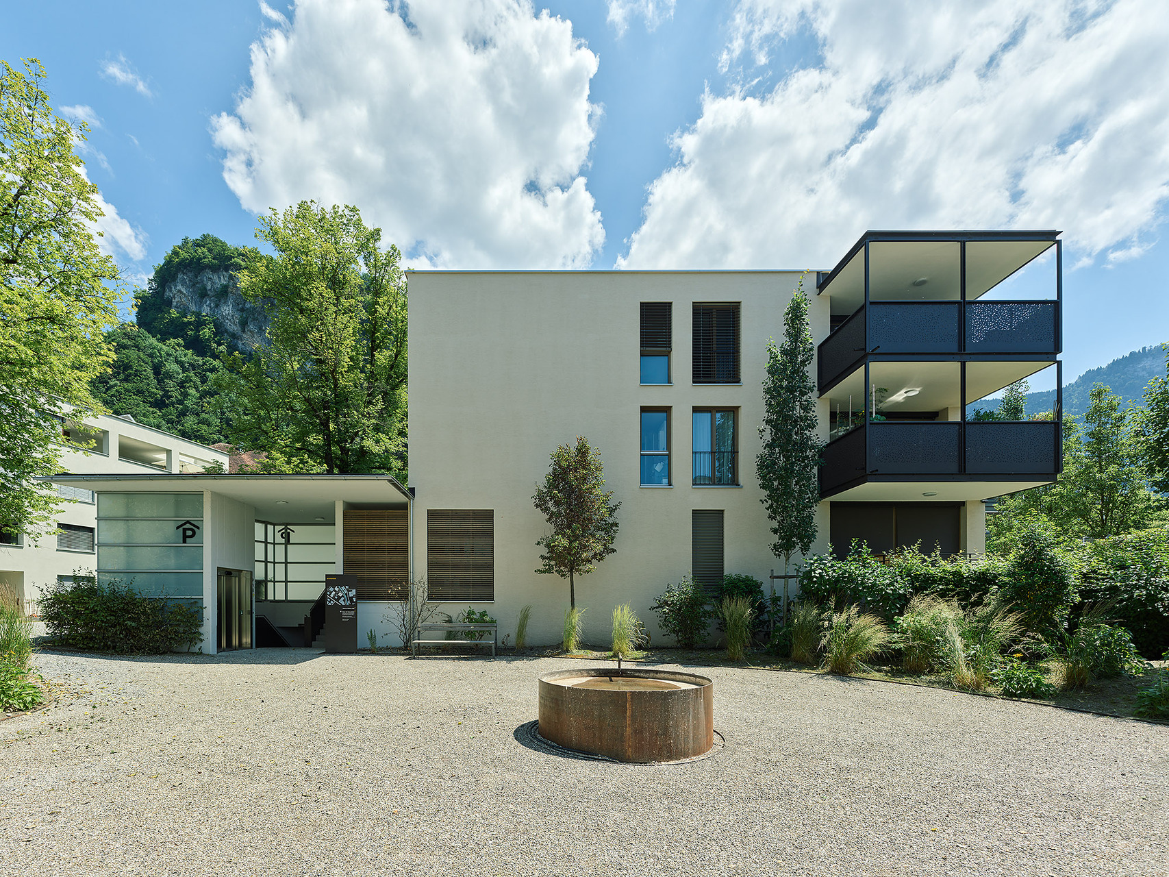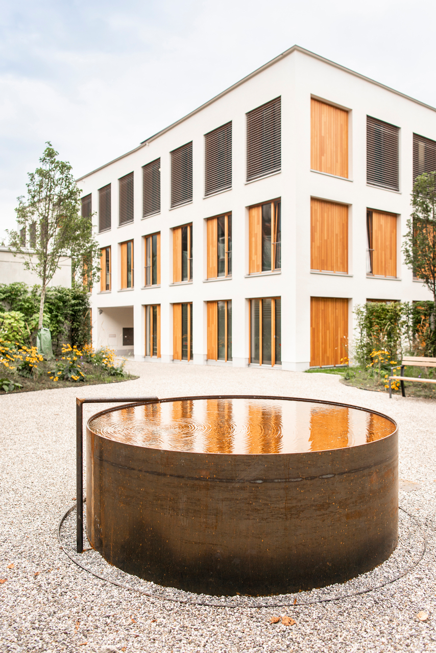 Großzügig gestaltete Außenanlage mit Brunnen und öffentlicher Durchwegung.