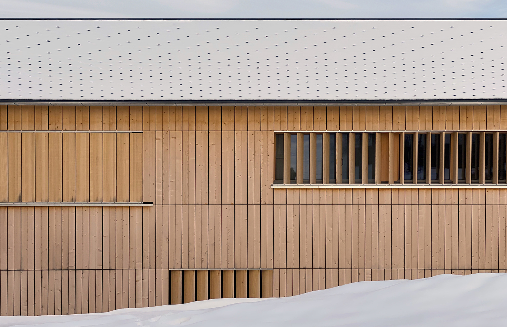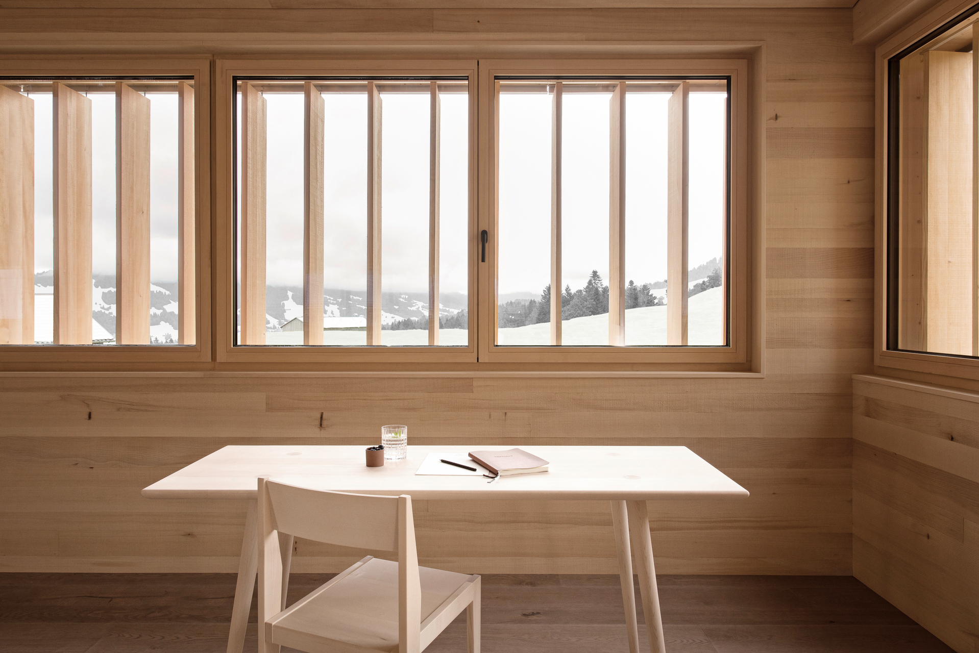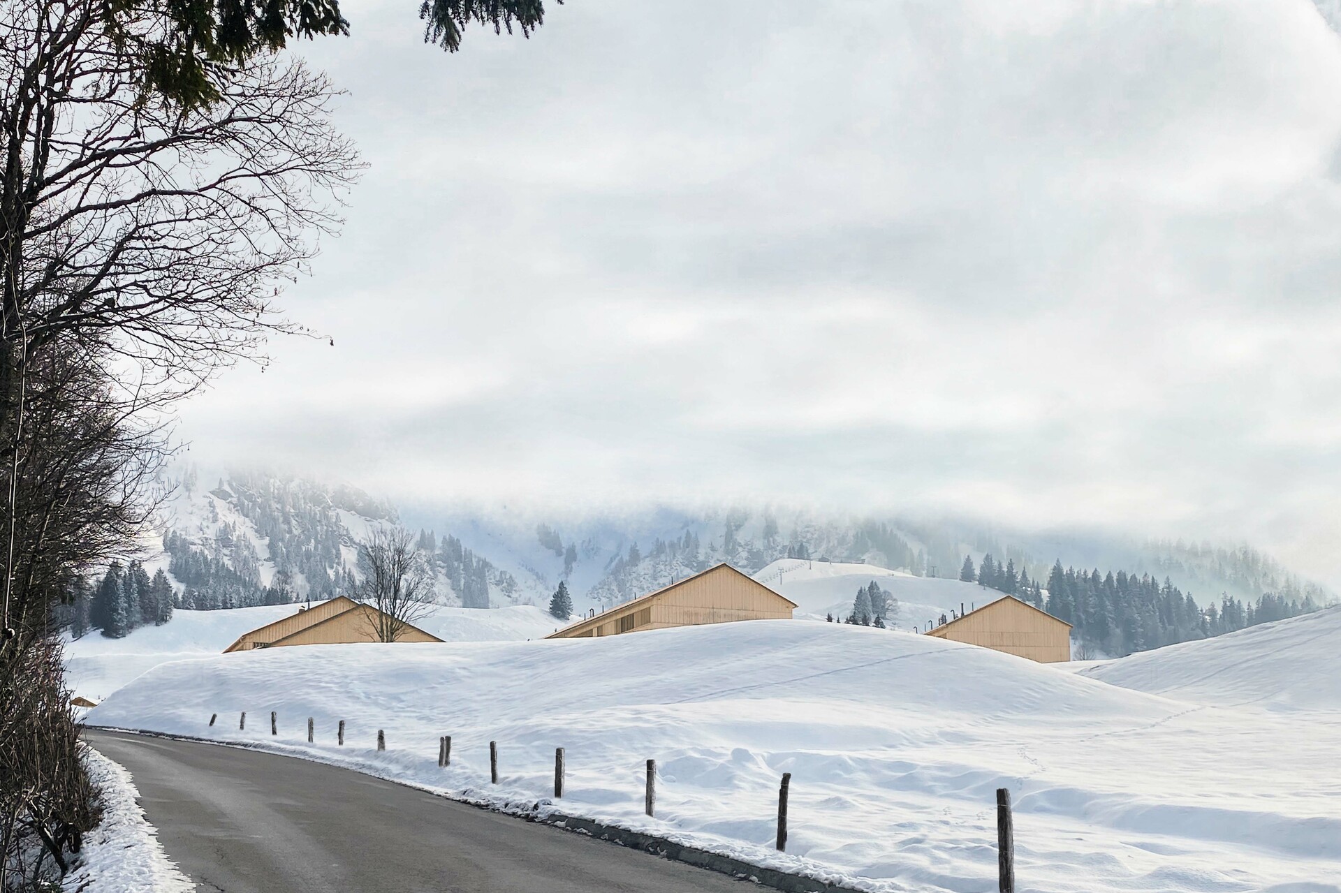 Das Vorsäss Eggatsberg ist rund einen Kilometer entfernt. Ludescher + Lutz nahmen Anleihen an seiner Typologie, um das ambitionierte Raumprogramm mit seiner beachtlichen Kubatur so achtsam wie möglich in die sensible Landschaft zu setzen. Wie lose hingewürfelt verteilen sich nun sechs wesensverwandte Holzhäuser mit Satteldach auf dem Grundstück. Ihre Firste verläuft von Norden nach Süden, alle Räume sind nach Osten und Westen orientiert. Das Gasthaus, in dem anspruchsvoll regional gekocht wird, ist gleichermaßen der Leithammel in der Herde. Etwas größer als die anderen steht es als erstes Haus an der Straßenkreuzung beim Parkplatz. Unter dem Dachvorstand der südlichen Stirnseite kann man witterungsgeschützt draußen sitzen, der Eingang ist in der Mitte, rechts und links je eine lauschige Nische, die große Stube in der Mitte ist höher, dort steht auch der Kamin. Unterm Satteldach finden Seminarräume und eine Bibliothek Platz. Das rückwärts im Norden straßenseitig anschließende Haus – die Tenne – nimmt Zulieferung, Heizung per Fernwärme, Garage und e-Ladestation auf. Im Erdgeschoss gibt es 200 m² Reservefläche für Veranstaltungen und Feste.