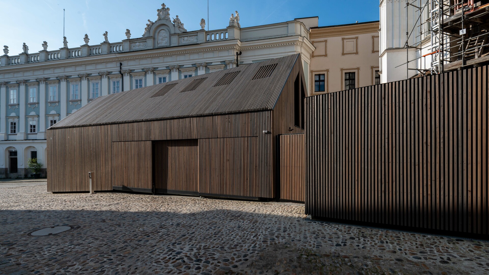 Das Volumen und die Proportionen sind entlang historischer Sichtbeziehungen und Gebäudeachsen generiert – der zum Residenzplatz hin fallende First und der sich konisch verjüngende Grundriss reduzieren die Ansichtsfläche und lassen den Massivholzbau noch kleiner erscheinen.