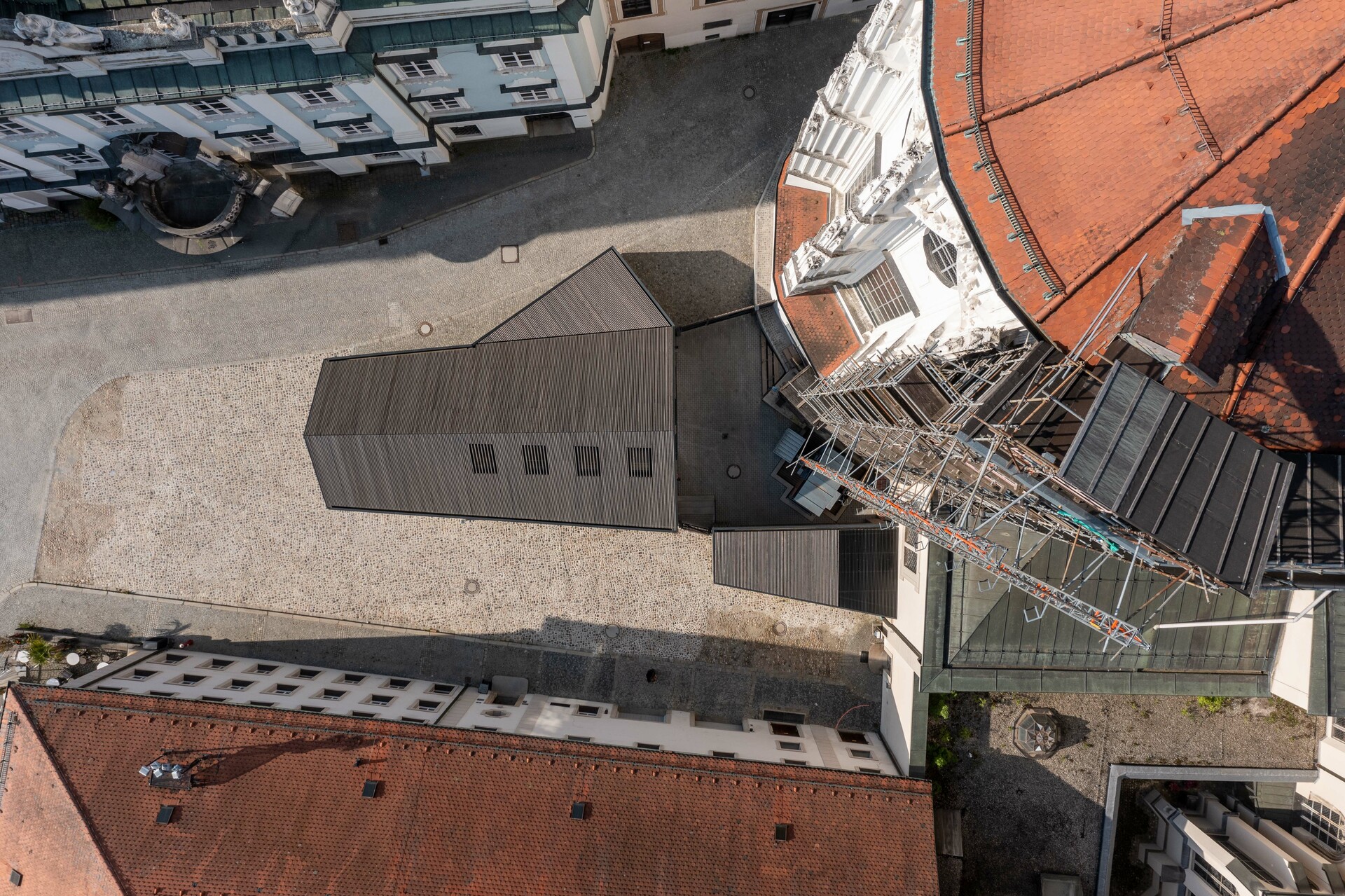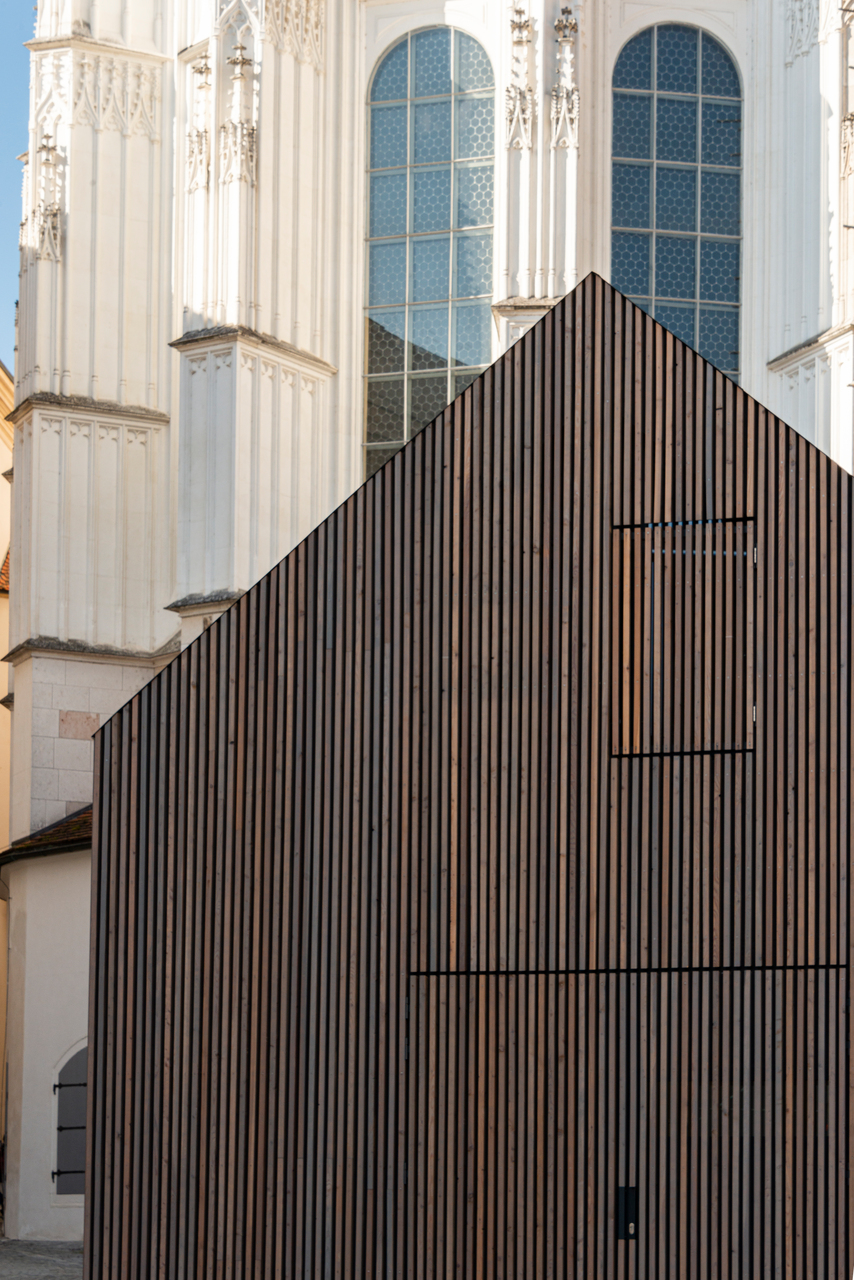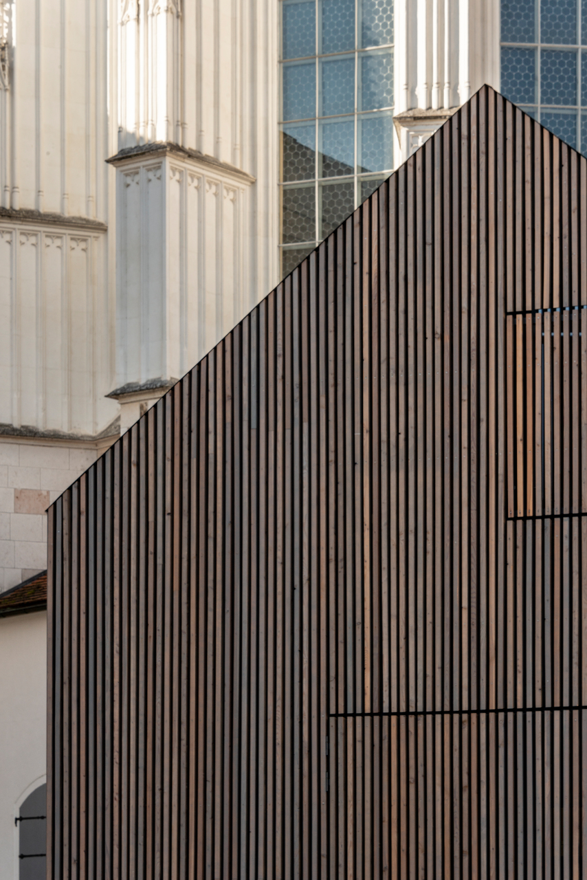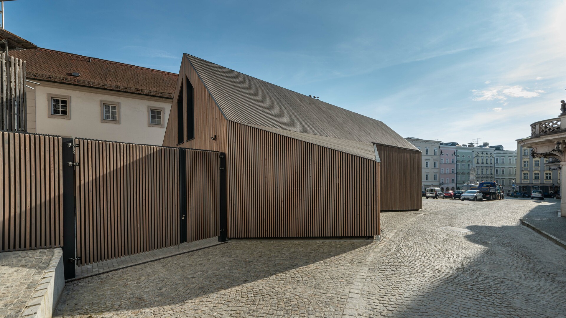 Um ein homogenes monolithisches Erscheinungsbild zu erzeugen, zeigt sich die gesamte Gebäudehülle inklusive der Dächer als offene vorgehängte Holz-Spalierfassade. Dies geht zurück auf den Nutzerwunsch, zum Residenzplatz hin fensterlos und somit frei von Störungen durch Schaulustige zu bleiben, aber auch auf die strenge Gestaltungssatzung der Stadt Passau für Fassaden und Dachflächen und die Vorgaben des Landesamts für Denkmalpflege. Zusammen mit dem leichten Holzkleid lässt sich die simpel erscheinende Kubatur als Manifestation des Bauhüttenwesens an sich lesen – ein immaterielles Kulturerbe der UNESCO.