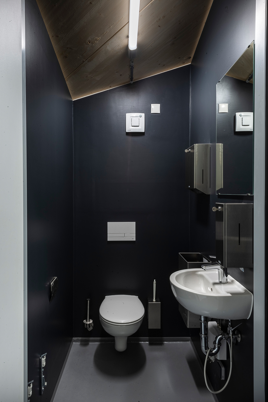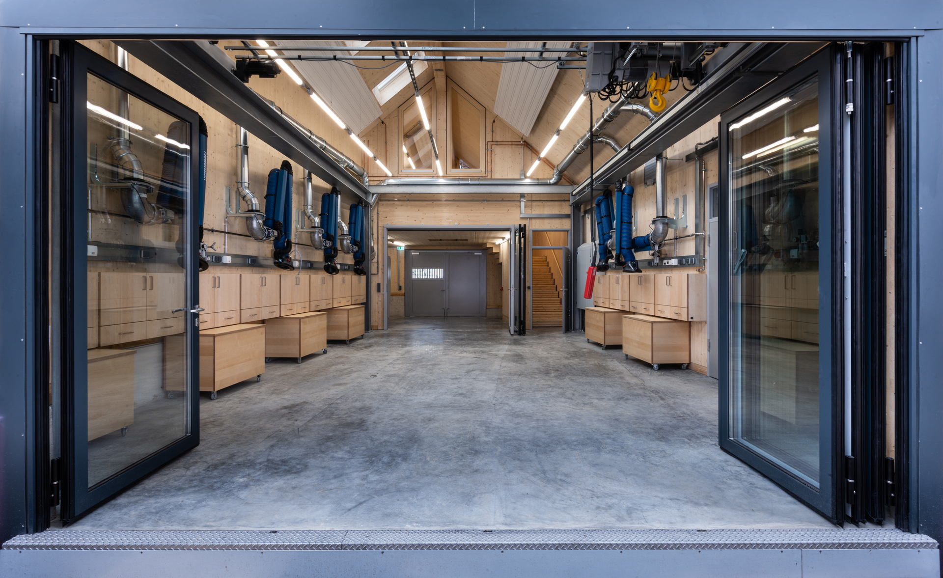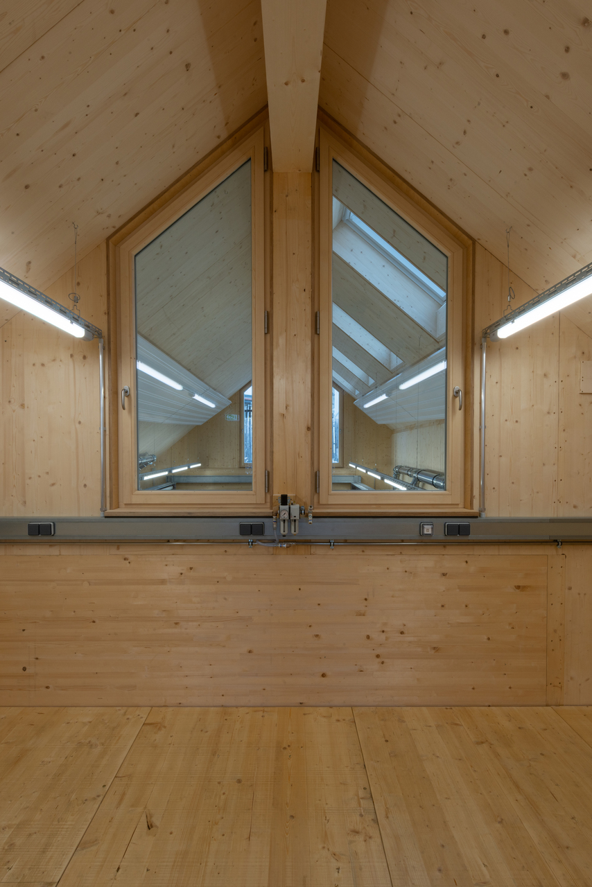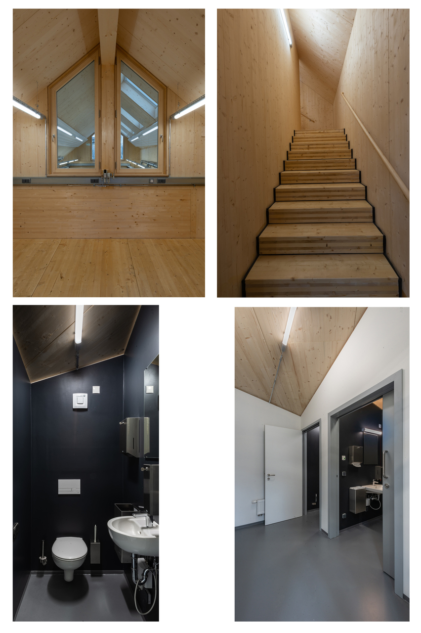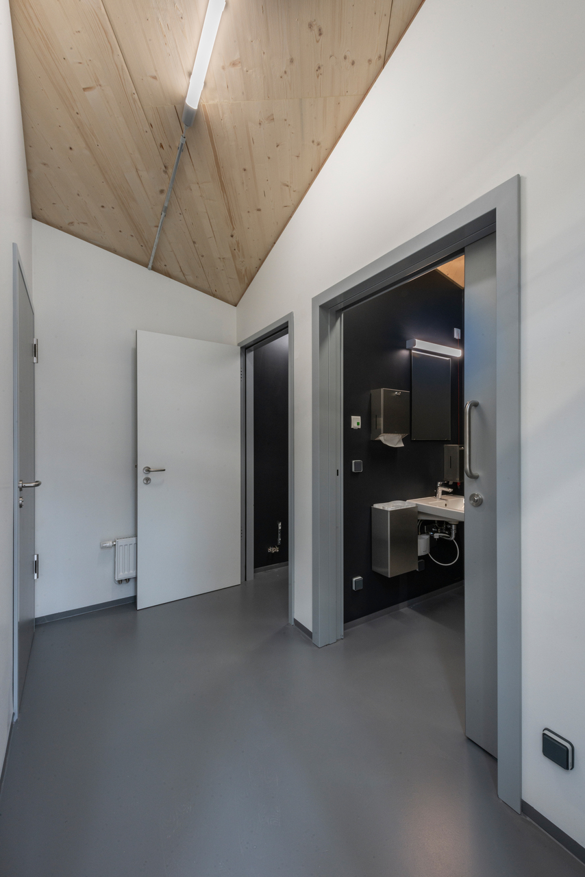 Zur Anpassung an den abfallenden Geländeverlauf wurde das Raum- und Funktionsprogram auf zwei Ebenen umgesetzt und der befahrbare Werkhof mit Außenlager und teilweise auch die Lagerflächen im Innern schräg ausgebildet.