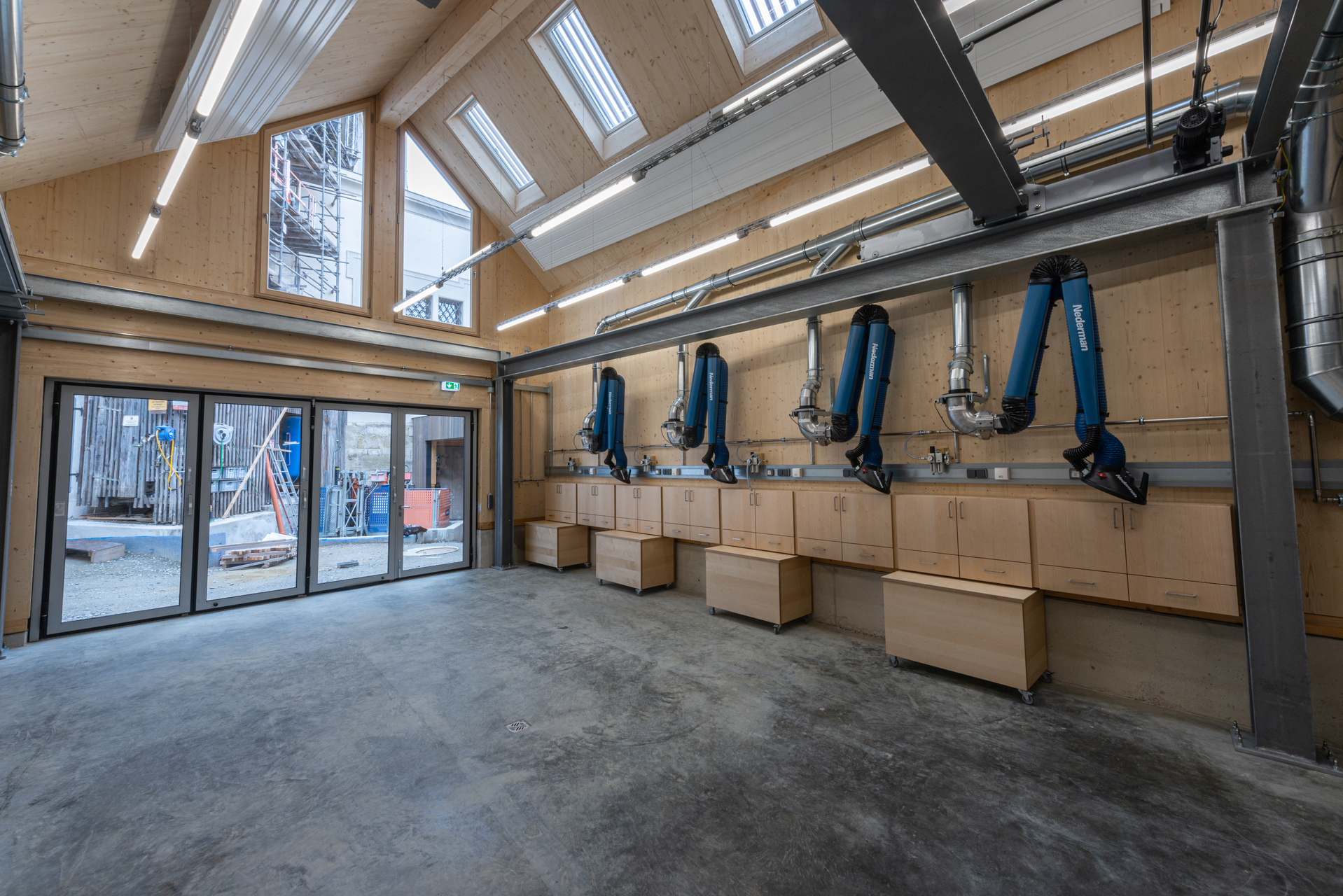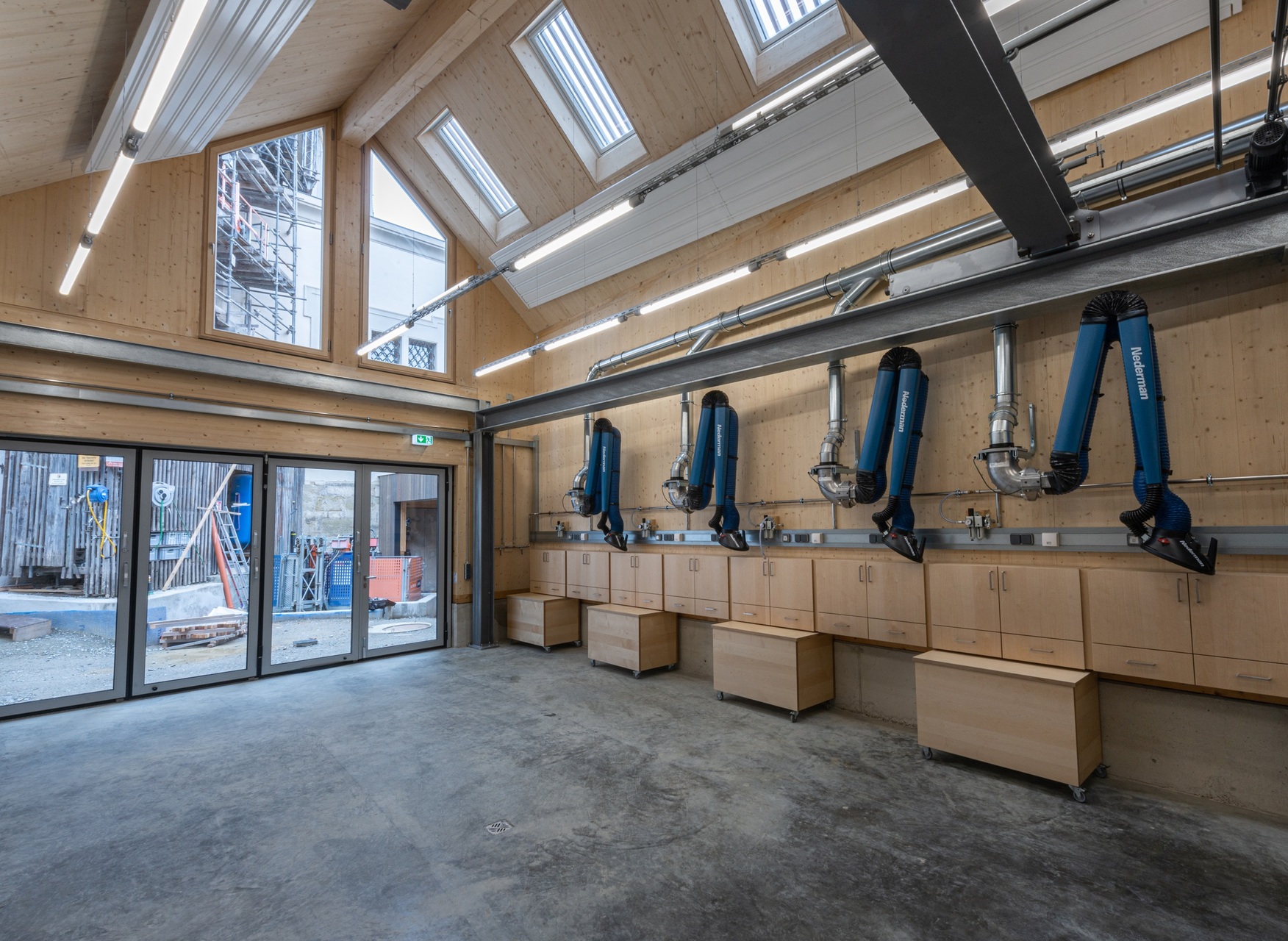 Auch die vier Dachflächenfenster wurden unauffällig in das Dach als „fünfte Fassade“ integriert. Sie lassen sich motorisch kippen und bringen blendfreies Nordlicht von oben in die Werkstatt und erzeugen mit direkter und indirekter LED-Beleuchtung farbechtes Licht für die Steinmetzarbeiten im hohen Werkraum.