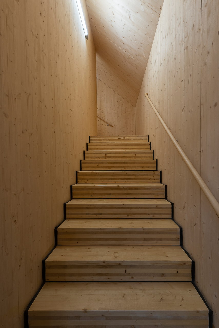 Die über Blickachsen von außen und Lichtraumprofile von innen heraus entworfene skulpturale Form ergibt mit ihrer geschlossenen homogenen Holzhülle eine „Funktionsplastik“ im Platzraum und kommt mit ihren Schrägen im Innern dem Schallschutz zugute.