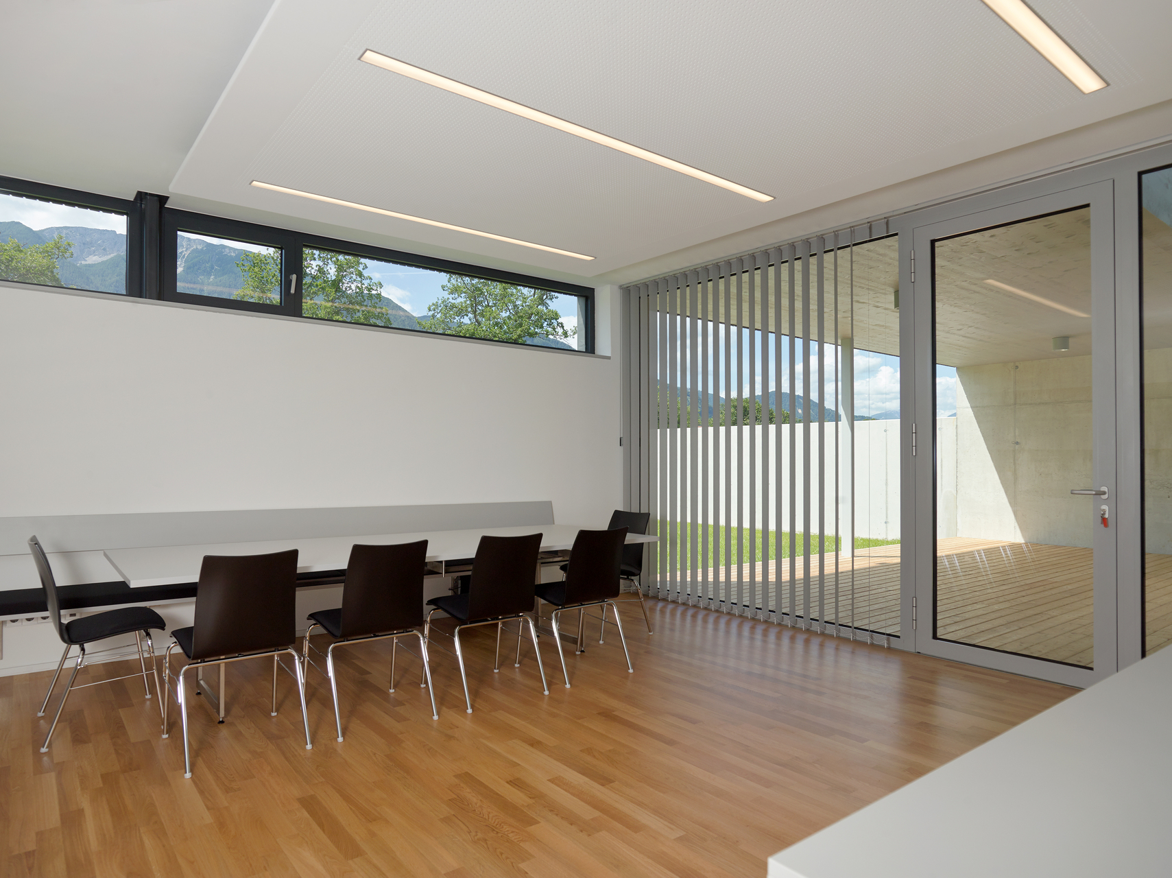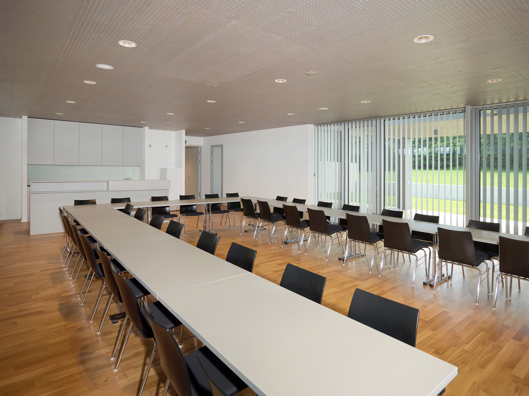 Konstruktiv wird das Gebäude in Stahlbetonbauweise errichtet, in Kombination mit Holzbauelementen, wie Brettschichtholzträger und Kreuzlagenholzdecken. (Text: Architekten)