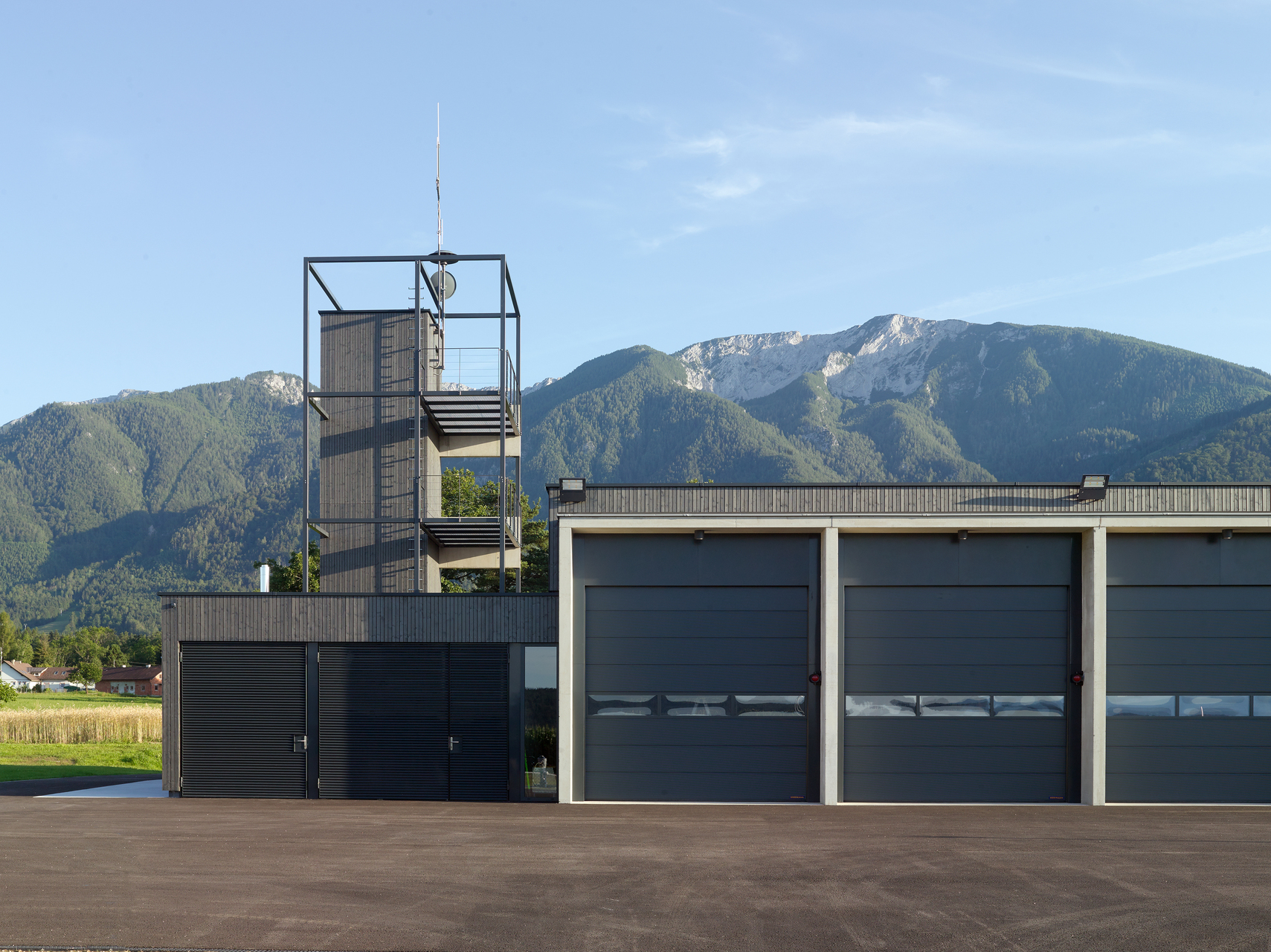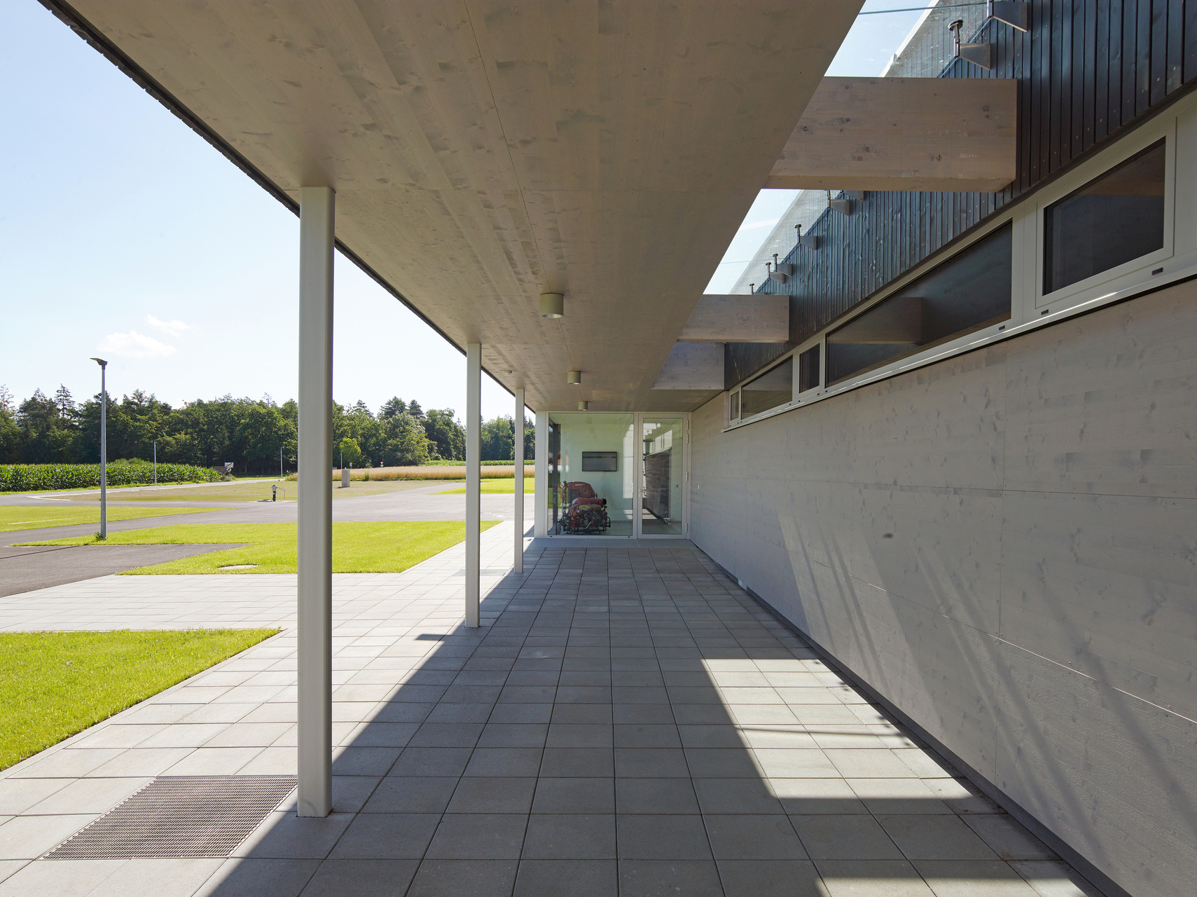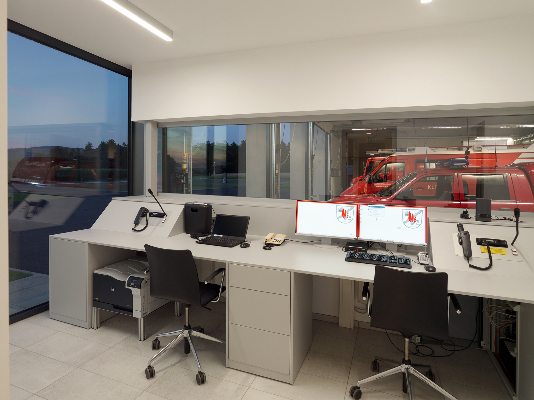 Der Eingangsbereich in das Gebäude befindet sich im Westen. Hier sind auch der Schulungsraum und die zentralen sanitären Anlagen angeordnet. Diese Zone kann auch unabhängig vom Einsatzbereich genutzt werden. Die Fahrzeughalle ist so konzipiert, dass die Kommandozentrale, die Umkleidebereiche, sowie Lager- und Werkstättenflächen direkt anschließen. Neben den vier Sektionaltoren ist die Garagenhalle zusätzlich über Gehtüren von der West- und Ostseite her erschlossen. Durch eine Oberlichtverglasung auf der Südseite erhält die Fahrzeughalle, die über eine lichte Höhe von 5,00 m verfügt, ausreichend natürliche Belichtung.