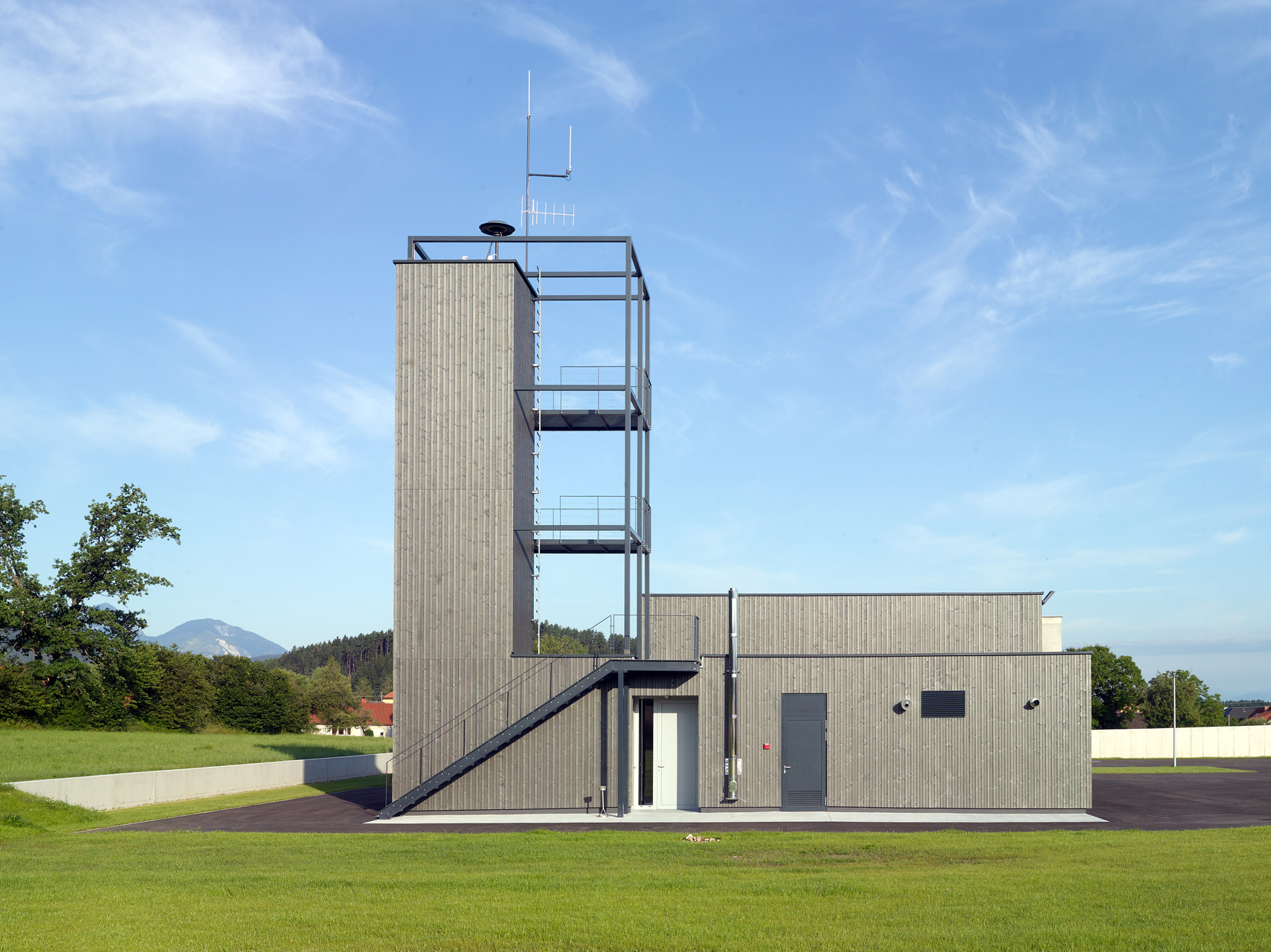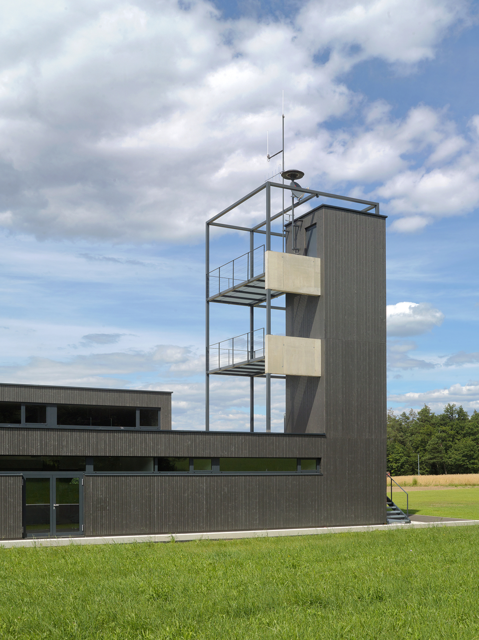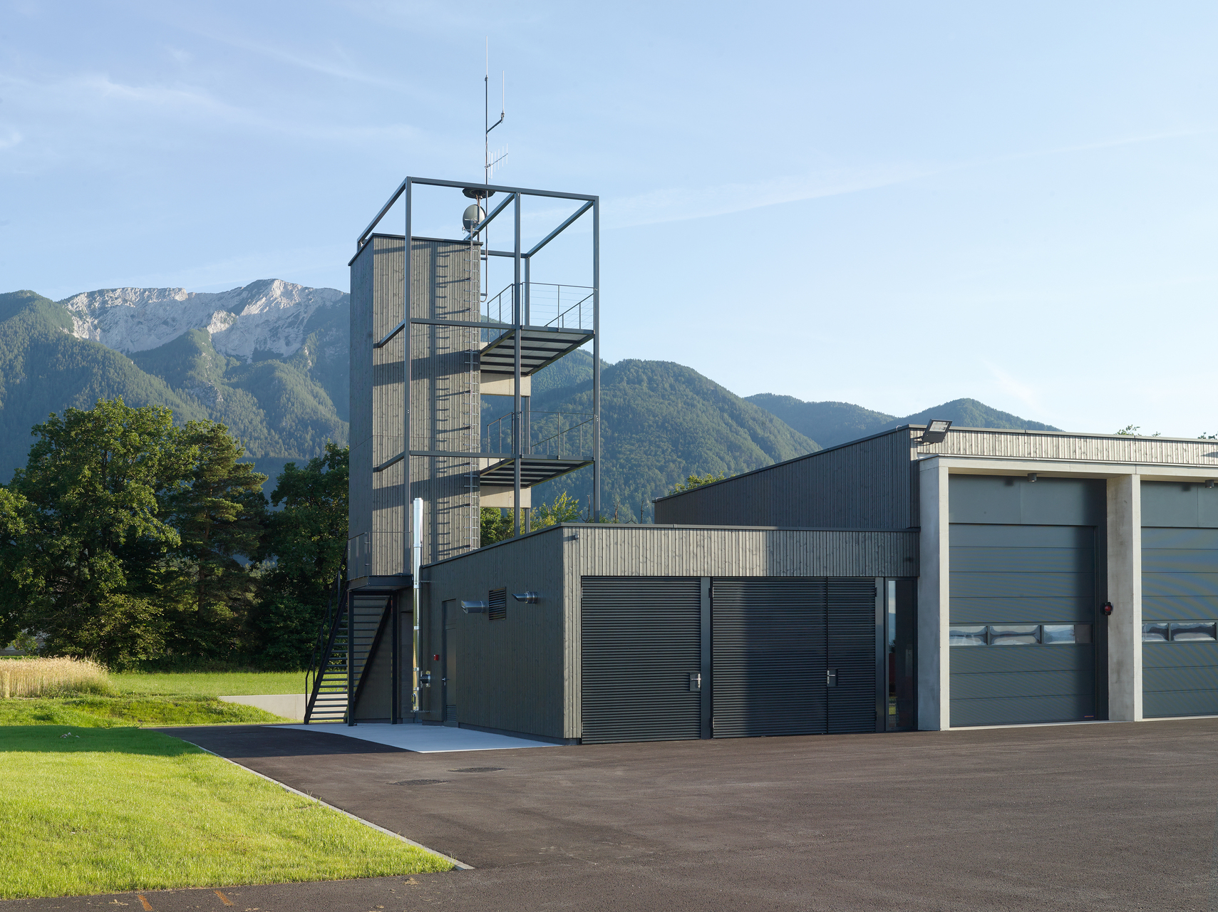 Der Eingangsbereich in das Gebäude befindet sich im Westen. Hier sind auch der Schulungsraum und die zentralen sanitären Anlagen angeordnet. Diese Zone kann auch unabhängig vom Einsatzbereich genutzt werden. Die Fahrzeughalle ist so konzipiert, dass die Kommandozentrale, die Umkleidebereiche, sowie Lager- und Werkstättenflächen direkt anschließen. Neben den vier Sektionaltoren ist die Garagenhalle zusätzlich über Gehtüren von der West- und Ostseite her erschlossen. Durch eine Oberlichtverglasung auf der Südseite erhält die Fahrzeughalle, die über eine lichte Höhe von 5,00 m verfügt, ausreichend natürliche Belichtung.