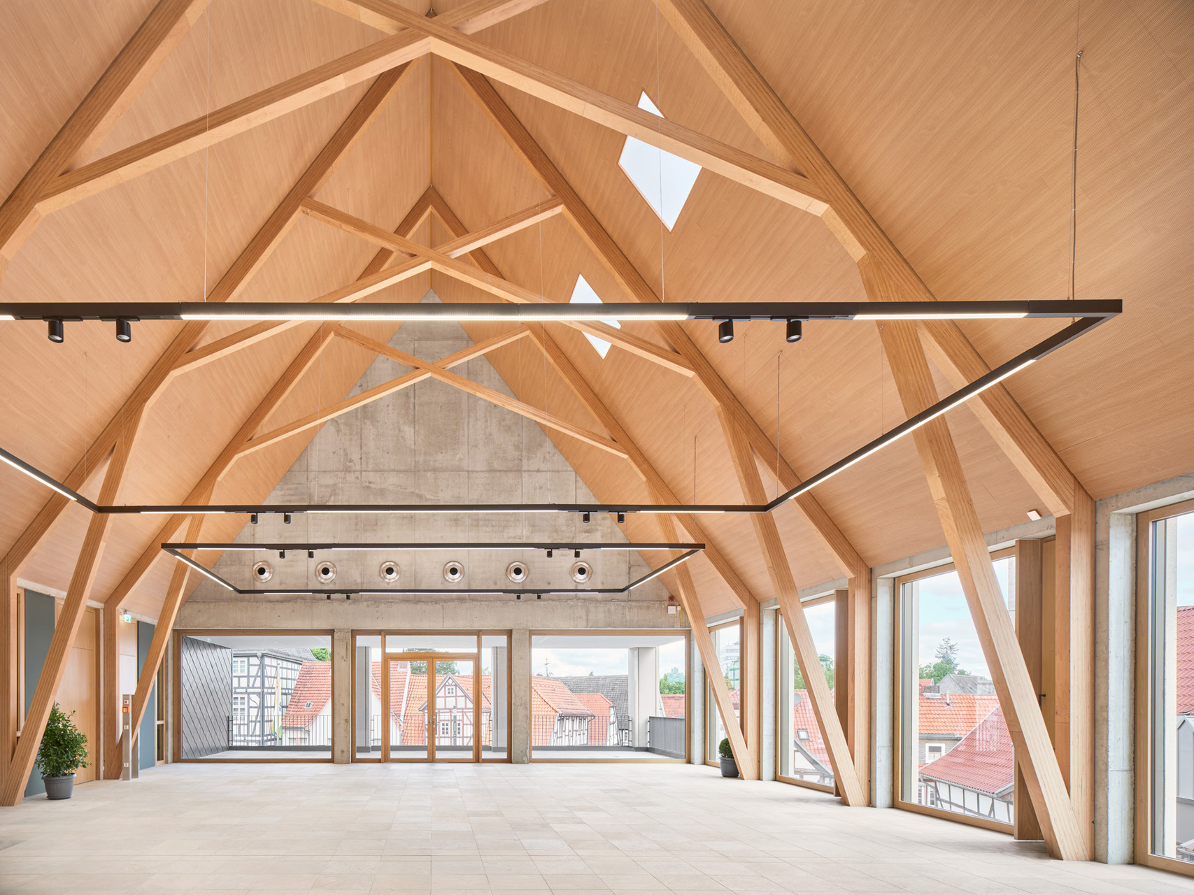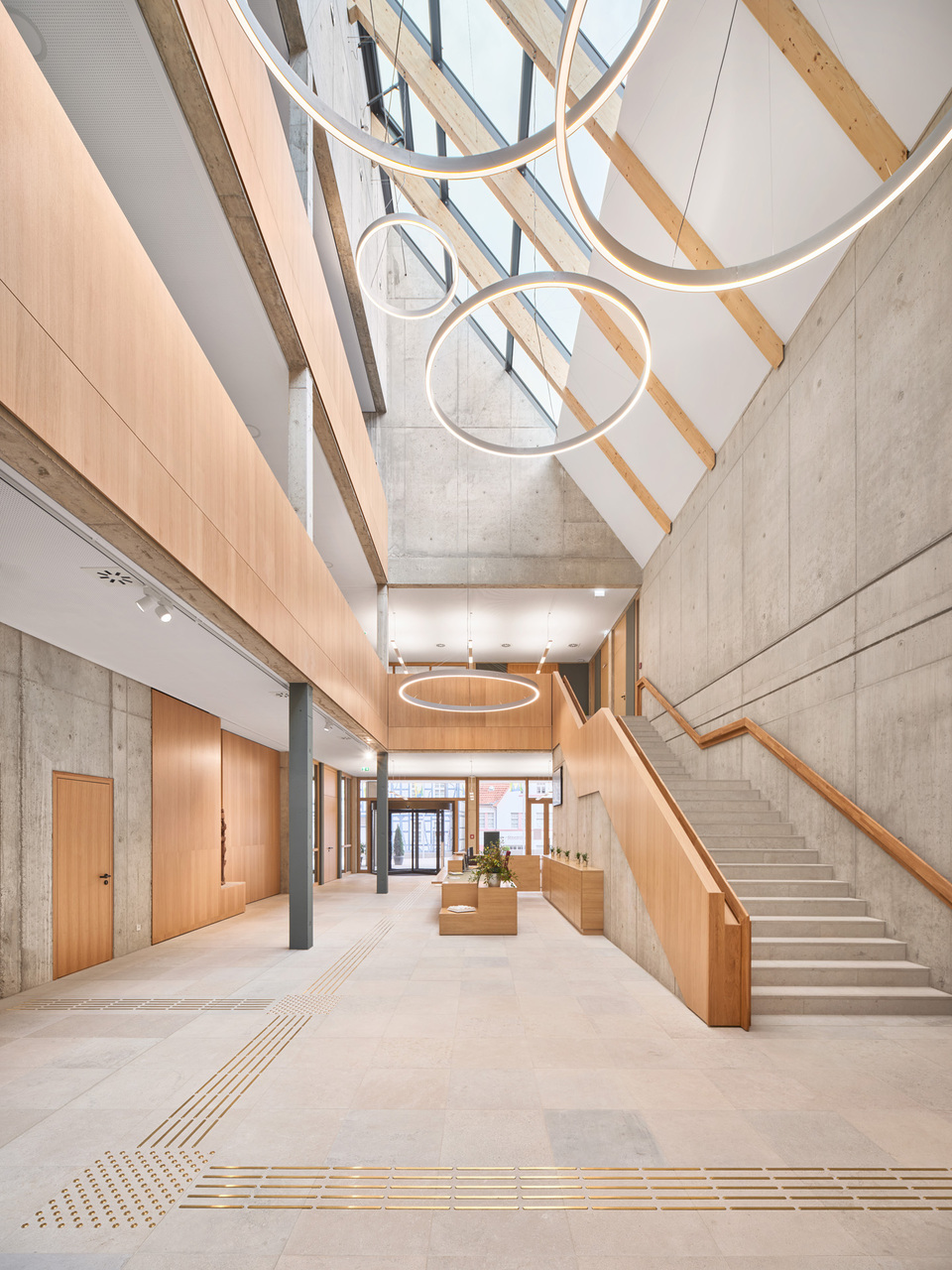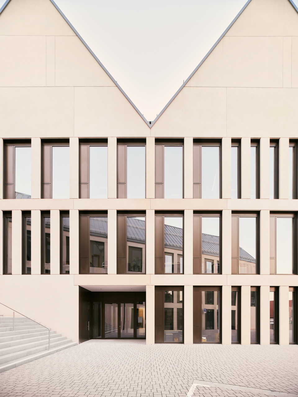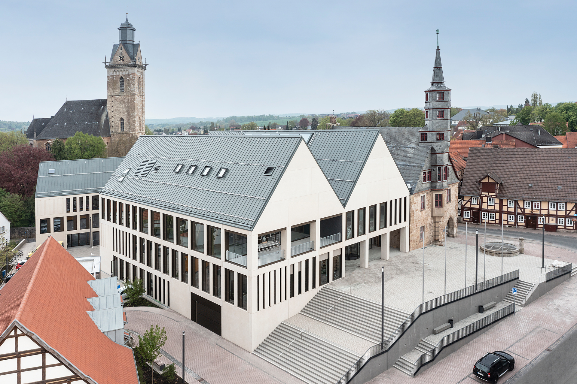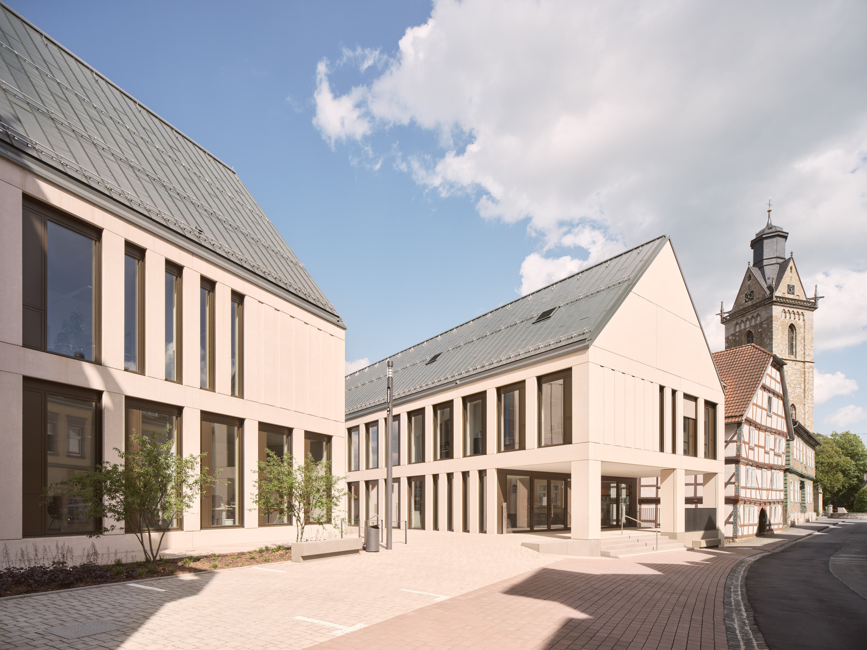 Der zweigiebelige Hauptbau und ein langgestreckter Nebentrakt lehnen sich in Maßstäblichkeit und Kubatur als neue Stadtbausteine im Sinne eine quartiersbezogenen Stadtreparatur an den Bestand an und bilden mit Rathausplatz und glasüberdachtem Bürgerforum eine kommunikative Mitte. Eine gemeinsame Materialität, die ebenfalls dem Kontext entlehnt ist, unterstreicht den inhaltlichen Zusammenhang.