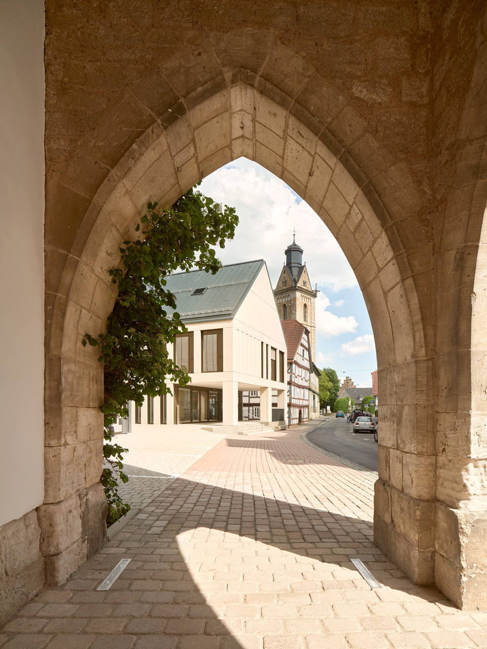 Der Gebäudeentwurf konzentriert sich auf die identitätsstiftende Funktion der historischen Substanz und schreibt mit seiner Giebelhaus-Architektur den gewachsenen mittelalterlichen Stadtgrundriss in der örtlichen „Körnung“ wie selbstverständlich fort.