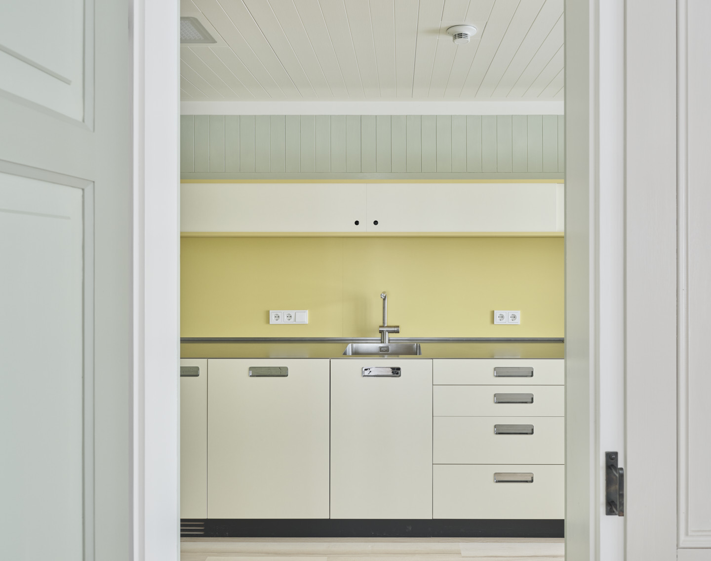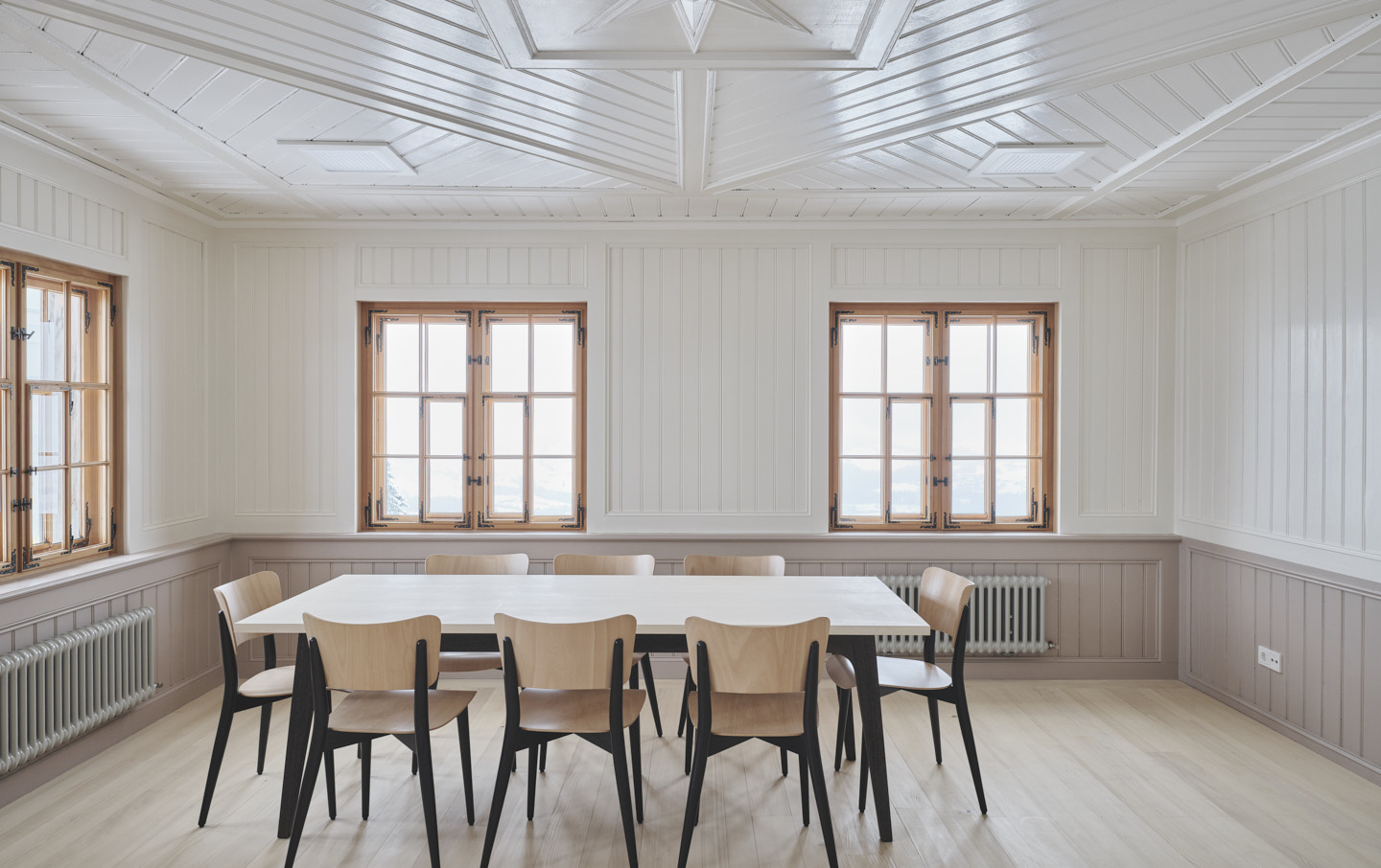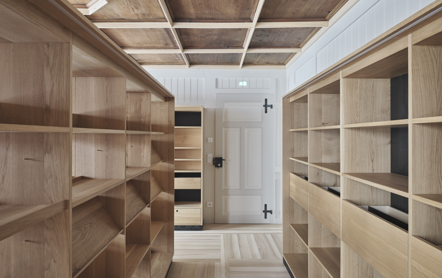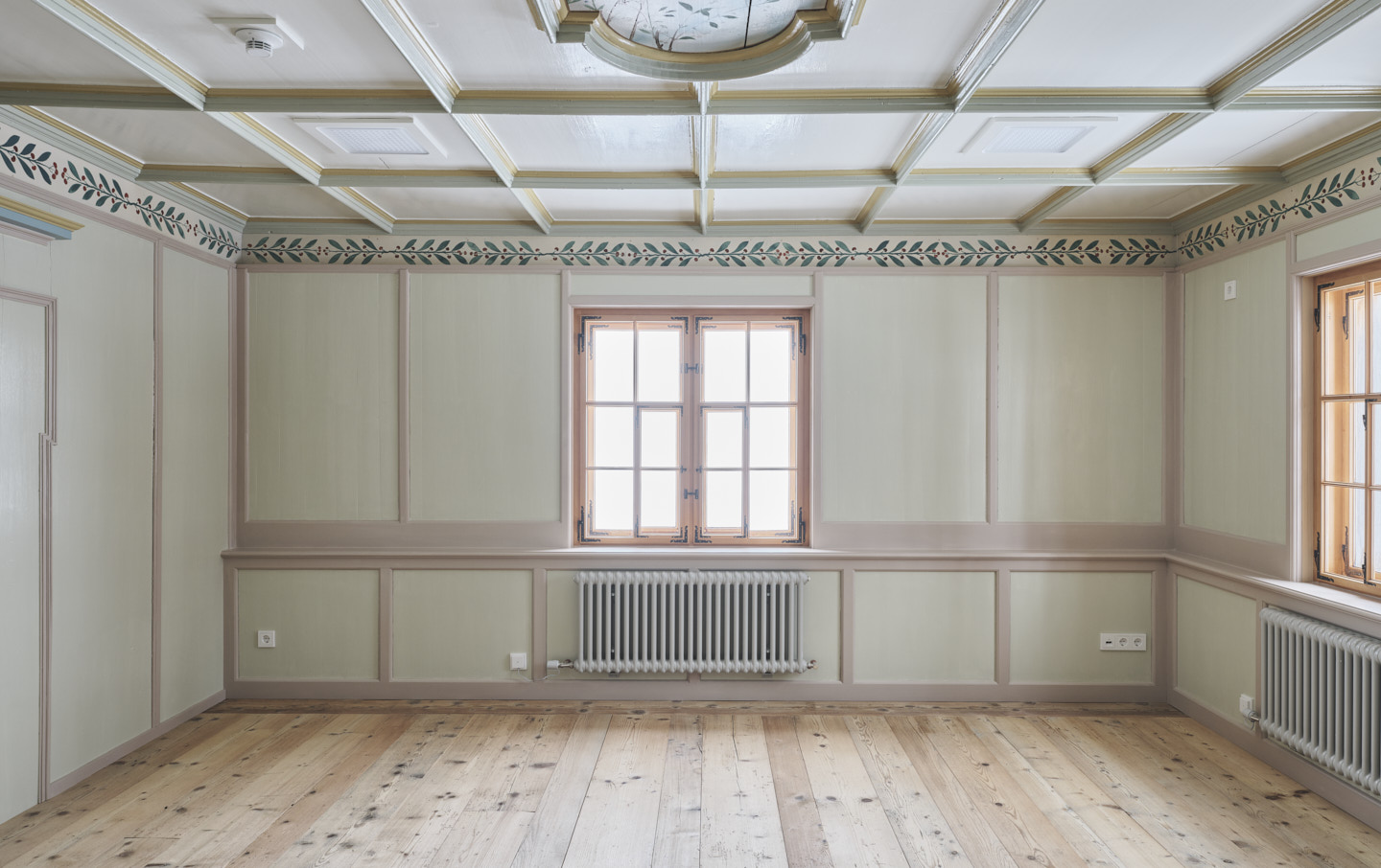 Im Erdgeschoss befindet sich nun die öffentliche Bücherei mit ihren 4300 Büchern, eine Art gute Stube für Vereine und das ganze Dorf, im ersten Stock sind das Pfarrbüro und ein Co-Working-Space. Architekt Gerhard Gruber griff so behutsam wie gewissenhaft in den denkmalgeschützten Bestand ein. Auch Sanierung und Umbau durfte ihre Zeit brauchen. Jeder Raum hat seine eigene Farbigkeit, mit Hingabe wandten sich die Handwerker den Holzkassettendecken, Dielen und dem verputzten Mauerwerk zu. Alle neuen Möbel sind in hellen Pastelltönen gehalten und auf die historische Farbpalette abgestimmt.