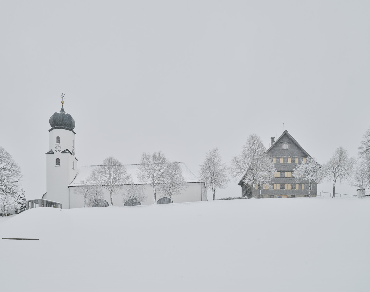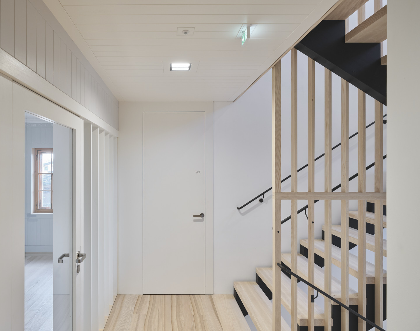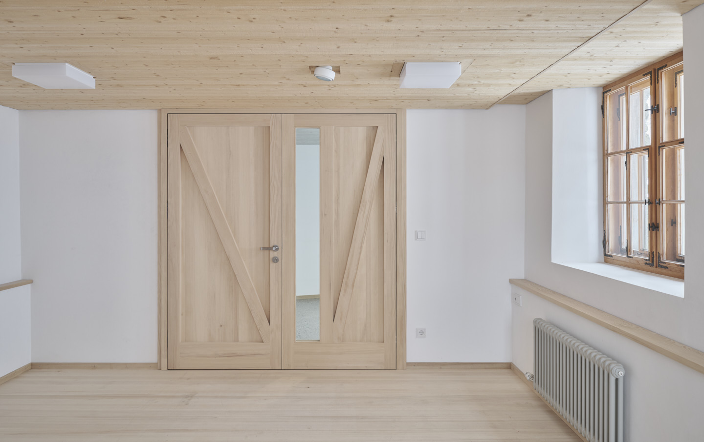 Eine Rampe am Eingang und die sehr schlichte, leichtfüßige, moderne Podesttreppe aus Eichenholz mit Lift und Sanitärräumen sorgen für eine großzügige, barrierefreie Erschließung und ein durchgehendes Foyer. Dadurch ist das Pfarrhaus vom Eingang im Nordosten – bei der Straße und dem Vorplatz der Kirche – bis nach Südosten – dem Platz mit Marienlinde und Lorenzisaal – durchgängig. Er wird so auch zu einer Verbindung zwischen Sakralraum und Gemeindeleben. Pfarrbüro, öffentliche Bücherei, dörflicher Treffpunkt und Vereinsräume werden dem Haus in Zukunft seine Bedeutung für das Dorf wieder zurückgeben. Die Bestimmung des Dachbodens ist noch offen. Auch seiner Sanierung wird die Zeit zugestanden, die es braucht, die passende Nutzung zu finden. (Text: Isabella Marboe)