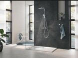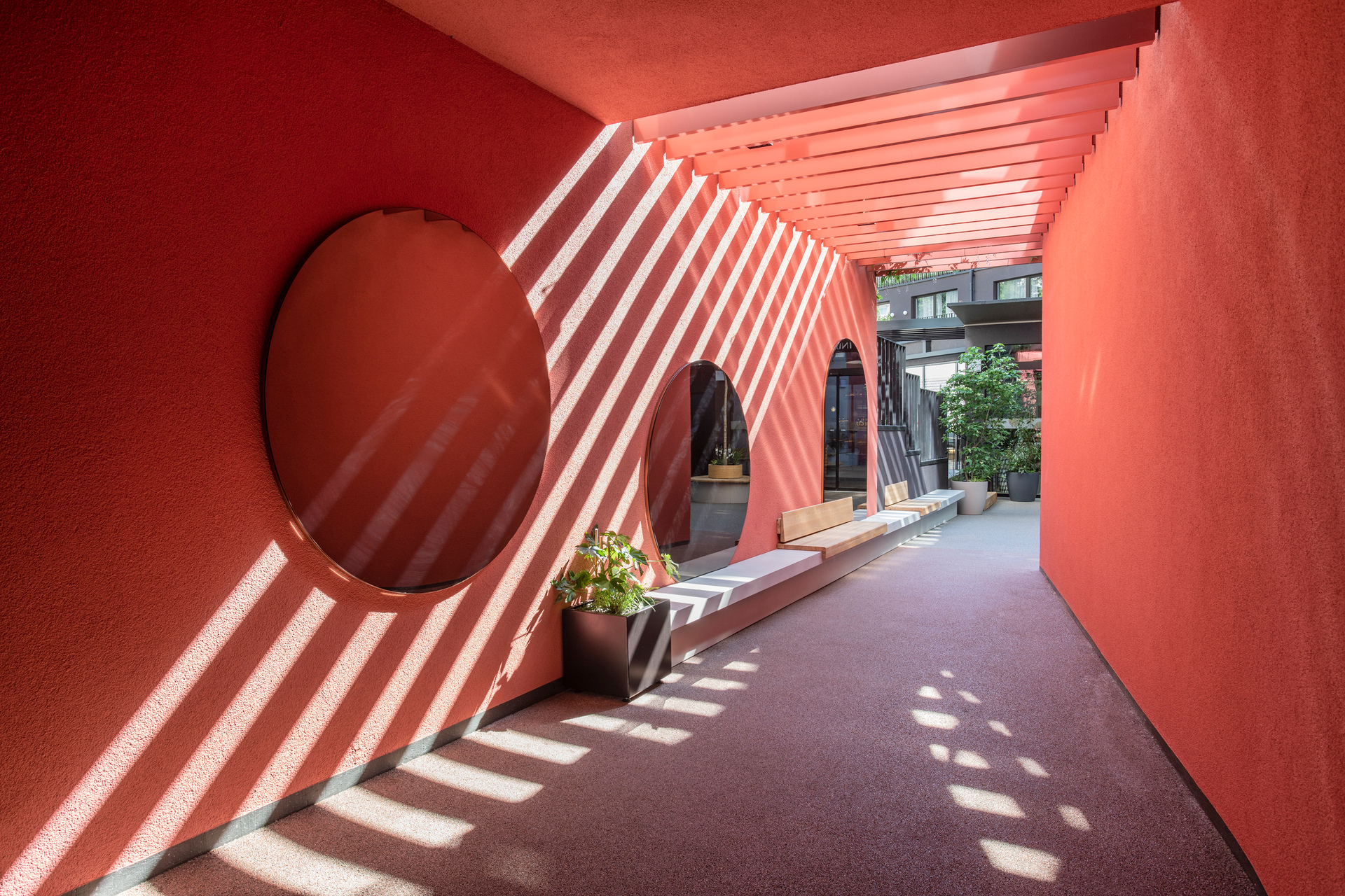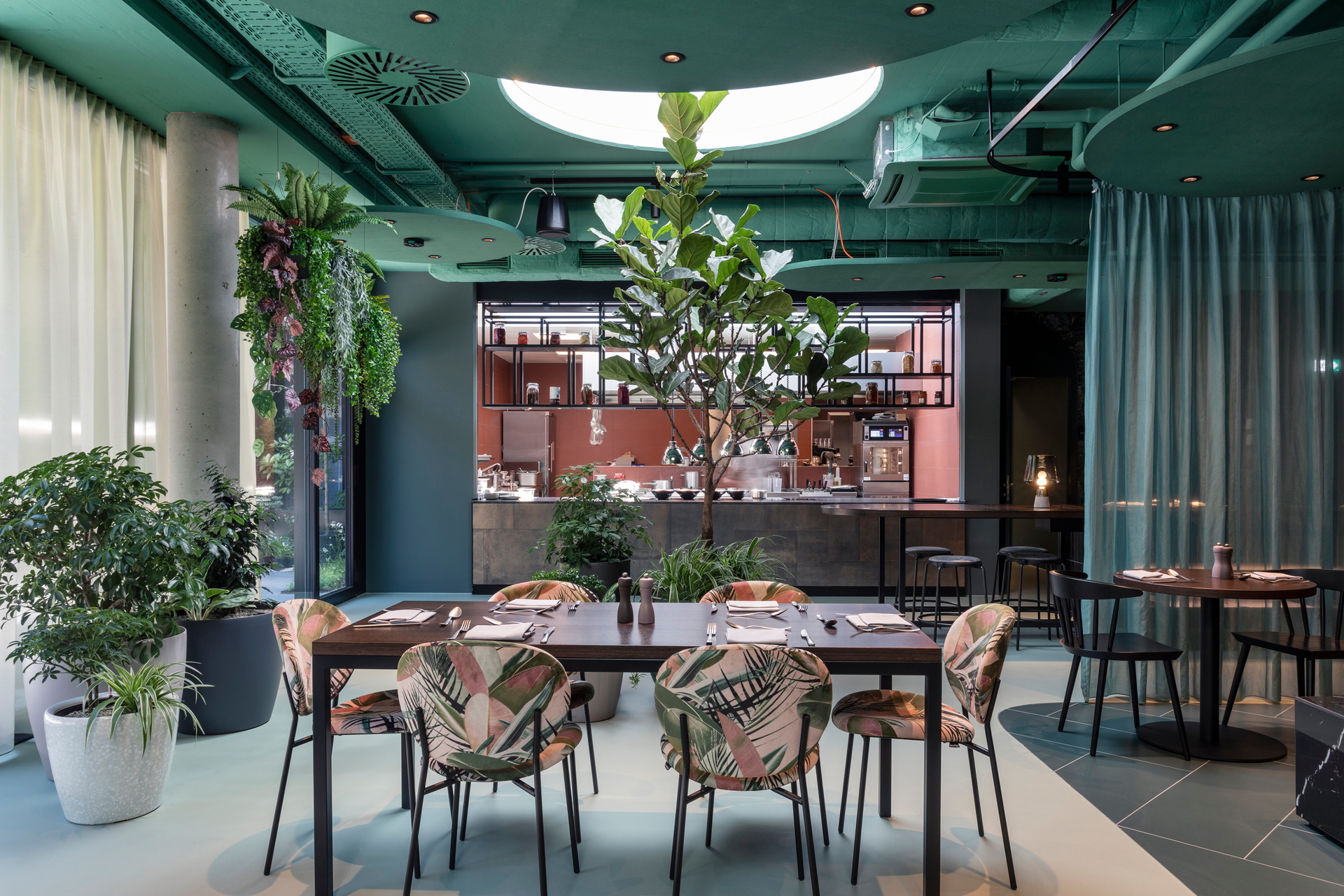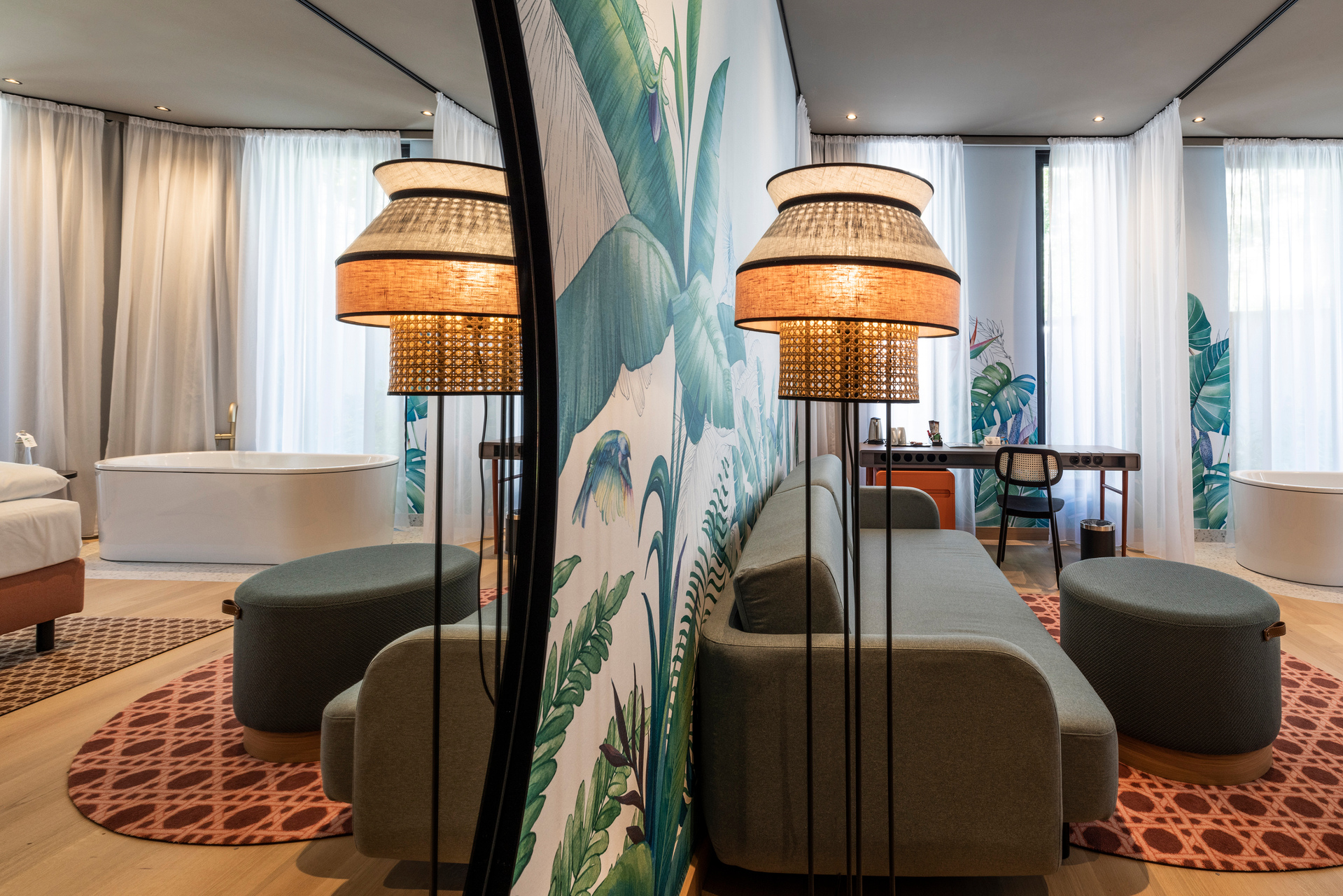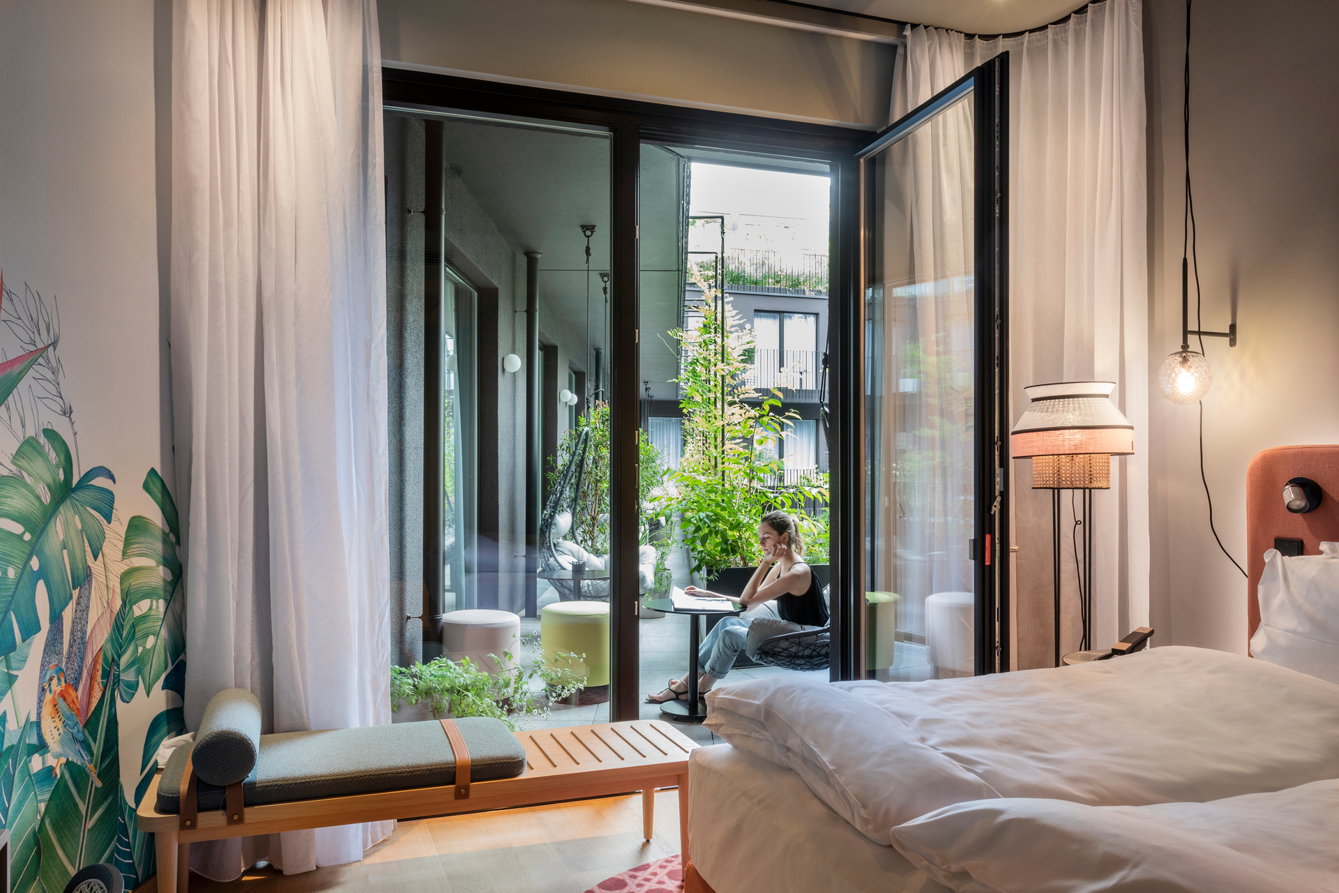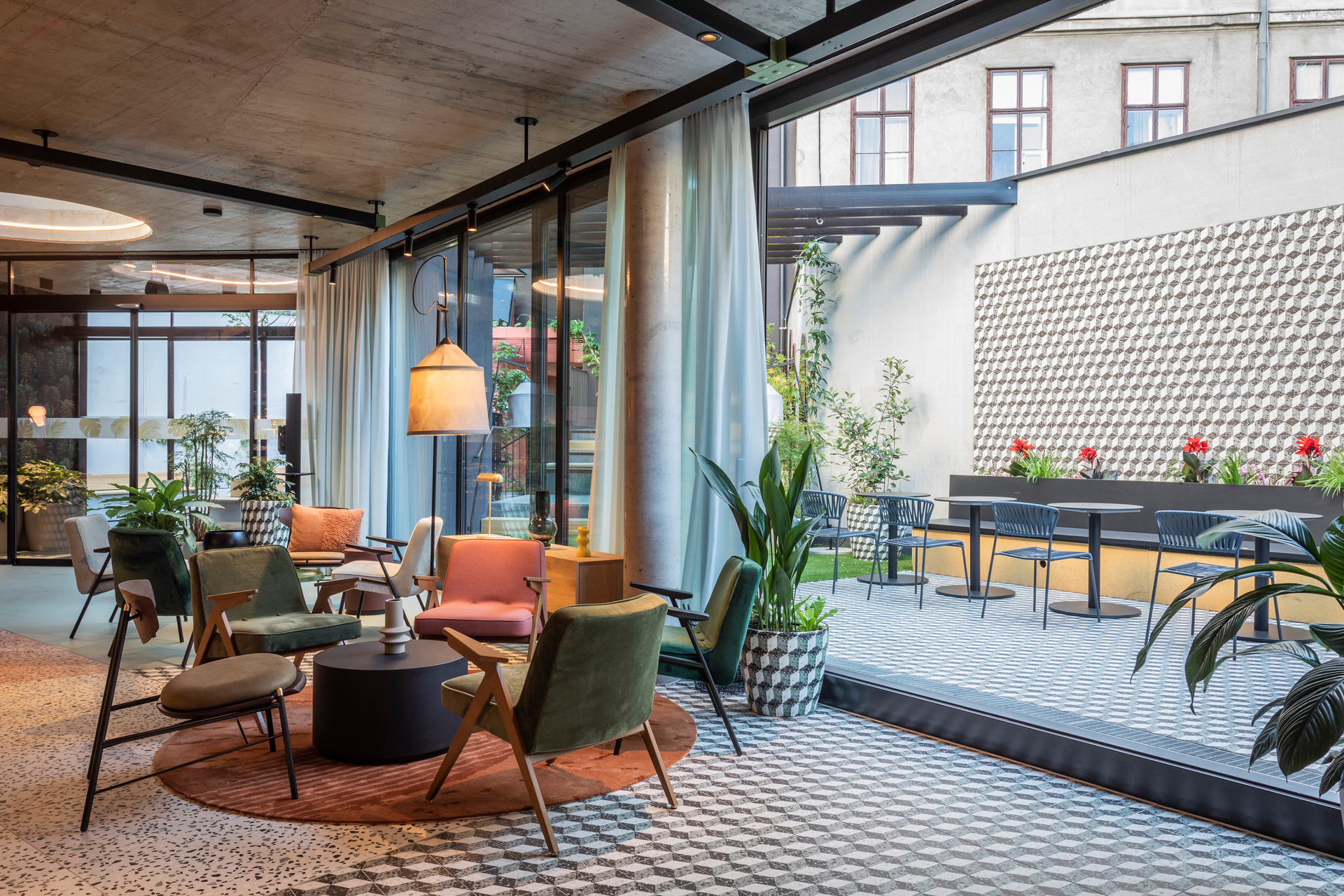 In der Lobby schaffen unterschiedliche Bodenbeläge und Teppiche einzelne Zonen und Stimmungen, etwa der rote Terrazzo-Boden aus Feinsteinzeug, der den Bar-Bereich vom restlichen Raum abtrennt. Ausladende Fensterfronten bilden einen Wintergarten und lassen sich in der warmen Jahreszeit zum Gartenhof hin öffnen.