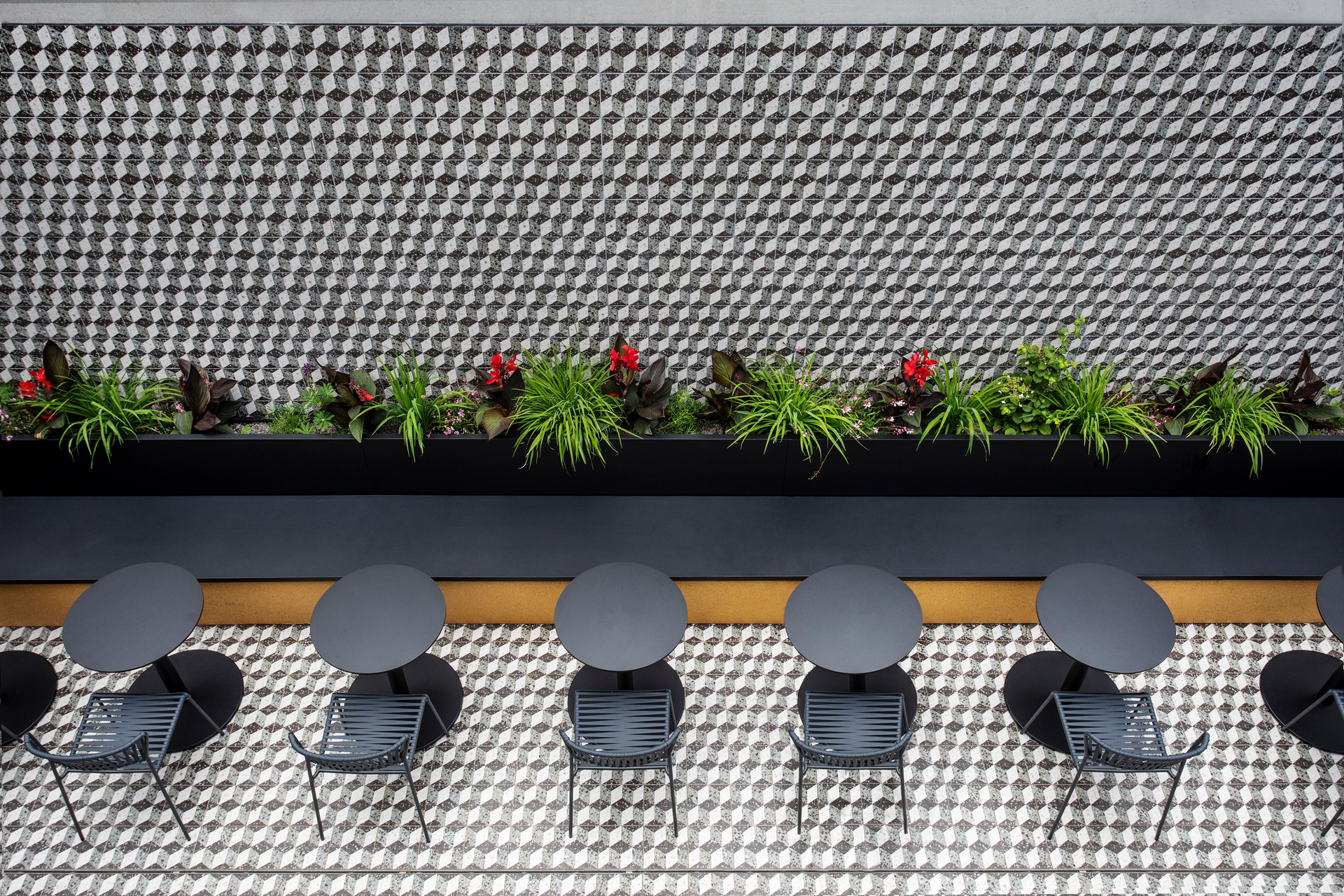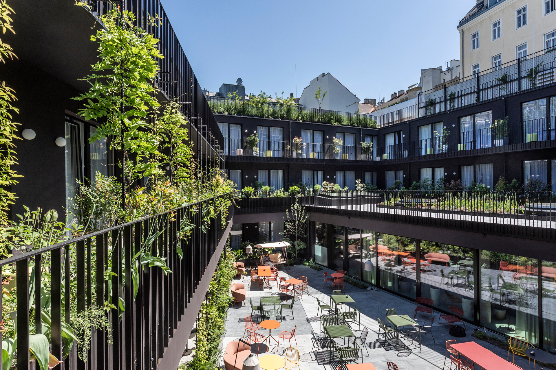 Subtile Anklänge an die typische Wiener Bautradition leisten die Eingliederung in das historische Umfeld und den von der britischen Boutique-Hotelkette IHG geforderten deutlichen Wienbezug: Der mit 185 m² größte, üppig begrünte Innenhof ist nach Art der wientypischen Pawlatschen (umlaufende Laubengänge in einem Innenhof) gestaltet und ringförmig von einem Großteil der Zimmer umlagert. Die von den Balkonen hängenden Schlingpflanzen bieten als eine Art grüner Vorhang Blickschutz und schaffen Privatsphäre. Das gesamte Atrium bildet auf mehreren Ebenen eine grüne Oase mit großflächigen Ruhezonen vor den nach oben hin zurückspringenden Geschossen – vom geräumigen Freibereich im Untergeschoss mit direkter Anbindung an Restaurant und Konferenzbereich, über das Erdgeschoss als zentralem Treffpunkt bis zum großzügig gestalteten Dachgarten mit Blick auf den im Blockinnern angrenzenden Trainingspark.