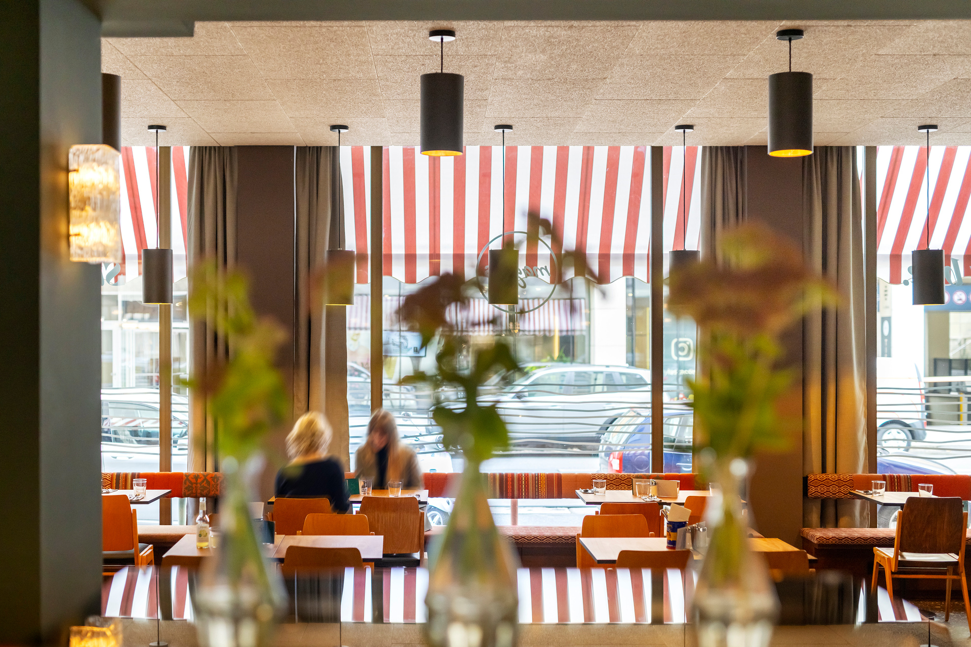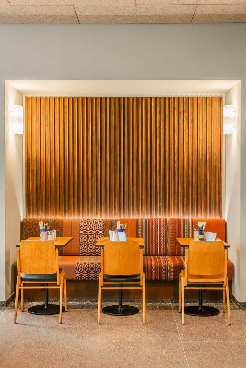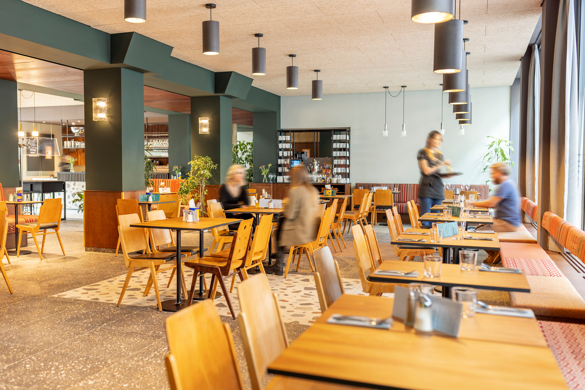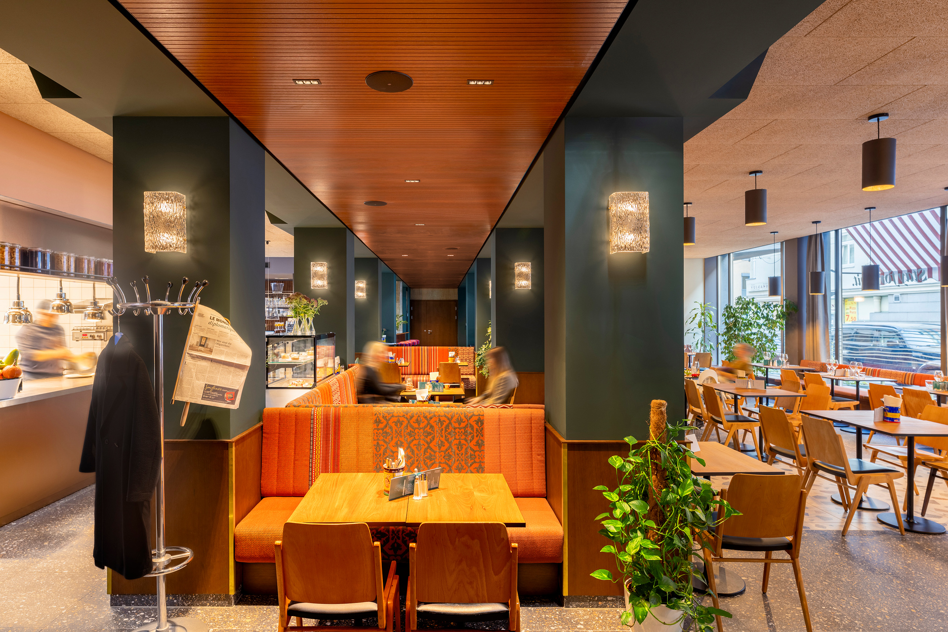 Die Architekten achteten darauf, den Stil des Hauses aus den späten 1950er Jahren, die gleichermaßen zurückhaltende wie elegante Architektur der damaligen Zeit weitestgehend zu erhalten. Der schwarz-grüne Steinboden im Eingangsbereich wurde ebenso bewahrt wie das geschwungene Empfangspult als Teil der neuen Bar, einige Möbel im Vintage-Stil und der sanierte Lift. Die Restauranteinrichtung reagiert auf die farblichen Vorgaben des Bestands mit dunklem Terrazzo-Boden und dunkelgrünen Pfeilern. Beim bunten Mix aus bereits vorhandenen Vintage-Möbeln und neuen Sitzbänken gehört die Wiederverwertung von Vorhandenem zum Prinzip. Zum ressourcenschonenden Vorgehen zählt die Reparatur alter Leuchten und die Übernahme von Stühlen aus dem Vorgänger-Hotel im Prater, aber auch die Weiternutzung der architektonisch bemerkenswerten Kapelle im 6. Obergeschoss für Taufen und Hochzeiten.