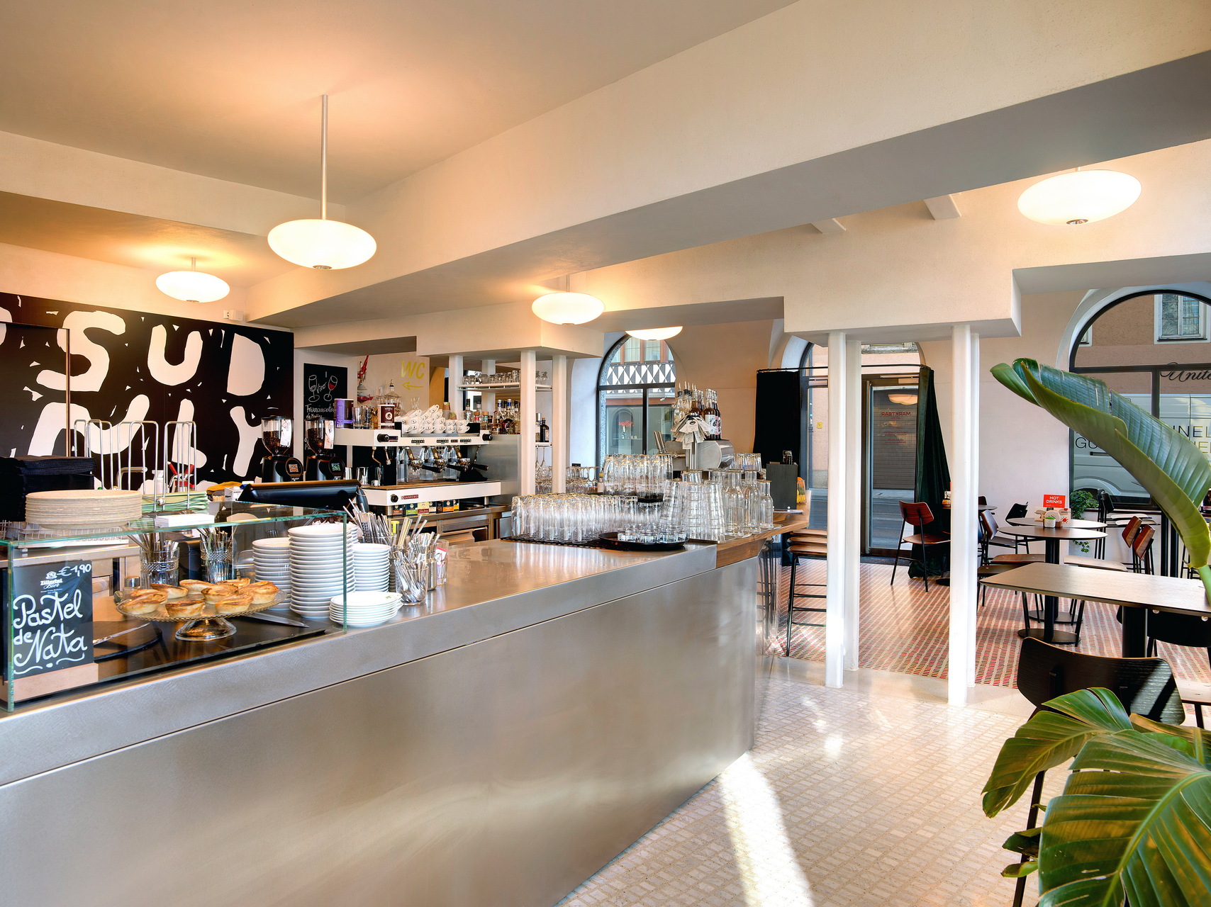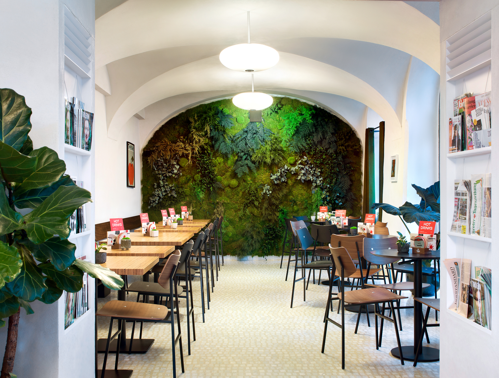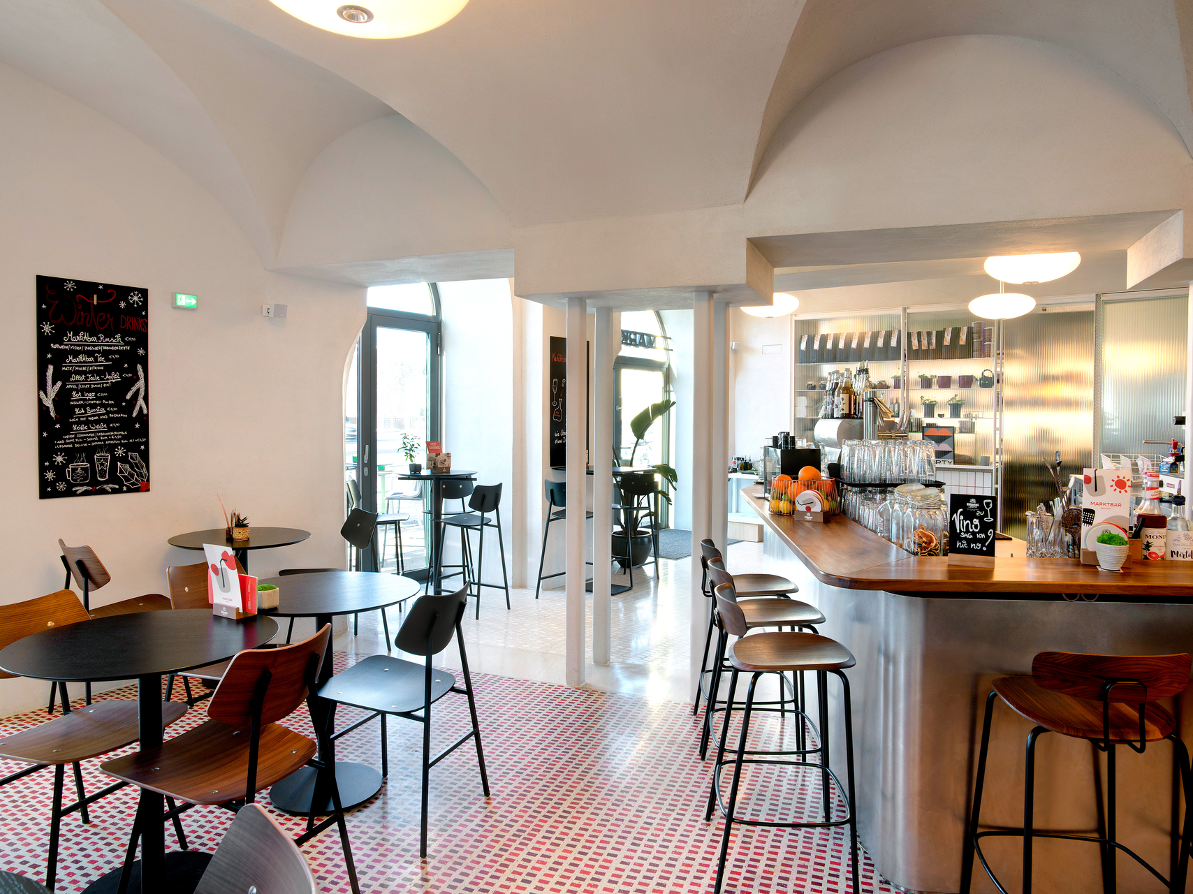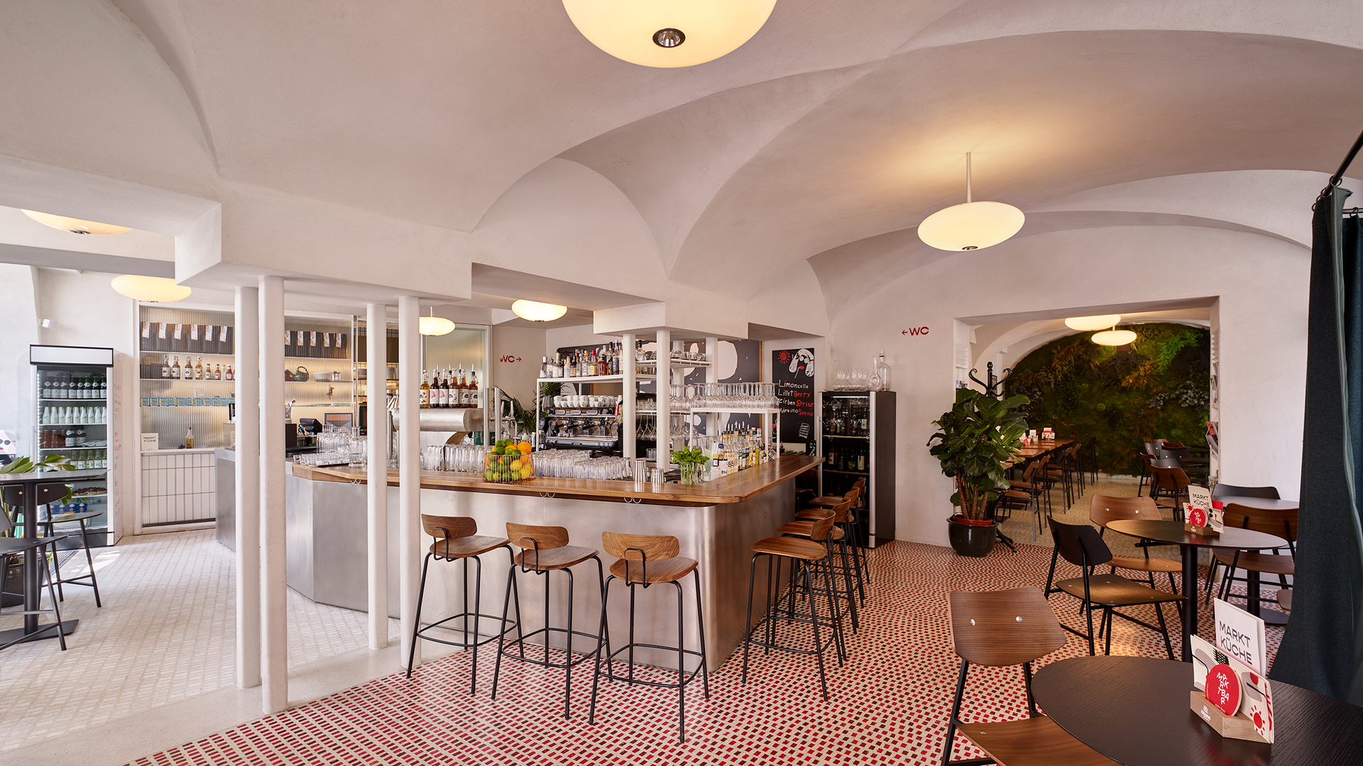 Das Gestaltungskonzept für die Marktbar orientiert sich vorwiegend am gastronomischen Konzept, das im Kontext der Markthalle vor allem auf ein Angebot kleiner, frischer Gerichte mit interessanten Produkten setzt. Dabei wurde ein pluralistischer Ansatz verfolgt, der assemblageartig verschiedenste Materialien, Formen, Farben und Muster verbindet. So wechselt die Bestandsdecke von einem Gewölbe in eine gerade Decke mit Unterzügen, das Barmöbel verbindet Edelstahl und Holz und der Terrazzo-Fußboden Stein und Glas. Das bewusst nieder gestaltete Barmöbel soll die Grenzen zwischen Gast und Gastgeber auflösen, neue Portale öffnen das Lokal zum davorliegenden Gastgarten und dem Marktplatz.