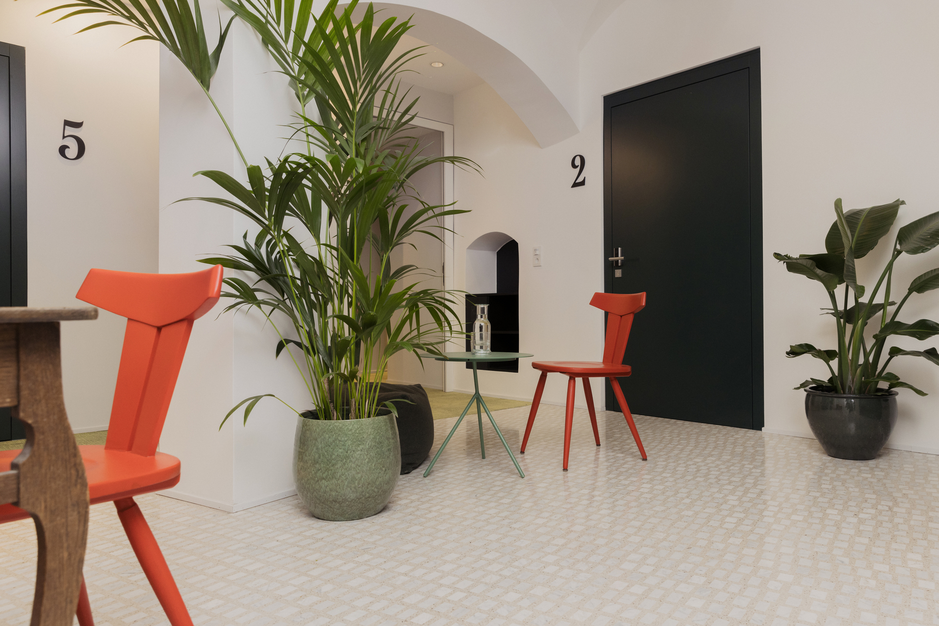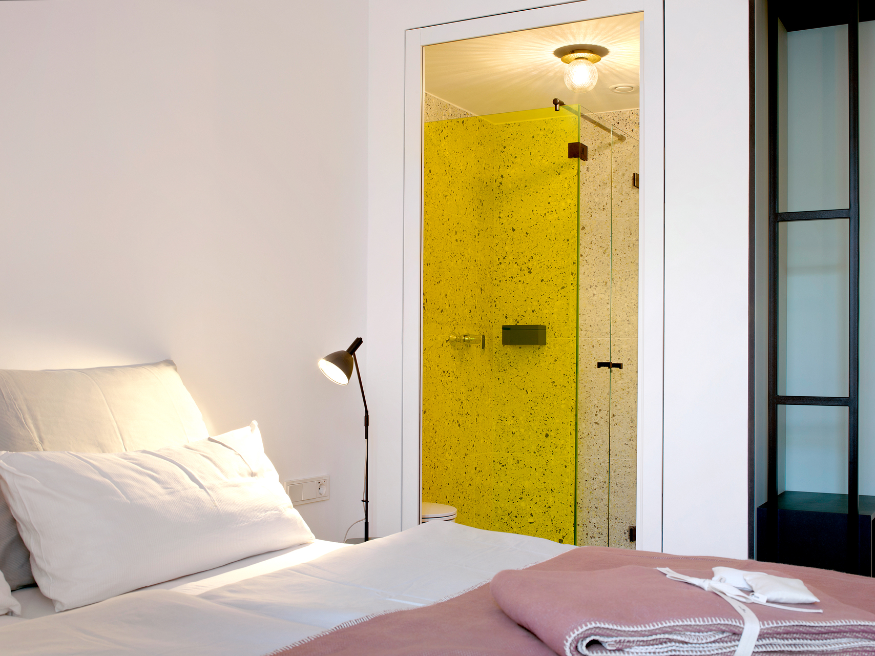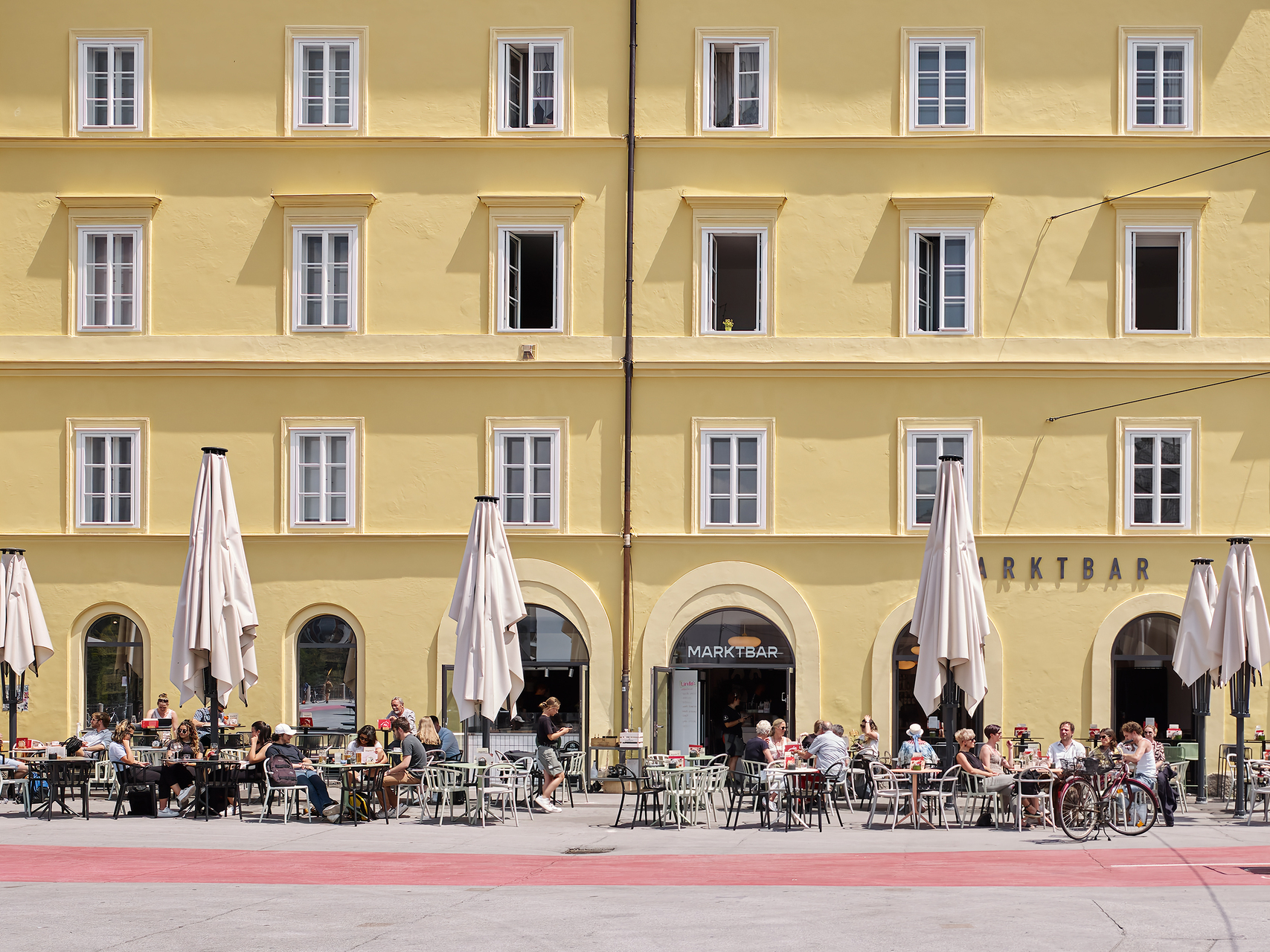 Die Gestaltung der zugehörigen Hotelzimmer – der Marktbar-Studios - entspricht dem Entwurfskonzept der Marktbar und übersetzt dieses in eine privatere Situation. Die Studios sind zwar im Standard eines Boutique Hotels ausgestattet, bieten aber bewusst die Qualität einer Altbauwohnung. (Text: Architekt:innen, bearbeitet)