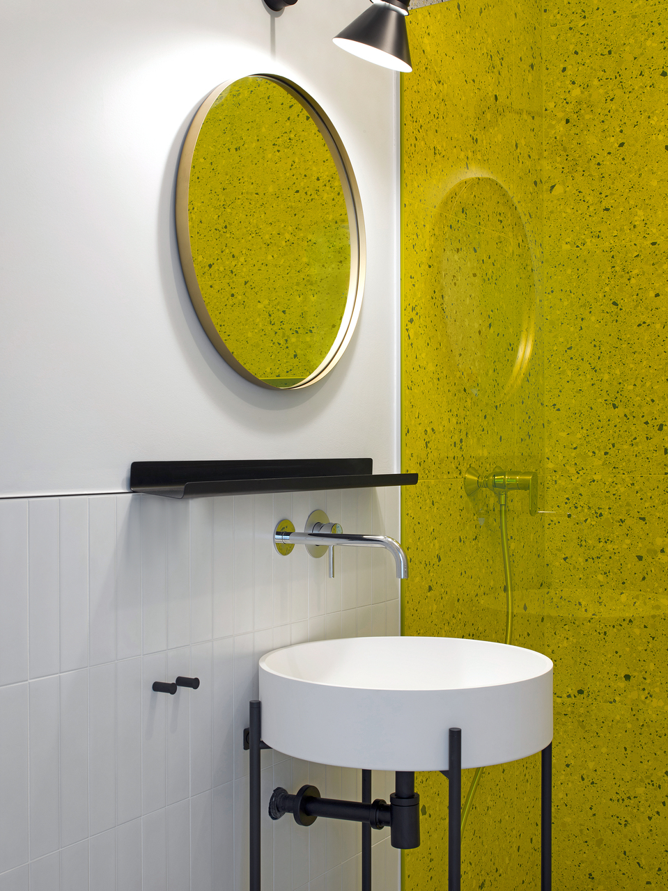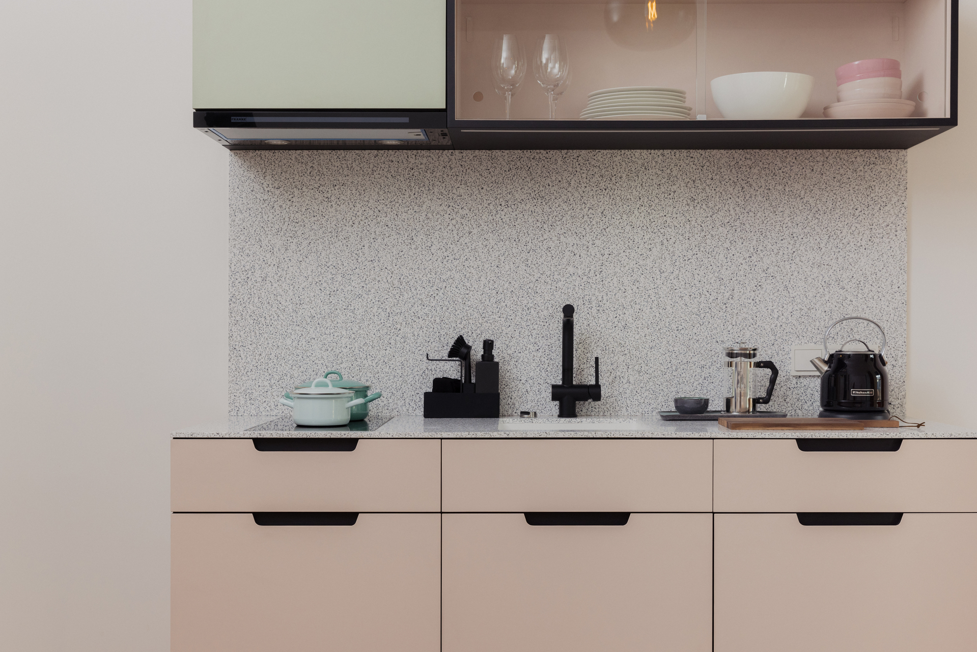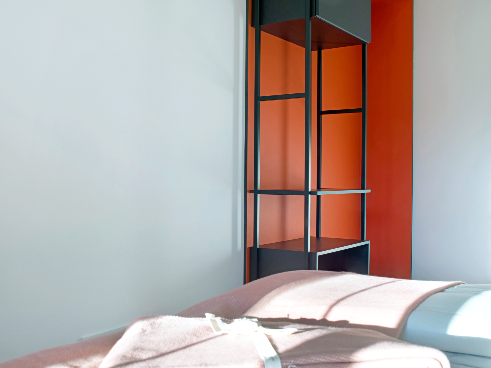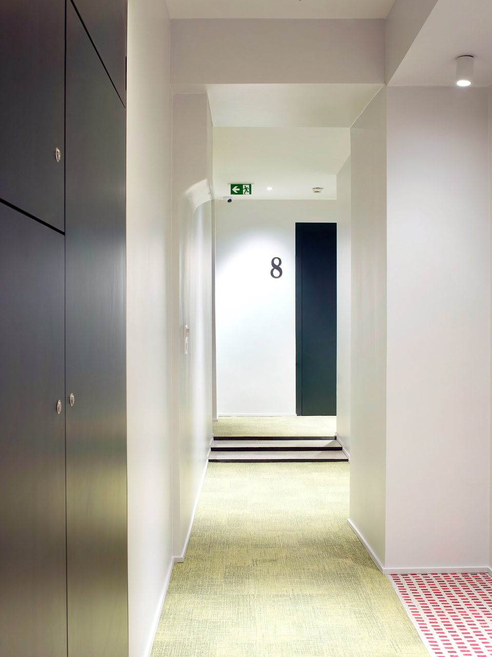 Die Gestaltung der zugehörigen Hotelzimmer – der Marktbar-Studios - entspricht dem Entwurfskonzept der Marktbar und übersetzt dieses in eine privatere Situation. Die Studios sind zwar im Standard eines Boutique Hotels ausgestattet, bieten aber bewusst die Qualität einer Altbauwohnung. (Text: Architekt:innen, bearbeitet)