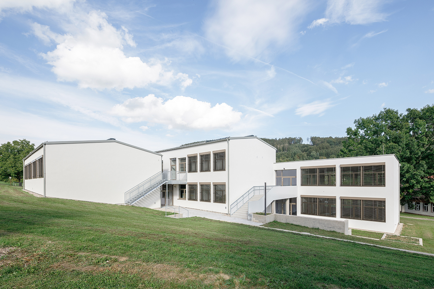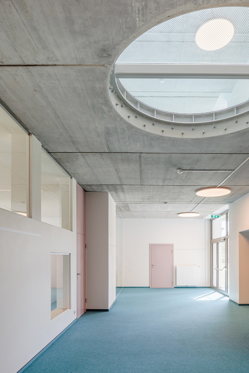 Die bestehenden Holz-Glas-Oberlichten wurden erneuert und teilweise vergrößert, die Betonflächen gereinigt und sandgestrahlt, der Boden mit einem neuen Teppich in verschiedenen Farben belegt und die Innentüren farbig gestaltet. Das vor einiger Zeit aufgesetzte Satteldach, das die Oberlichten für die Aula- und Pausenbereiche überdeckte, wurde abgetragen, das Fensterband wieder geöffnet. In Dach und Gangbereich wurden zusätzliche Fenster eingeschnitten, um das originäre Konzept einer „Architektur aus Licht“ zu stärken. (Text: Tobias Hagleitner, nach einem Text der Architekten)