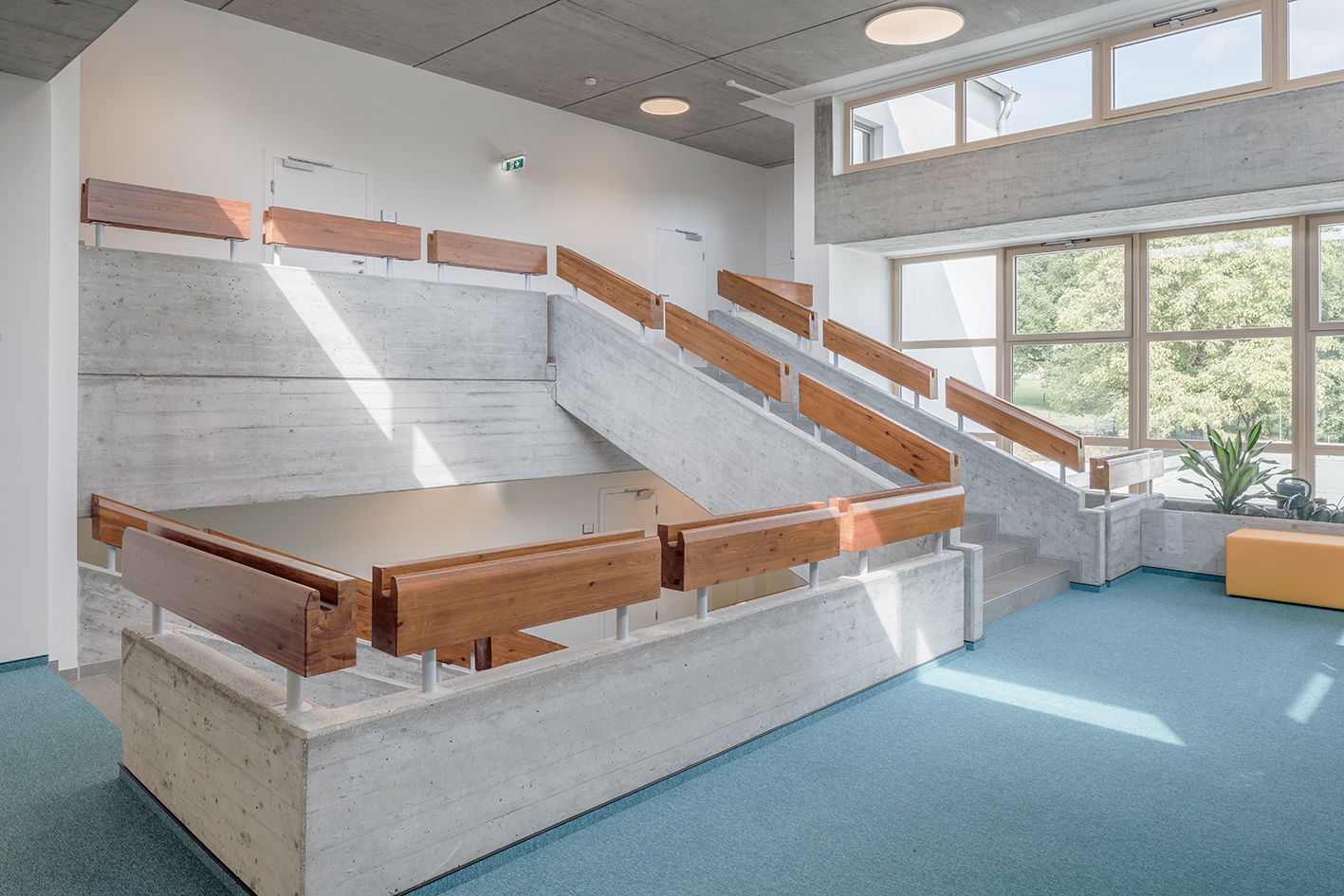 Über die Jahrzehnte war das ursprüngliche Projekt allerdings durch mehrere Eingriffe überformt und verändert worden, was nicht nur das Erscheinungsbild des Schulbaus, auch die räumlichen Qualitäten im Inneren, vor allem die Belichtung, beeinträchtigte. Tp3 Architekten machten es sich bei der Sanierung zur Aufgabe, das verborgene architektonische Kleinod wieder freizuschälen, seine Qualitäten zu stärken und zu erneuern. Das harmonisch inszenierte Spiel aus Licht, Holz, Glas, Beton und Teppichböden sollte wieder erfahrbar werden.