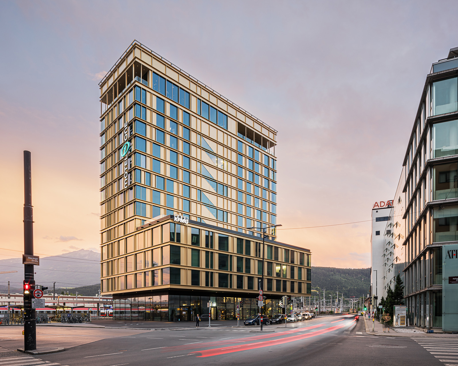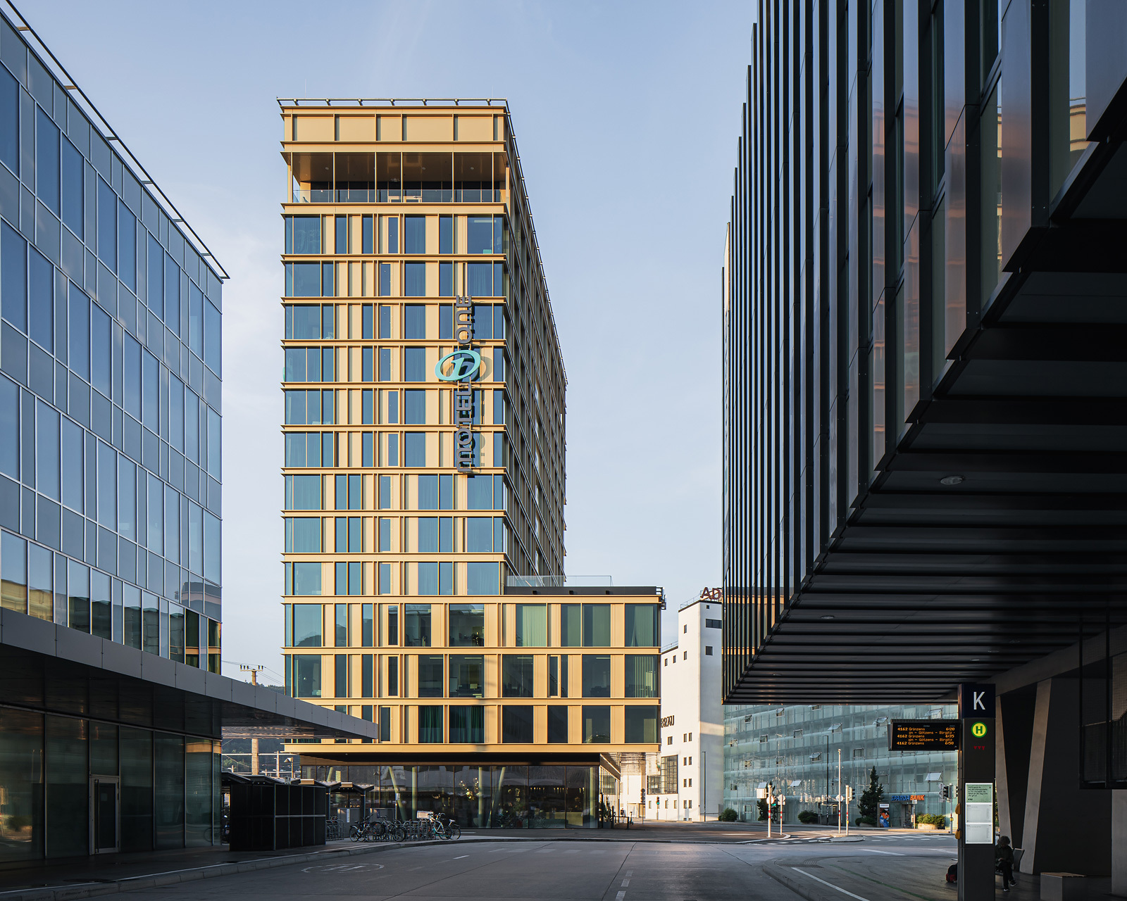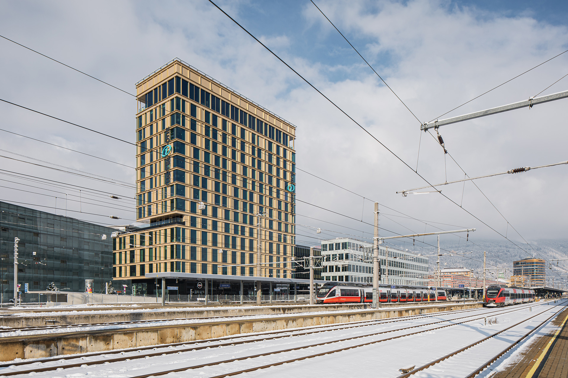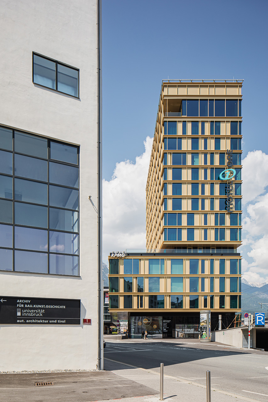 Das 48 m hohe Hotel- und Bürogebäude setzt sich aus einem überhohen Erdgeschoß, einem dreigeschoßigen Sockelbaukörper und einer zehngeschoßigen, schlanken Scheibe zusammen, die die Höhe maximal ausnutzt. Diese Gliederung der Baumasse erfolgte in Korrespondenz mit den umgebenden Niveaus, womit die Nachbargebäude einen Rahmen erhalten und spannende stadträumliche Zusammenhänge entstehen konnten. So setzt sich die Erdgeschoßzone des Bahnhofsplatzes mit seinen Vordächern im Erdgeschoß fort, das an allen zur Stadt gewandten Seiten fast vollflächig verglast ist. Der südliche Grundstückteil wurde bewusst freigehalten, um das Adambräu in seiner stadtraumprägenden Wirkung möglichst wenig zu beeinträchtigen.