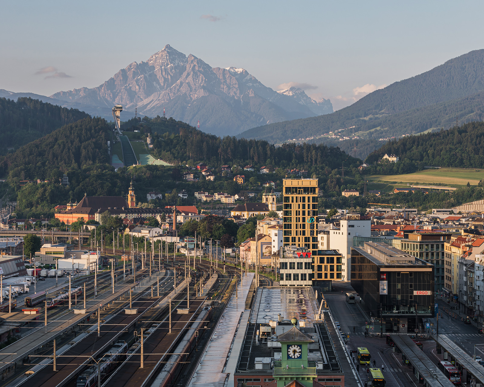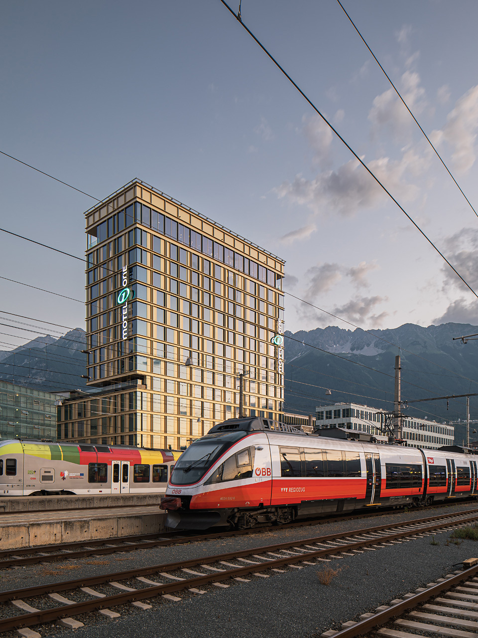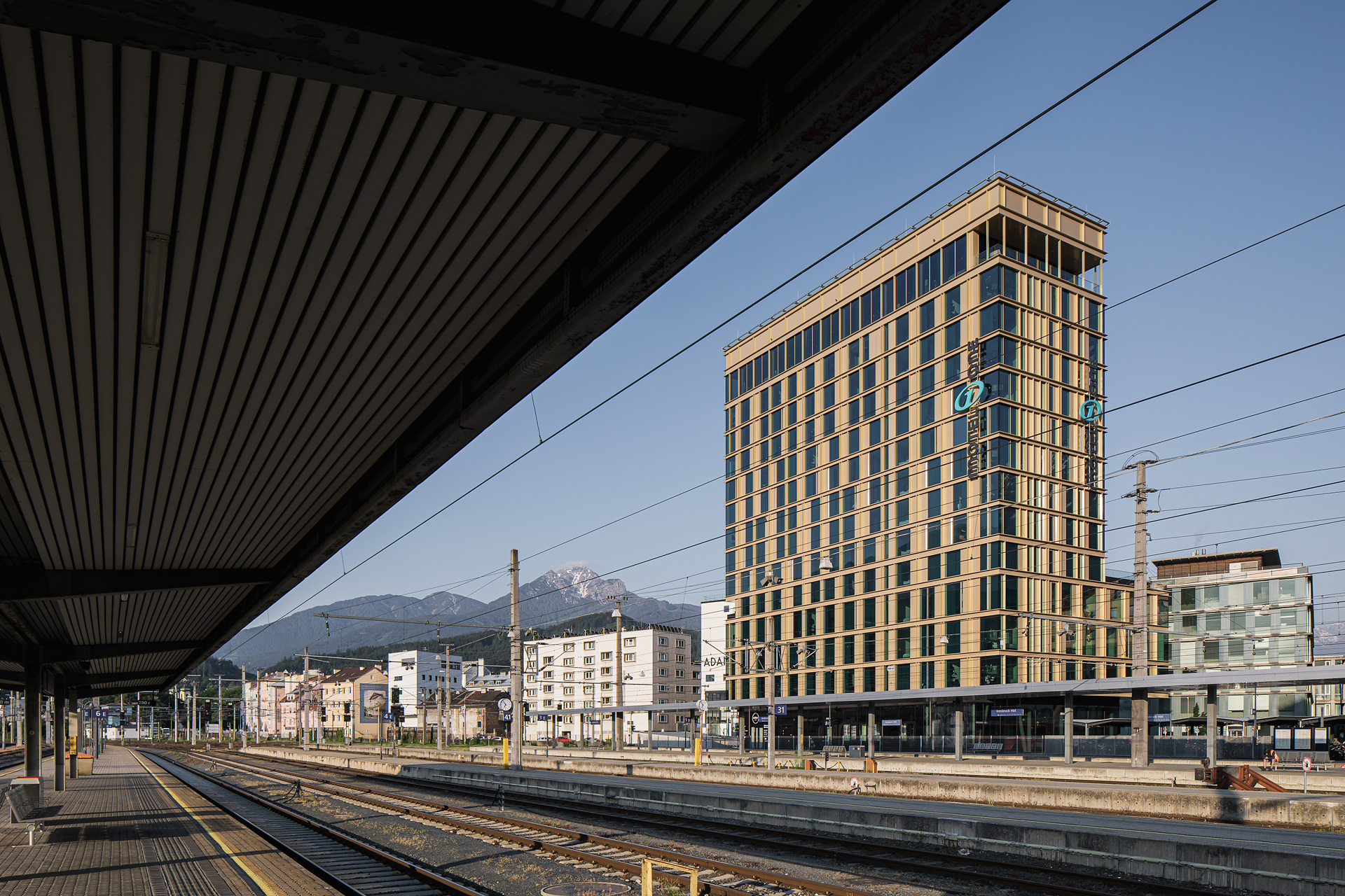 Das 48 m hohe Hotel- und Bürogebäude setzt sich aus einem überhohen Erdgeschoß, einem dreigeschoßigen Sockelbaukörper und einer zehngeschoßigen, schlanken Scheibe zusammen, die die Höhe maximal ausnutzt. Diese Gliederung der Baumasse erfolgte in Korrespondenz mit den umgebenden Niveaus, womit die Nachbargebäude einen Rahmen erhalten und spannende stadträumliche Zusammenhänge entstehen konnten. So setzt sich die Erdgeschoßzone des Bahnhofsplatzes mit seinen Vordächern im Erdgeschoß fort, das an allen zur Stadt gewandten Seiten fast vollflächig verglast ist. Der südliche Grundstückteil wurde bewusst freigehalten, um das Adambräu in seiner stadtraumprägenden Wirkung möglichst wenig zu beeinträchtigen.