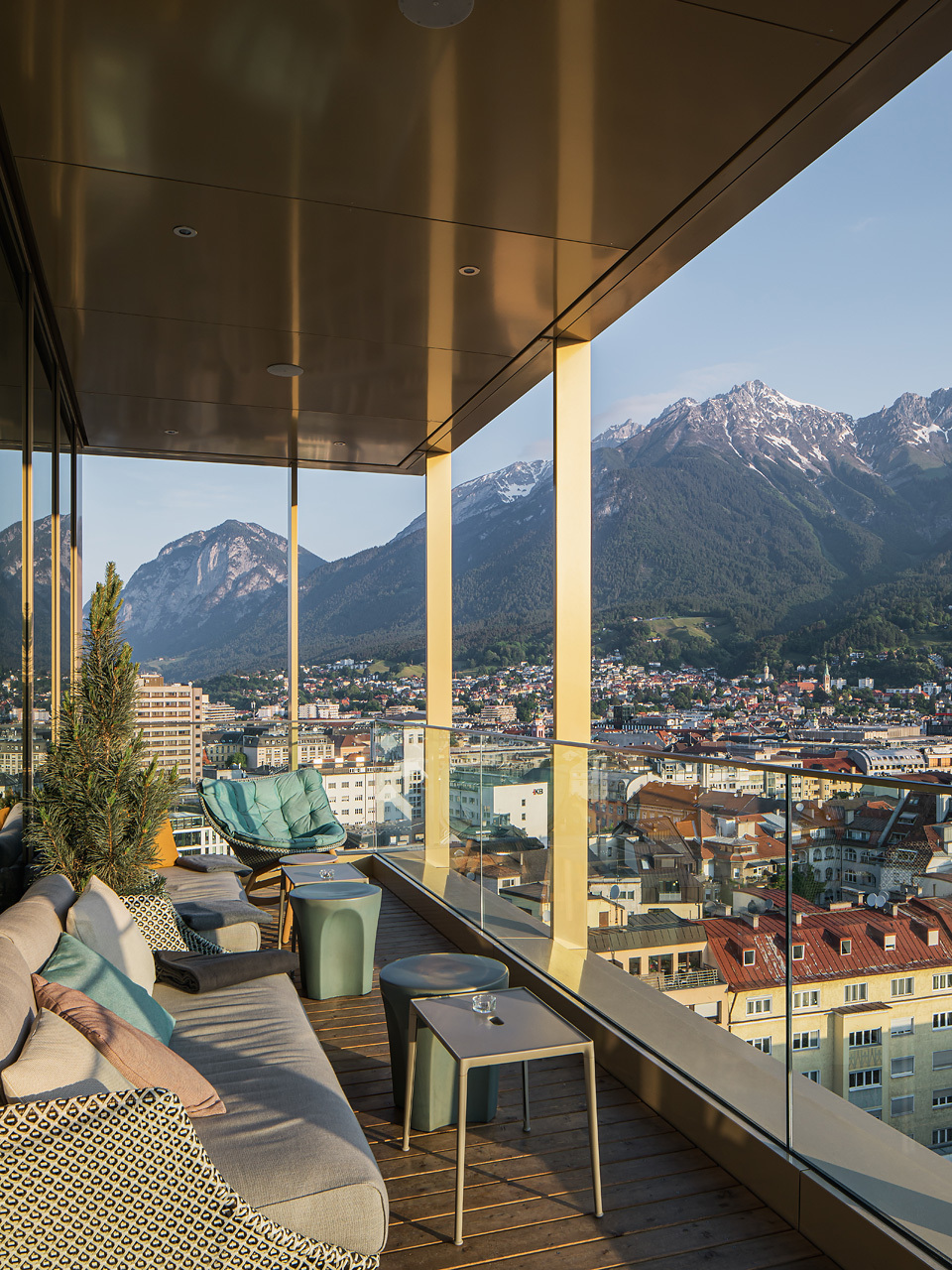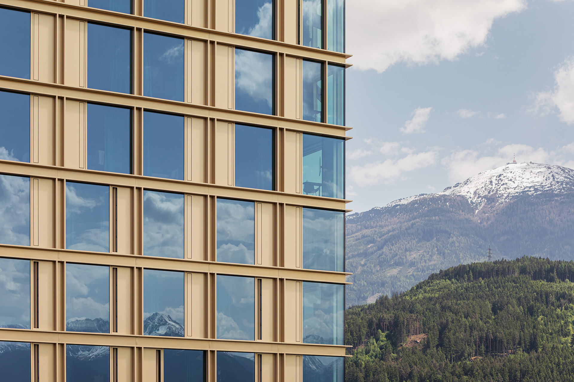 Im Erdgeschoß befindet sich zum einen der Verkaufsraum des Einrichtungsexperten reiter design, mit dessen Ausgestaltung die Architekten Michael Heinlein und Alois Zierl ebenfalls beauftragt wurden, zum anderen der Eingang zu dem im Turm untergebrachten Hotel der Kette Model One. Der darüber auskragende Sockelbaukörper dient in erster Linie der Büronutzung, ostseitig des aus zwei einläufigen, ineinander verzahnten Treppen und angrenzenden Aufzügen gebildeten Erschließungskerns liegen weitere Hotelzimmer. Das oberste Geschoß beinhaltet eine Sky-Bar mit zwei Terrassen und wurde entsprechend der rein gastronomischen Nutzung höher ausgebildet, womit der Turm einen abschließenden Kopfteil erhielt. Die Fassadengestaltung geschah mit dem Ziel, dem großen Volumen Leichtigkeit und Eleganz zu verleihen. Geschoßhohe Verglasungen alternieren mit Metallelementen und schmalen Lüftungsflügeln, die im Zusammenspiel mit den durchgängigen, geschoßtrennenden Lisenen dem Baukörper eine klare Struktur verleihen. (Text: Claudia Wedekind)