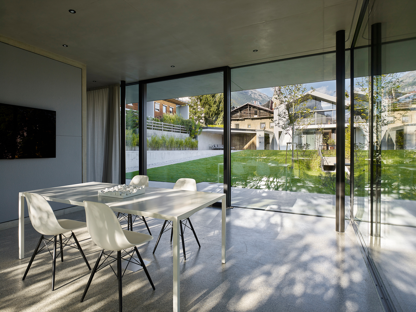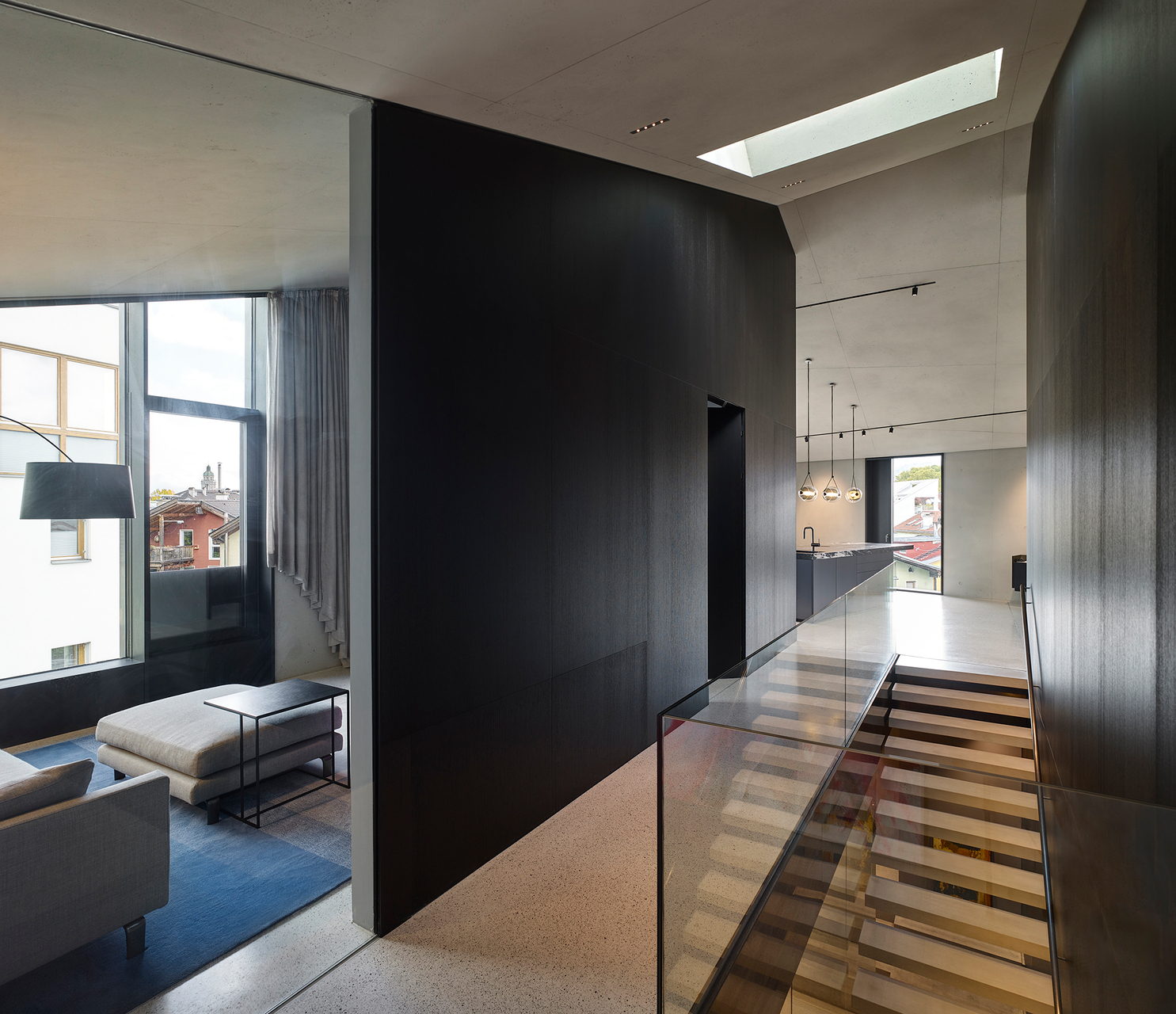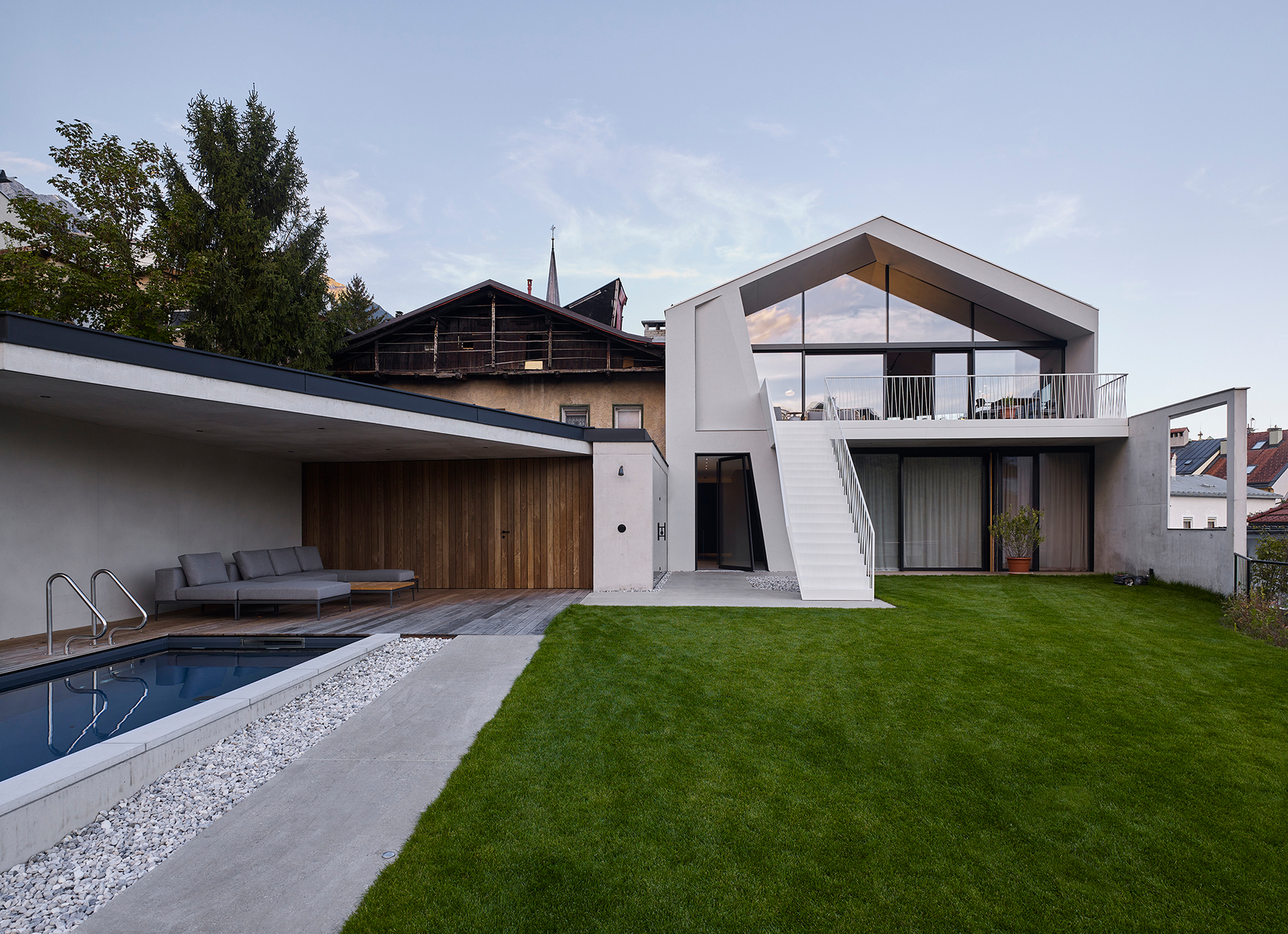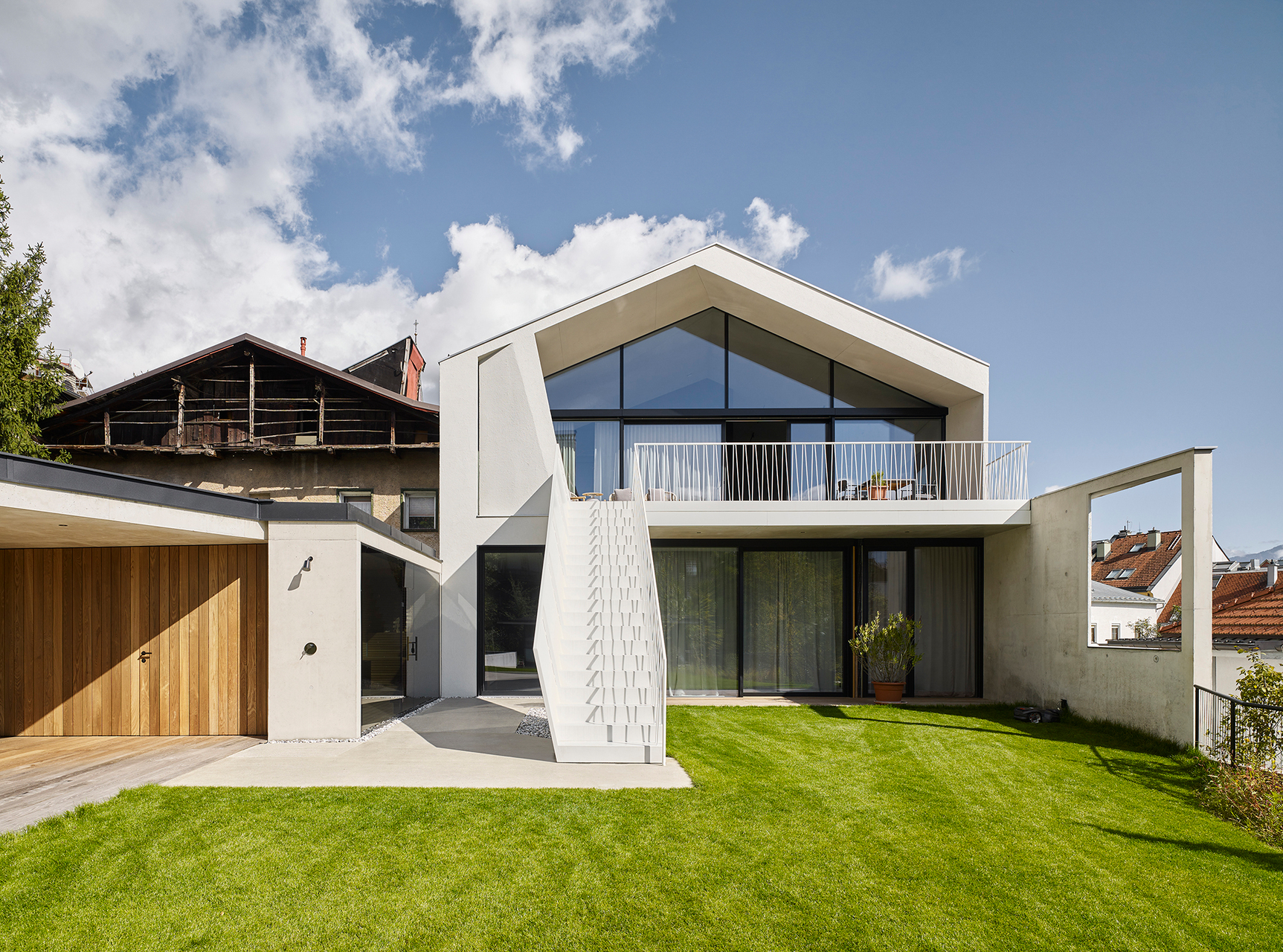 Das zu vier Seiten hin monolithisch ausformulierte Abschlussgebäude öffnet sich an seiner straßenabgewandten Seite zu den Gärten und Innenhöfen des historischen Stadtteils hin. Im Spannungsfeld zwischen dieser offenen Gebäudeseite und de, im Bestandshain errichteten, eingeschossigen Gartenhaus am Grundstücksende liegt ein großzügiger Garten mit Außenbereichen. (Text: Architekt:innen)