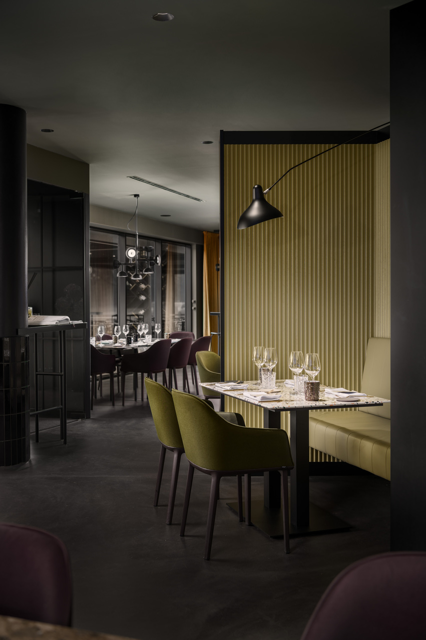 Die Kombination aus gepolsterten Stühlen und Tischplatten aus Stein erzeugt eine zeitlose Eleganz und sorgt für Komfort beim Essen und geselligen Beisammensein. Downlights und sorgfältig ausgewählte Leuchten bilden Lichtinseln.
