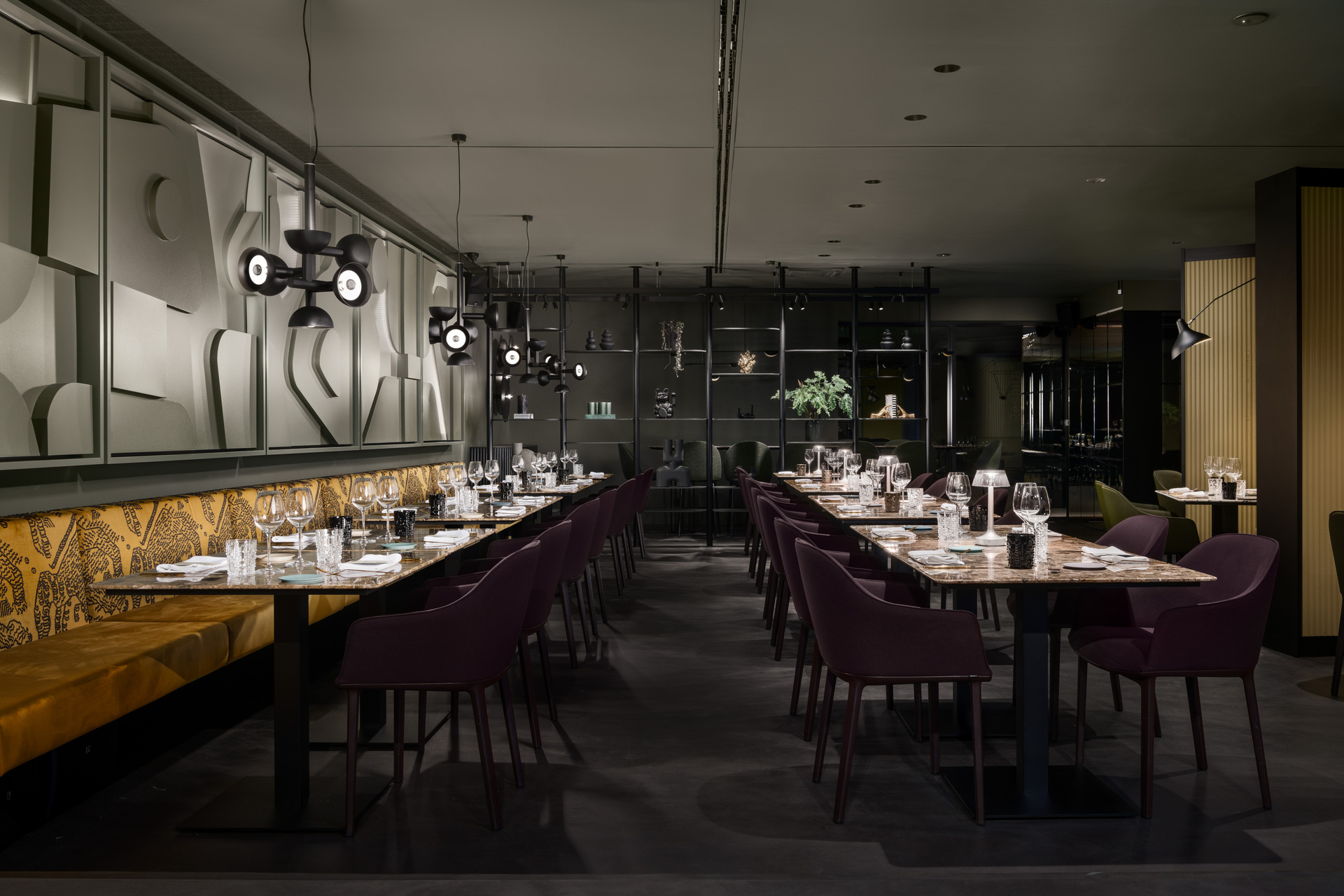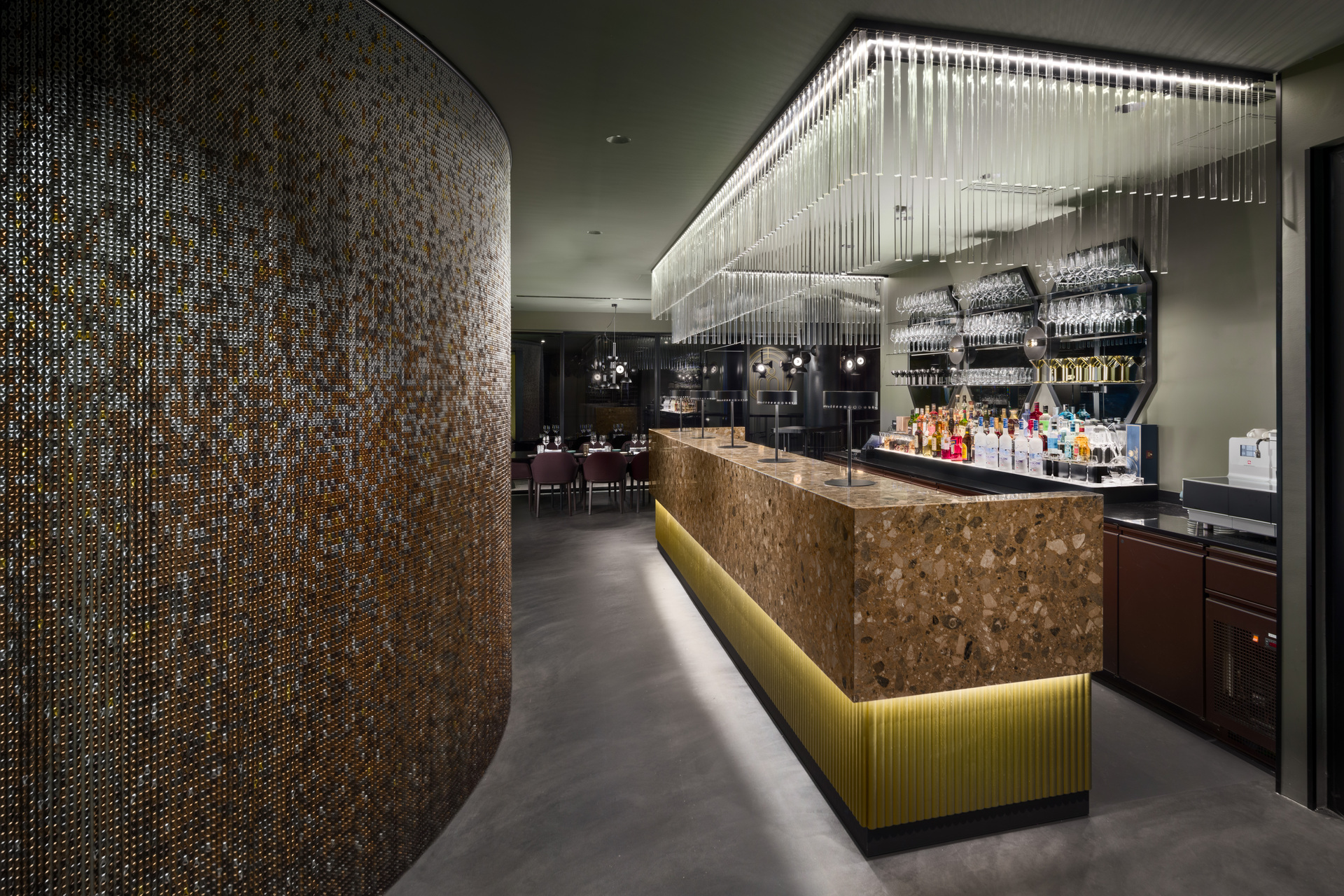 Links vom Kern lenkt die steinverkleidete Theke die Aufmerksamkeit auf sich, mit eigens angefertigten Tischleuchten ausgestattet und in ihrer Bedeutung von einer beleuchteten „Kristallkrone“ unterstrichen. Weiter links bietet ein Bereich mit Weinschrank und hohen Hockern Gelegenheit, bei einem Glas Wein zu warten, bis der nächste Tisch bereit ist. Auch Weinproben sind hier möglich.
