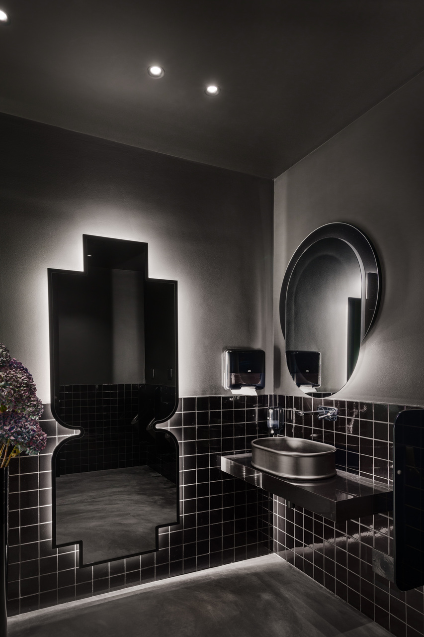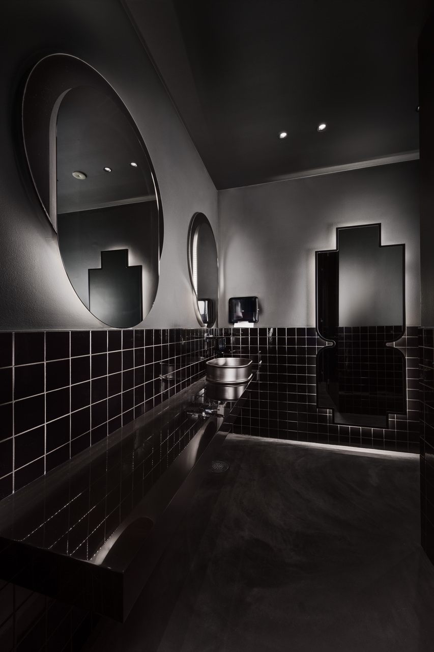 Das gänzlich in Schwarz gehaltene Interieur der Sanitärräume spielt mit Lichtreflexen der Spiegel und der hochglänzenden schwarzen Keramik.