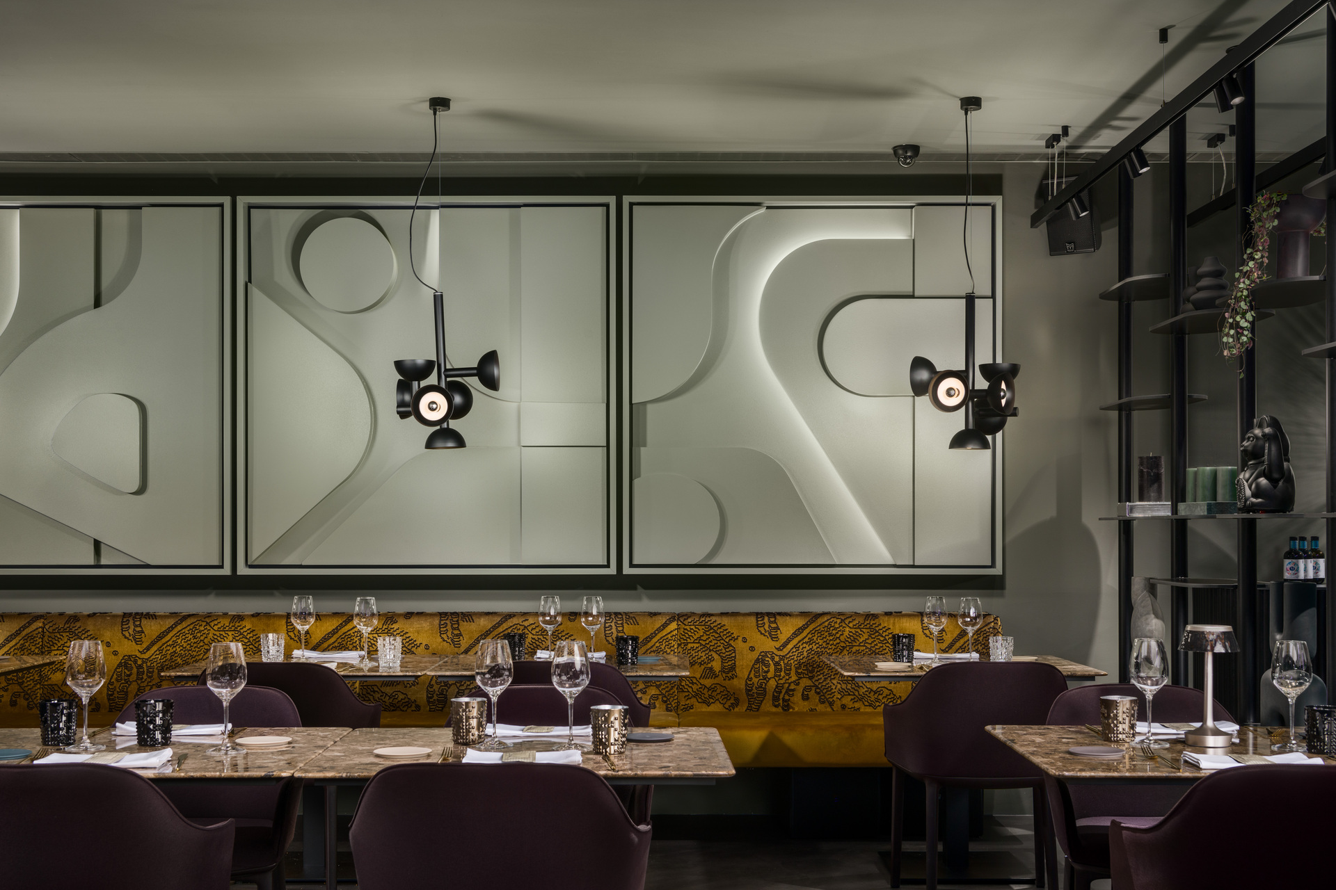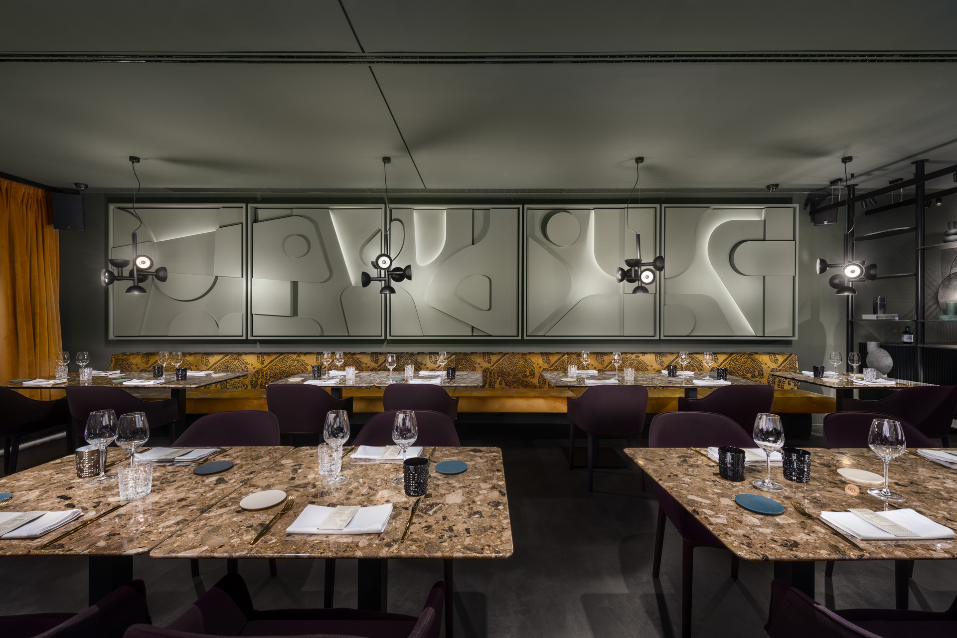 Die lange Wand wird von einer Polsterbank begleitet und durch fünf maßgefertigte, von den Architekten entworfene, hinterleuchtete Reliefkompositionen in ein dreidimensionales Raumerlebnis überführt.