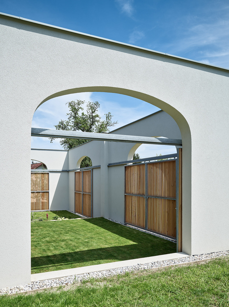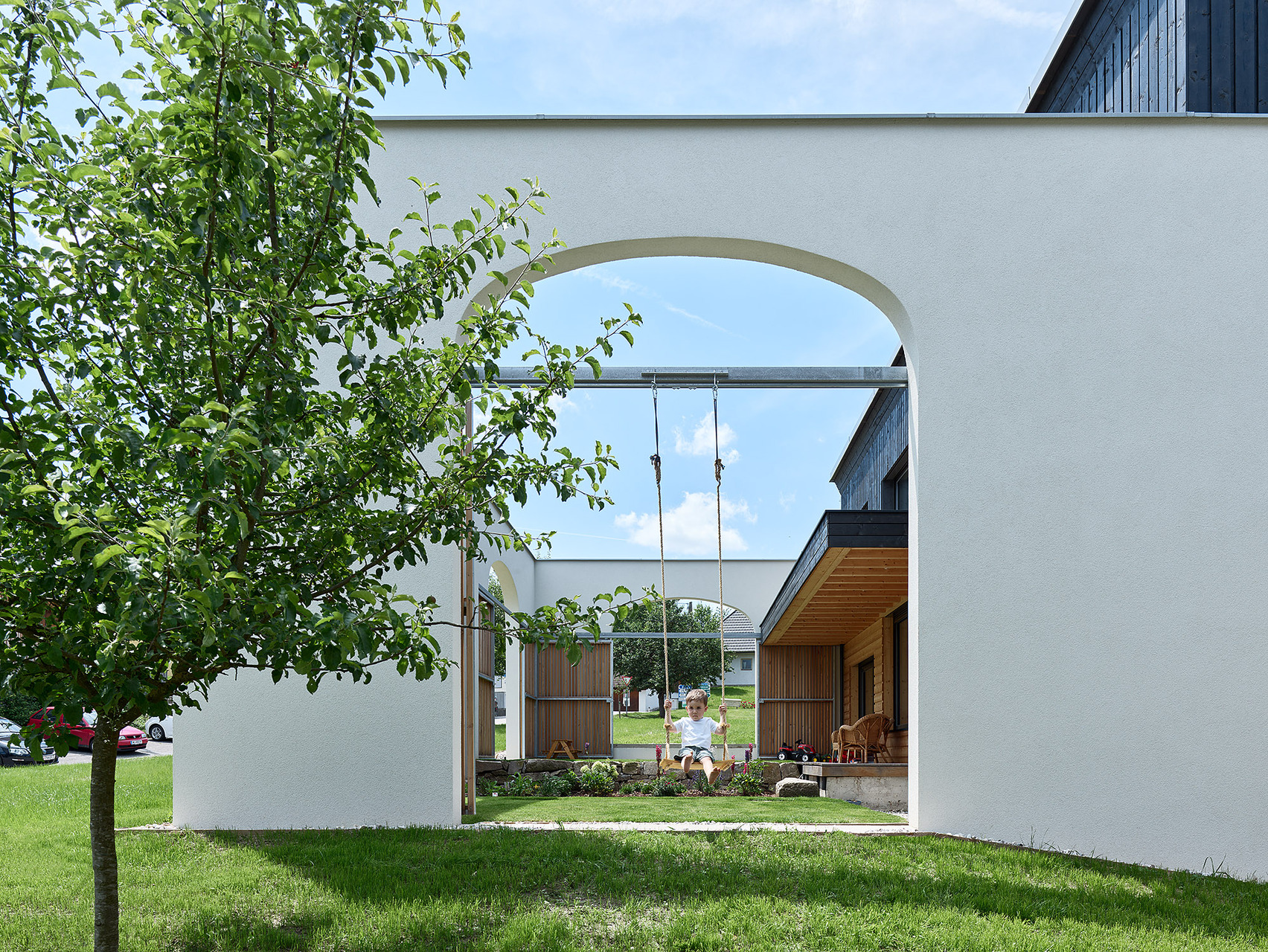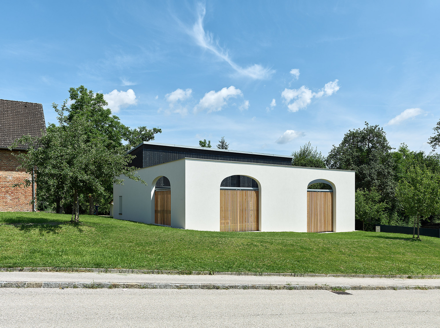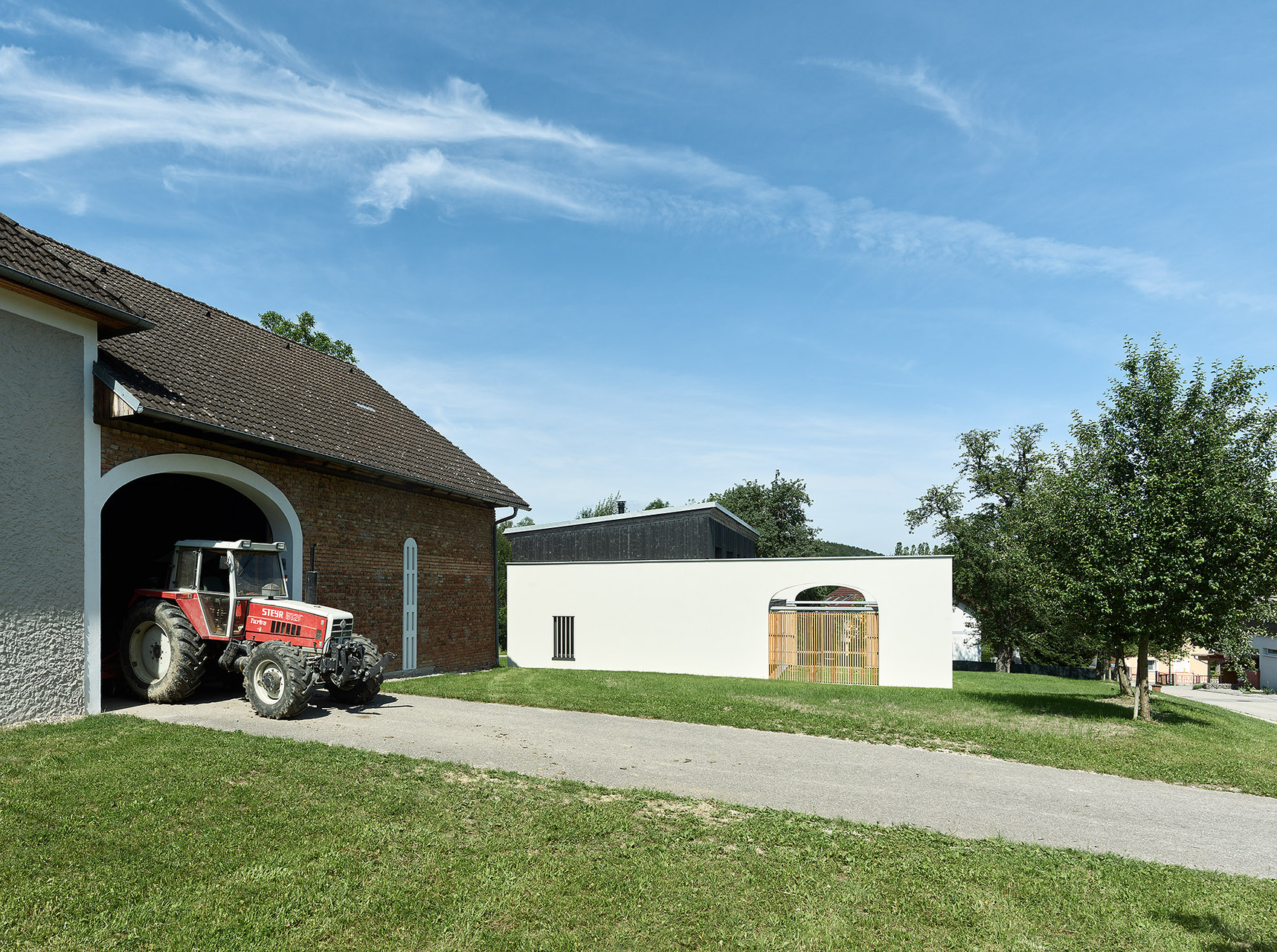 Das Wohnhaus besteht aus einer zweigeschossigen Holzriegel-Konstruktion mit Pultdach. Der gemauerte Teil ist in monolithischer Ziegelbauweise errichtet und bildet auf drei Seiten die Außenwand des Wohnhauses – eine Referenz an die Scheunentrakte des Vierkanters, deren Wände aus geschlossenen (allenfalls mit vertikalen Lüftungsschlitzen versehenen) Ziegelmauern gebildet werden und deren offene Dachkonstruktion und innere Tragstruktur aus Holzbalken bestehen. Auch das Korbbogenmotiv der großen Scheunentore findet sich in gleicher Weise bei Wirtschaftsgebäude wie Vierkanthof. Das Grundmaß von 3,4 m Breite und ca. 3,8 m Stichhöhe, das den Dimensionen der einstigen Fuhrwerke zum Eintragen von Heu oder Stroh folgte, wurde für die Tore des Wohnhauses übernommen – allerdings ausgestattet mit einer semitransparenten Filterschicht aus vertikalen Holzstäben, die sich je nach Sonnenstand und Bedürfnis nach Privatheit oder Anschluss ans Dorfleben auf- oder zuschieben lässt. (Text: Architekten, bearbeitet)