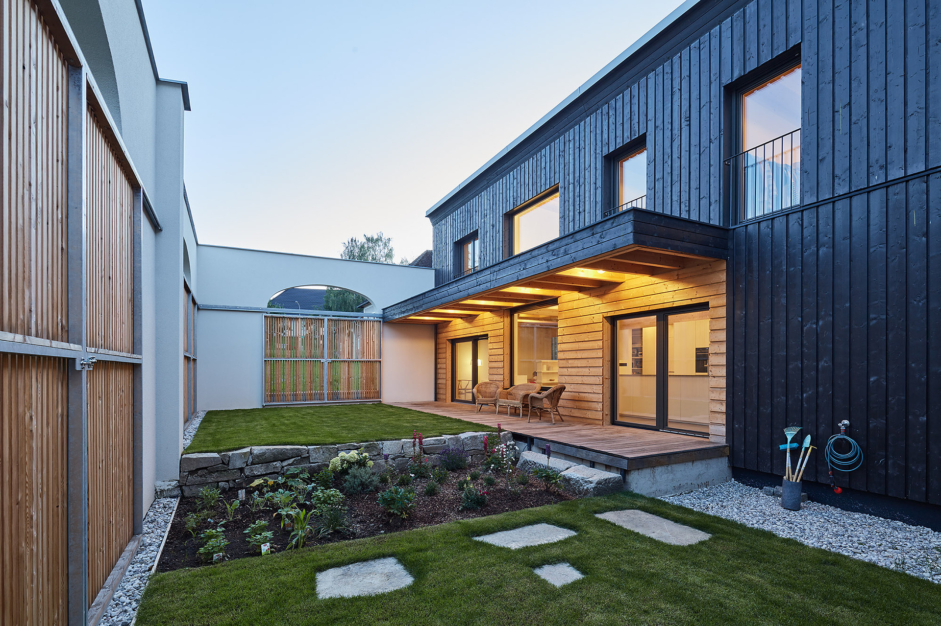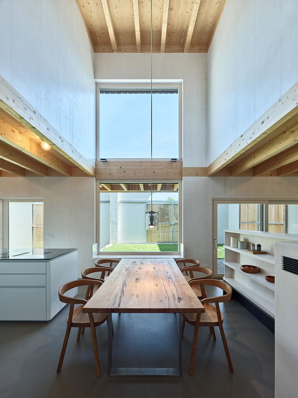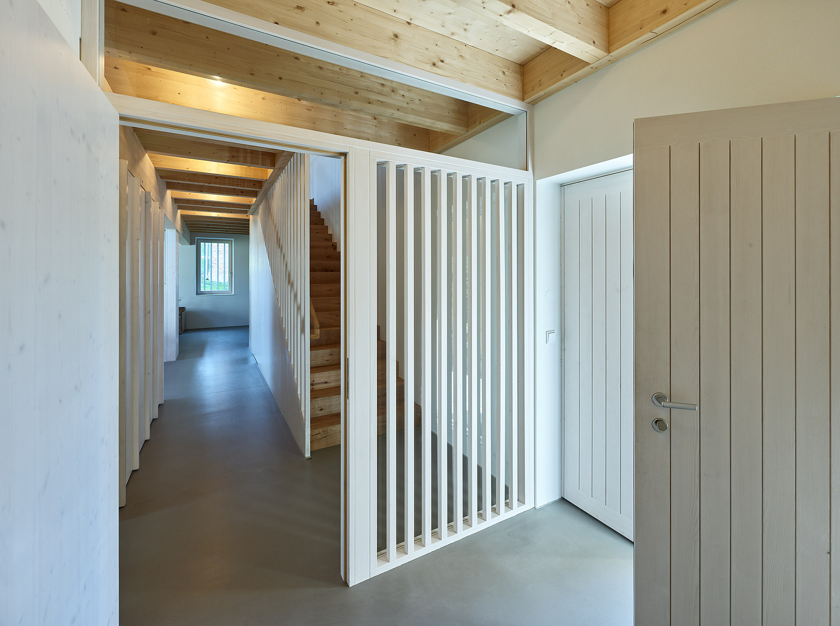 Das Wohnhaus besteht aus einer zweigeschossigen Holzriegel-Konstruktion mit Pultdach. Der gemauerte Teil ist in monolithischer Ziegelbauweise errichtet und bildet auf drei Seiten die Außenwand des Wohnhauses – eine Referenz an die Scheunentrakte des Vierkanters, deren Wände aus geschlossenen (allenfalls mit vertikalen Lüftungsschlitzen versehenen) Ziegelmauern gebildet werden und deren offene Dachkonstruktion und innere Tragstruktur aus Holzbalken bestehen. Auch das Korbbogenmotiv der großen Scheunentore findet sich in gleicher Weise bei Wirtschaftsgebäude wie Vierkanthof. Das Grundmaß von 3,4 m Breite und ca. 3,8 m Stichhöhe, das den Dimensionen der einstigen Fuhrwerke zum Eintragen von Heu oder Stroh folgte, wurde für die Tore des Wohnhauses übernommen – allerdings ausgestattet mit einer semitransparenten Filterschicht aus vertikalen Holzstäben, die sich je nach Sonnenstand und Bedürfnis nach Privatheit oder Anschluss ans Dorfleben auf- oder zuschieben lässt. (Text: Architekten, bearbeitet)
