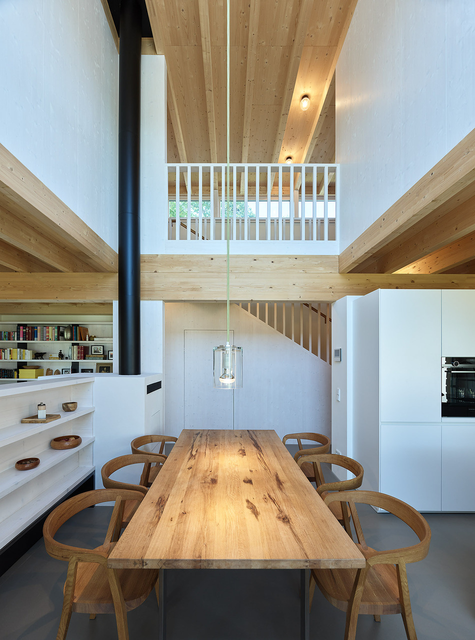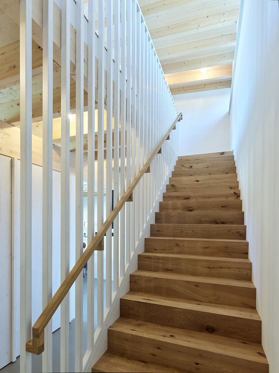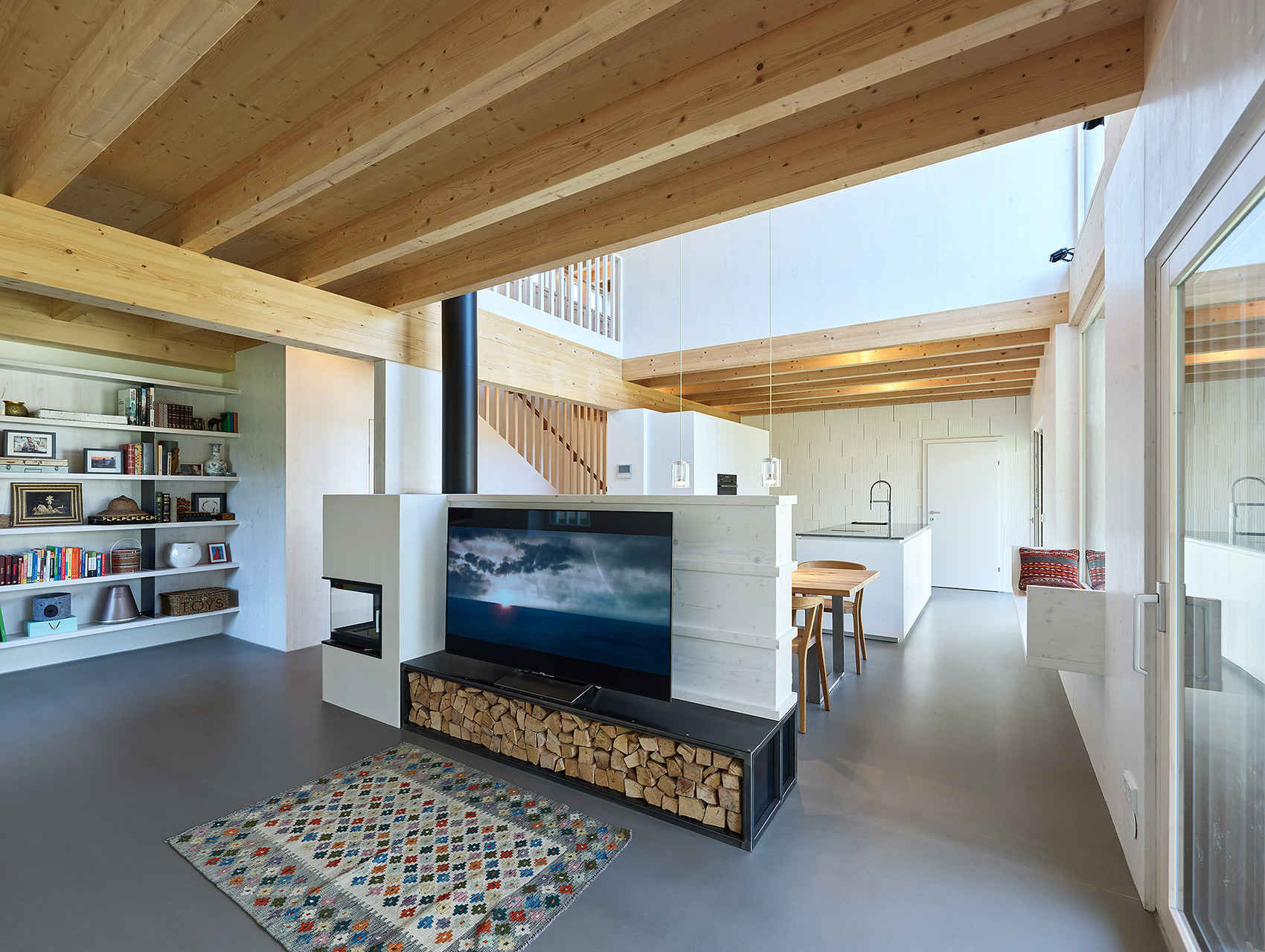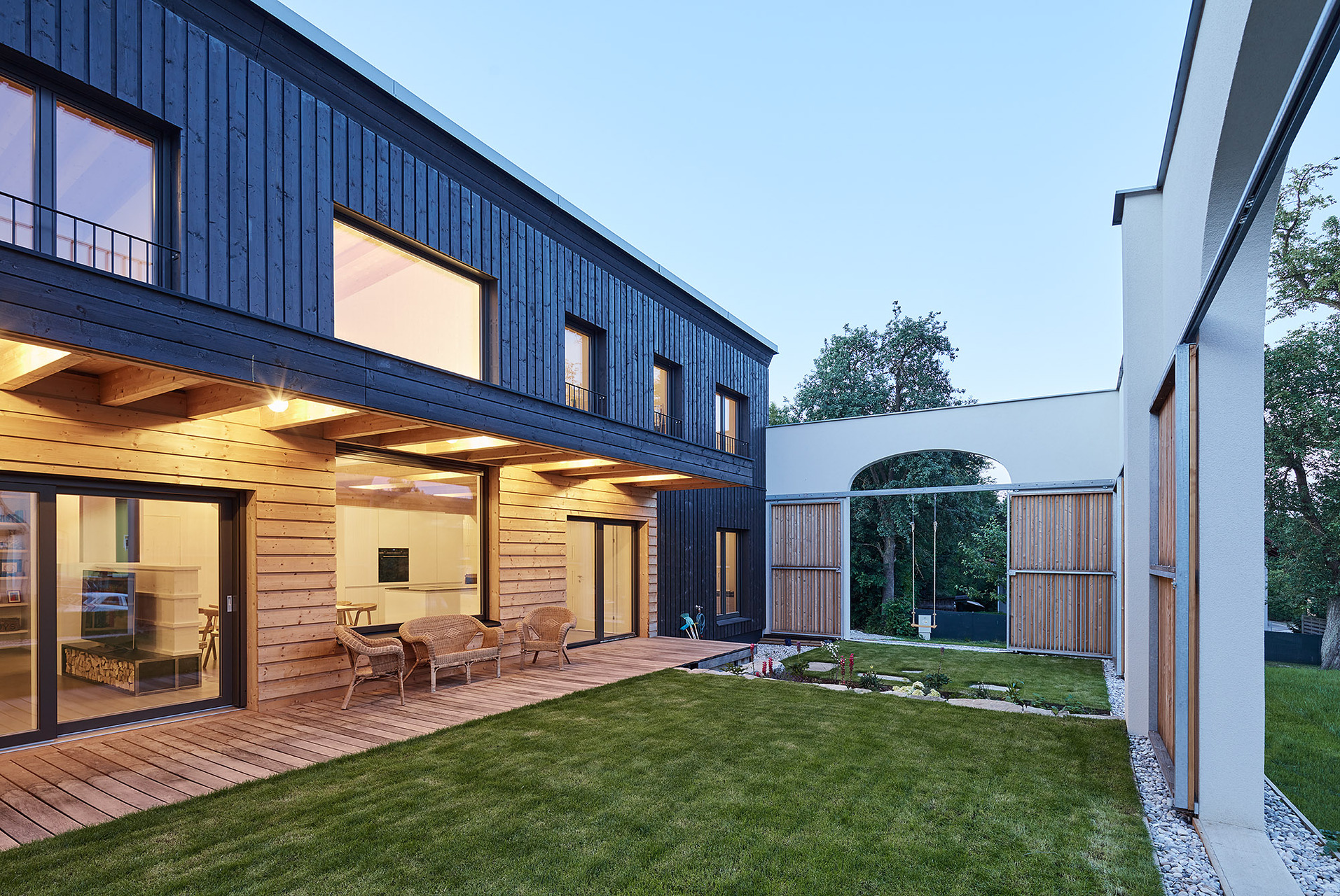Das Wohnhaus besteht aus einer zweigeschossigen Holzriegel-Konstruktion mit Pultdach. Der gemauerte Teil ist in monolithischer Ziegelbauweise errichtet und bildet auf drei Seiten die Außenwand des Wohnhauses – eine Referenz an die Scheunentrakte des Vierkanters, deren Wände aus geschlossenen (allenfalls mit vertikalen Lüftungsschlitzen versehenen) Ziegelmauern gebildet werden und deren offene Dachkonstruktion und innere Tragstruktur aus Holzbalken bestehen. Auch das Korbbogenmotiv der großen Scheunentore findet sich in gleicher Weise bei Wirtschaftsgebäude wie Vierkanthof. Das Grundmaß von 3,4 m Breite und ca. 3,8 m Stichhöhe, das den Dimensionen der einstigen Fuhrwerke zum Eintragen von Heu oder Stroh folgte, wurde für die Tore des Wohnhauses übernommen – allerdings ausgestattet mit einer semitransparenten Filterschicht aus vertikalen Holzstäben, die sich je nach Sonnenstand und Bedürfnis nach Privatheit oder Anschluss ans Dorfleben auf- oder zuschieben lässt. (Text: Architekten, bearbeitet)