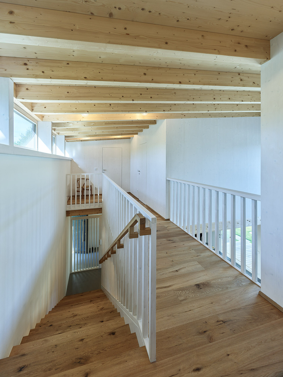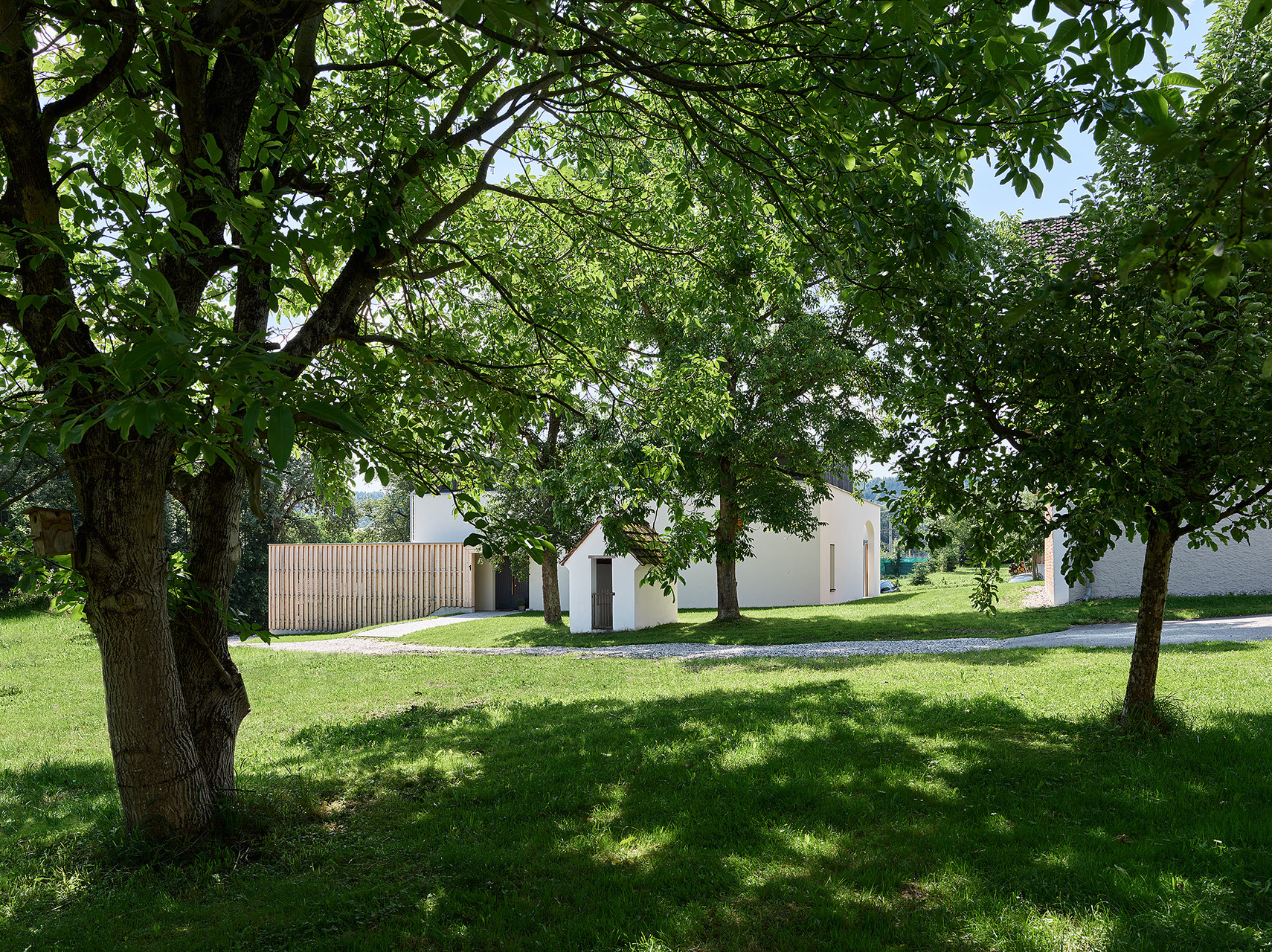 Mit dem Neubau wird bewusst der Bezug zu den landwirtschaftlich genutzten Bestandsgebäuden gesucht, um das Haus als Teil des bäuerlichen Ensembles lesbar zu machen. Das Dilemma einer wenig attraktiven Aussicht auf der am besten belichteten Seite wurde mit einem vorgelagerten Innenhof behoben. Als Grundform diente ein gemauertes Geviert von 15 x 16 Metern, dessen Proportion dem Vierkanthof entlehnt wurde. Die Hälfte dieser Fläche nimmt das eigentliche Wohnhaus ein, die andere Hälfte ist dem Innenhof vorbehalten, zu dem alle Aufenthaltsräume orientiert sind.