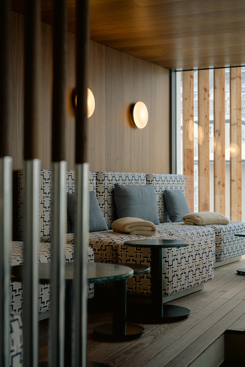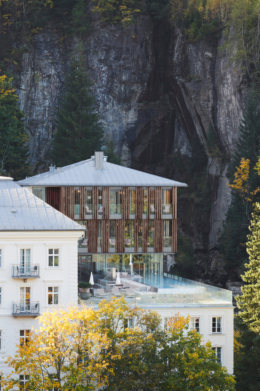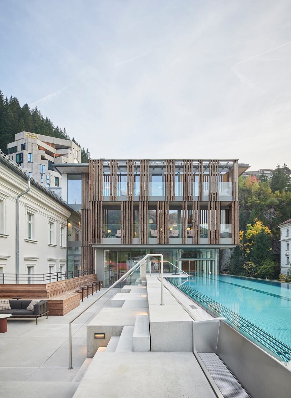 Wendet man sich am Eingang nach links, auf der Westseite des Hauses, gelangt man in den über mehrere Stockwerke reichenden, knapp 700 m² umfassende Spa-Bereich (350 m² indoor, ca. 330 m² Terrasse mit Pool), der sich über den Bestands- und einen Neubau erstreckt. Letzterer war erforderlich, weil der Baukörper im Anschluss an das Haus Straubingerplatz 1 in seiner Struktur über der neuen Poolterrasse nicht gehalten werden konnte und durch einen Glasvorbau mit vorgesetzter Lamellenfassade ersetzt wurde. „Durch die großflächige Verglasung ist der Baukörper zum Tal hin geöffnet. Den Gästen bietet sich ein freier Blick auf die umliegende Landschaft. Die vorgesetzten Holzlamellen wiederum verhindern unerwünschte Einblicke, sodass die Intimität der Räume gewährleistet bleibt“, erklärt Markus Kaplan, BWM Designers & Architects. Mit dieser Neugestaltung wurde auch die ursprüngliche Fuge zwischen Hotel Straubinger und dem Haus Straubingerplatz 1, die erst Anfang des 20. Jahrhunderts baulich geschlossen wurde, wieder geöffnet. Für beide Häuser wurde ein kuratiertes Kunstkonzept mit Andrea von Goetz und Schwanenfliess ausgearbeitet. (Text: Roman Höllbacher)