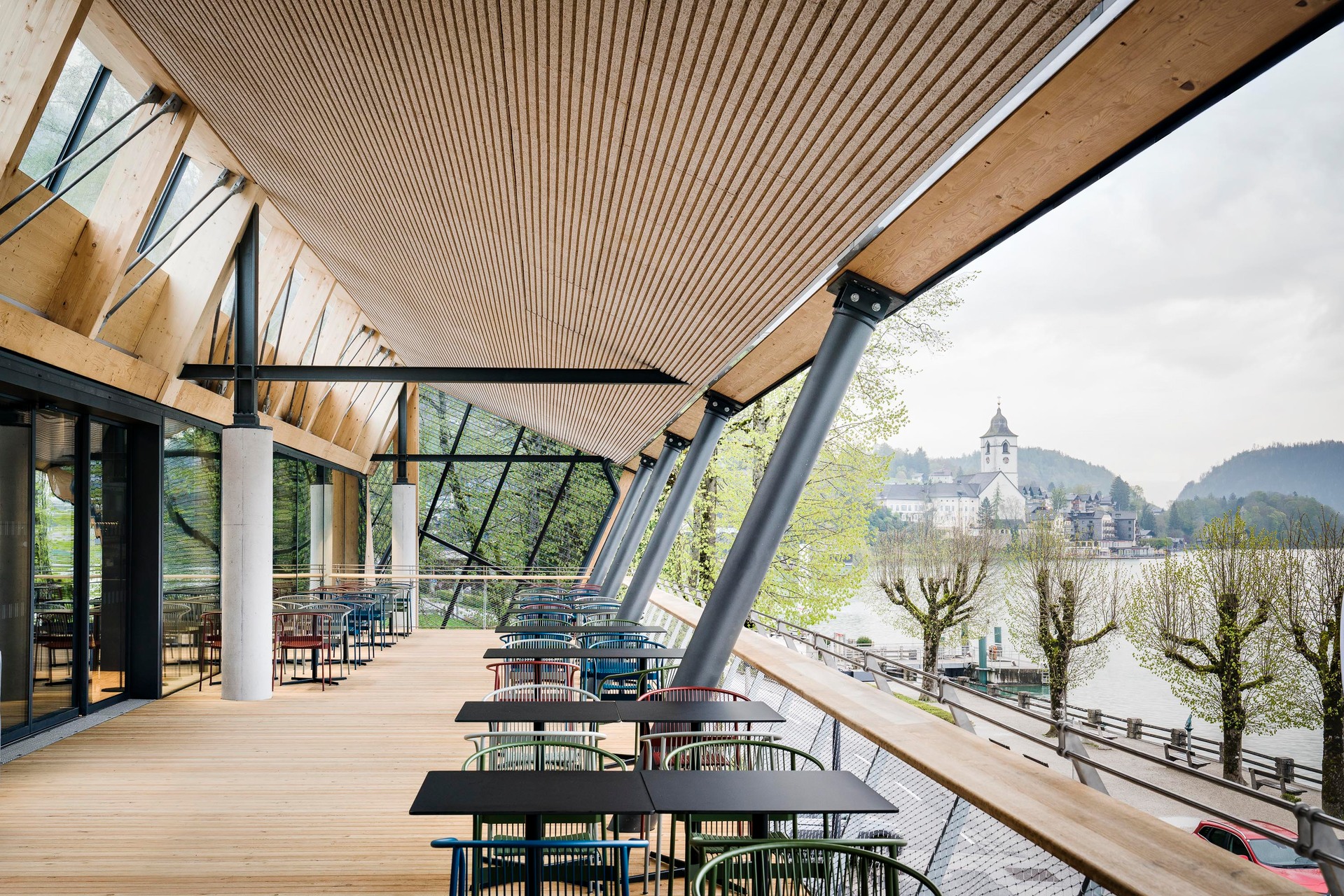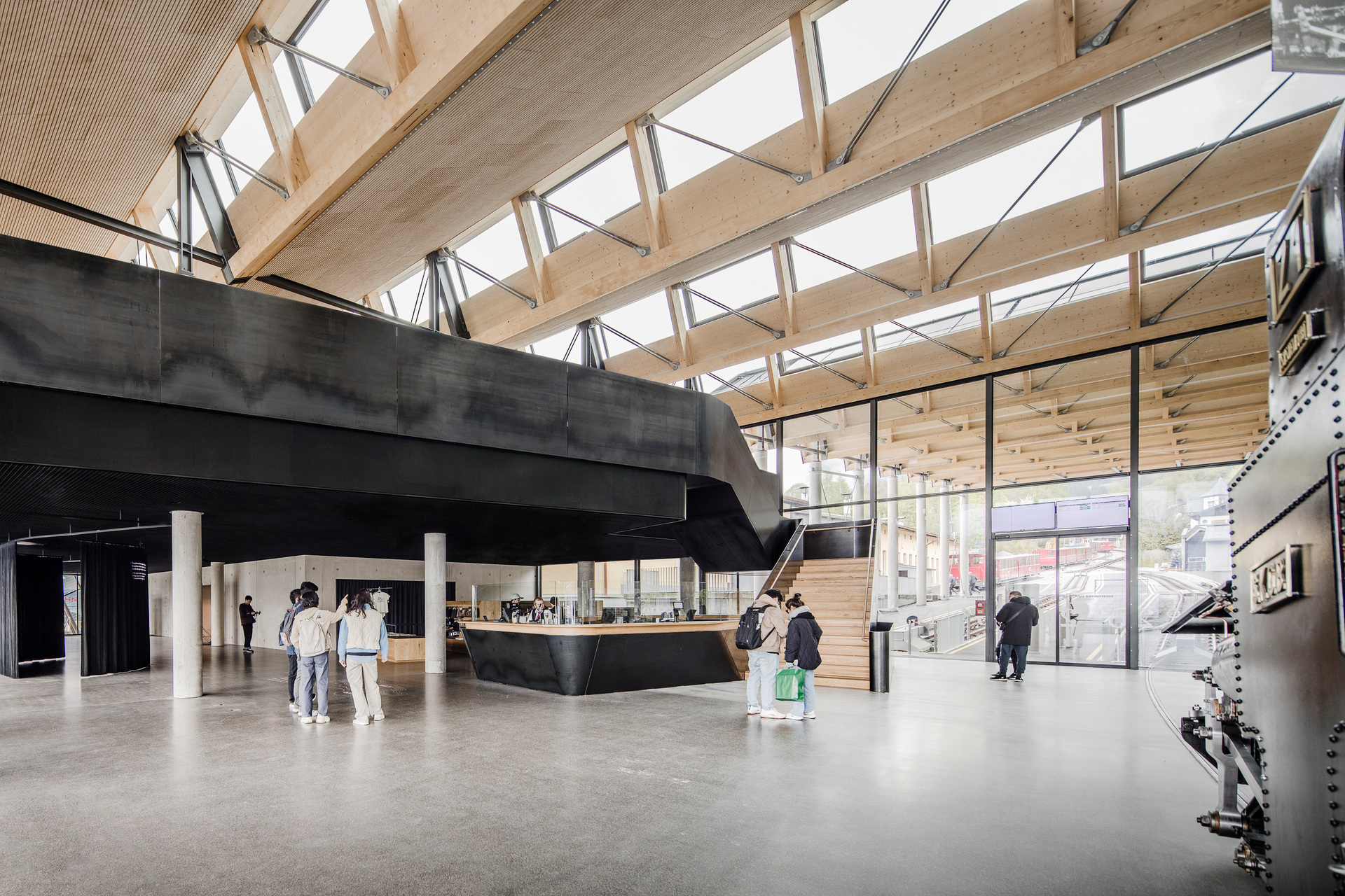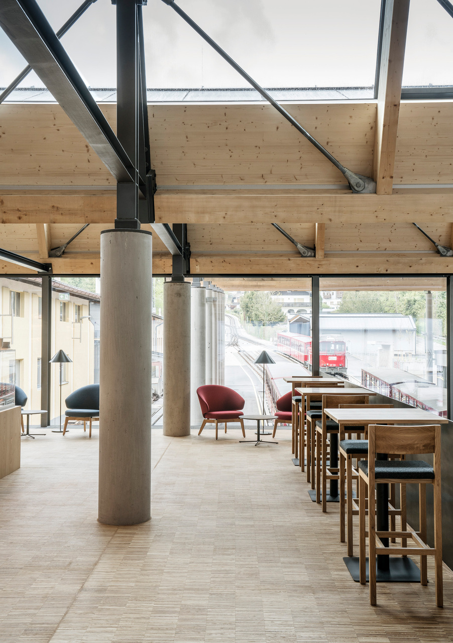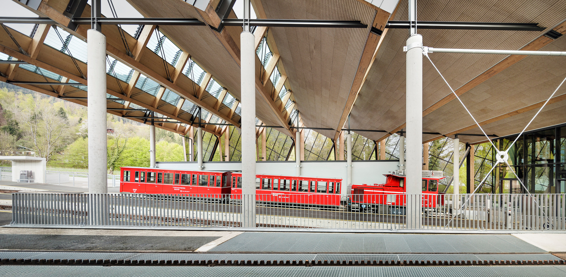 Der Neubau besteht aus einem zweigeschossigen Haupt- und einem eingeschossigen Nebengebäude. Zusammen mit den Bestandsgebäuden der Werkstätten umschließen sie u-förmig das Bahnhofsgelände. Über den beiden Neubauten spannt ein Sheddach, das auch die Bahnsteigüberdachung herstellt und die Großform des Bahnhofs räumlich zusammenhängt. Die Faltung des Daches klappt als zweite Fassadenebene auch in die Vertikale und setzt das gestalterische Motiv des Faltwerks in den Ansichten fort. Die dadurch entstehende Kleingliedrigkeit im Erscheinungsbild lässt einen Dialog mit der kleinmaßstäblichen Bebauung der Umgebung entstehen. Im Hauptgebäude wurden die verschiedenen öffentlichen Funktionsbereiche wie Eingangshalle mit Ticketing, Ausstellung, Shop, Restaurant und Veranstaltungsbereich in einer offenen Halle angeordnet. Diese wurde durch umlaufende Verglasungen in den Fassaden und im Sheddach stark zur Umgebung geöffnet und so der Bezug zum See und den Bergen hergestellt. Die Materialien Holz und Stahl spielen eine zentrale Rolle. Die Überlagerung der Bahnhofstypologie mit den Anforderungen an das Gebäude aus der touristischen Nutzung spannt thematisch einen weiten und spannenden Bogen. „Industrielle“ Materialien und eine technische Formensprache verankern das Gebäude atmosphärisch in der Bahnhofstypologie, während Holz Aufenthaltsqualität für Besucher:innen entstehen lässt. Auf der Ebene des Obergeschosses des Hauptgebäudes befindet sich neben den Betriebsbüros auch die gastronomische Nutzung. Auf der großzügigen, gedeckten Restaurant-Terrasse öffnet sich der Blick auf das historische Wallfahrts-Heiligtum des hl. Wolfgang in dieser einzigartigen Weltlandschaft des Salzkammergutes. (Roman Höllbacher – auf Basis des Textes der Architekten)