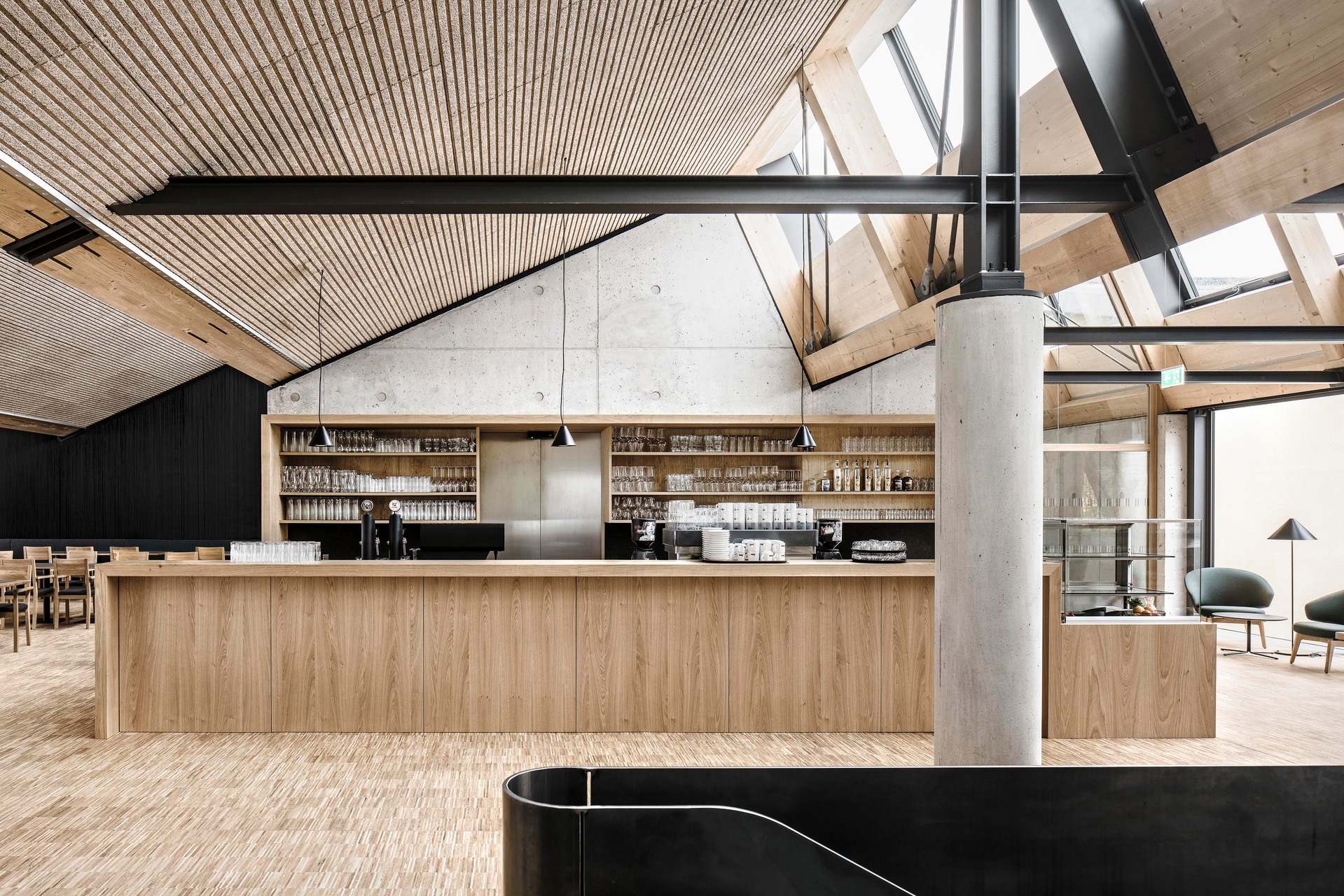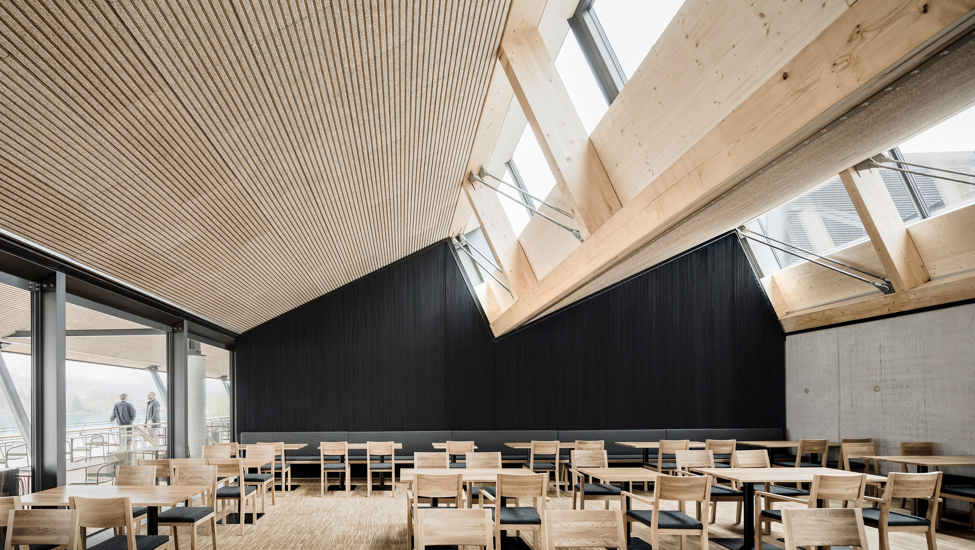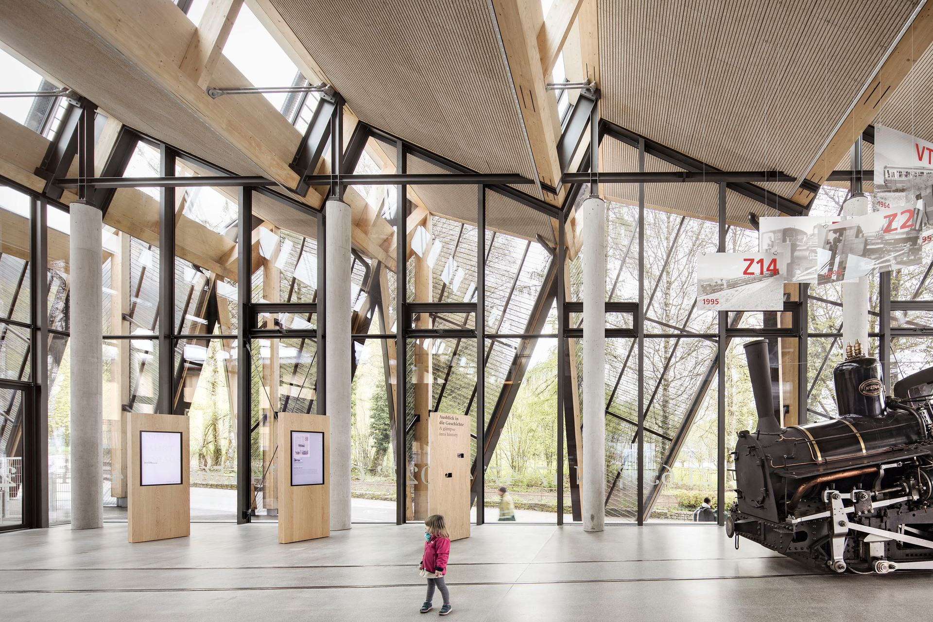 Der Neubau besteht aus einem zweigeschossigen Haupt- und einem eingeschossigen Nebengebäude. Zusammen mit den Bestandsgebäuden der Werkstätten umschließen sie u-förmig das Bahnhofsgelände. Über den beiden Neubauten spannt ein Sheddach, das auch die Bahnsteigüberdachung herstellt und die Großform des Bahnhofs räumlich zusammenhängt. Die Faltung des Daches klappt als zweite Fassadenebene auch in die Vertikale und setzt das gestalterische Motiv des Faltwerks in den Ansichten fort. Die dadurch entstehende Kleingliedrigkeit im Erscheinungsbild lässt einen Dialog mit der kleinmaßstäblichen Bebauung der Umgebung entstehen. Im Hauptgebäude wurden die verschiedenen öffentlichen Funktionsbereiche wie Eingangshalle mit Ticketing, Ausstellung, Shop, Restaurant und Veranstaltungsbereich in einer offenen Halle angeordnet. Diese wurde durch umlaufende Verglasungen in den Fassaden und im Sheddach stark zur Umgebung geöffnet und so der Bezug zum See und den Bergen hergestellt. Die Materialien Holz und Stahl spielen eine zentrale Rolle. Die Überlagerung der Bahnhofstypologie mit den Anforderungen an das Gebäude aus der touristischen Nutzung spannt thematisch einen weiten und spannenden Bogen. „Industrielle“ Materialien und eine technische Formensprache verankern das Gebäude atmosphärisch in der Bahnhofstypologie, während Holz Aufenthaltsqualität für Besucher:innen entstehen lässt. Auf der Ebene des Obergeschosses des Hauptgebäudes befindet sich neben den Betriebsbüros auch die gastronomische Nutzung. Auf der großzügigen, gedeckten Restaurant-Terrasse öffnet sich der Blick auf das historische Wallfahrts-Heiligtum des hl. Wolfgang in dieser einzigartigen Weltlandschaft des Salzkammergutes. (Roman Höllbacher – auf Basis des Textes der Architekten)