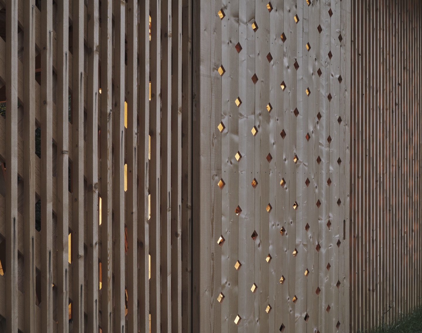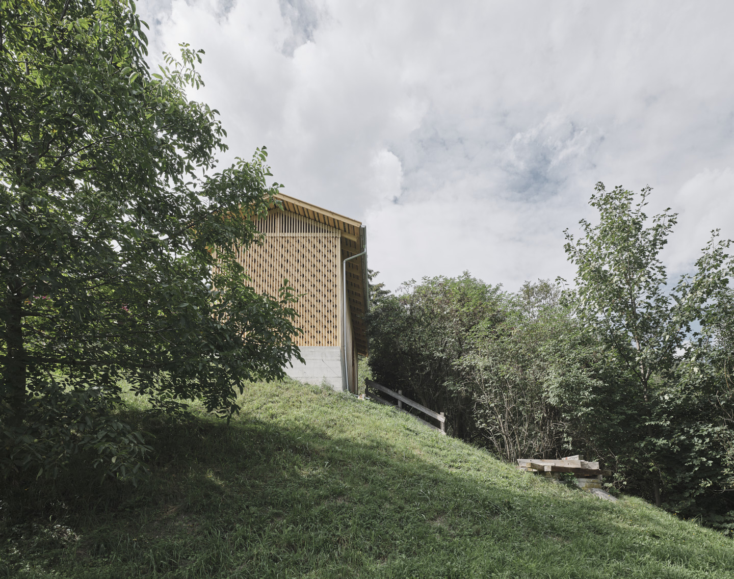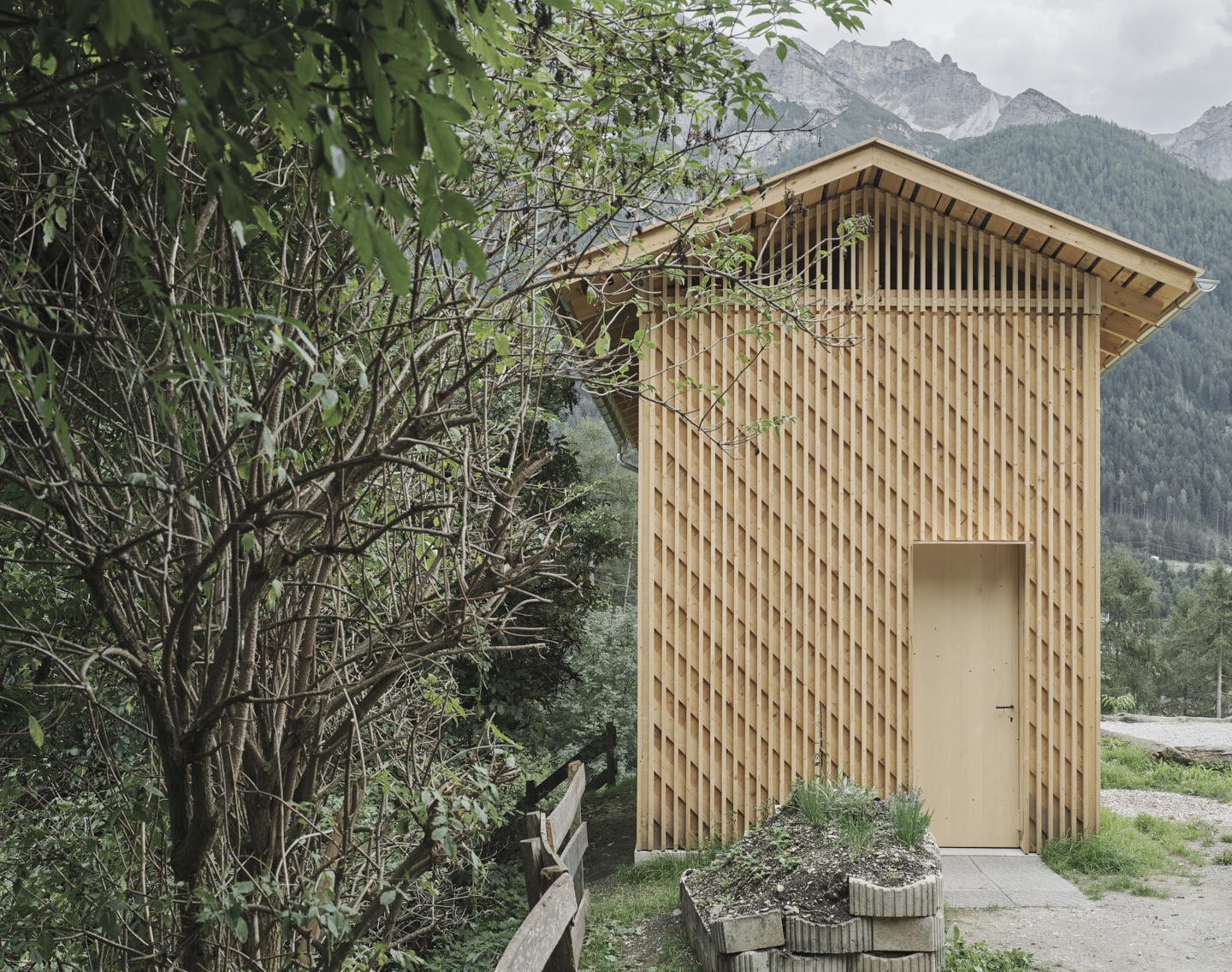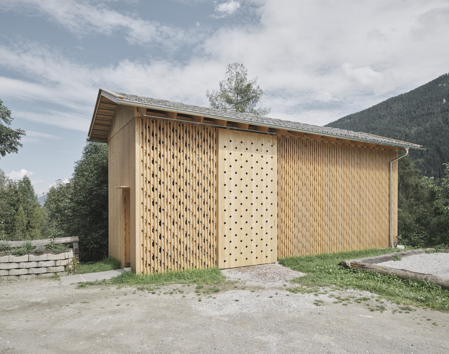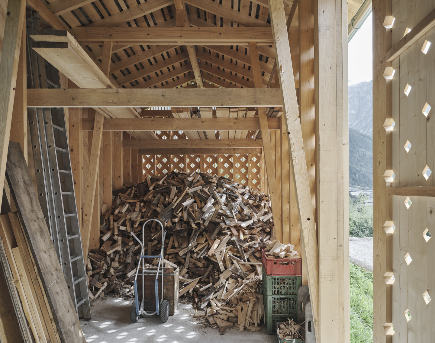 Auf dem Grundstück des ehemaligen Bauernhofs realisierten sie wenig später einen kleinen Nutzbau, der als schmaler hoher Baukörper den Abschluss zum angrenzenden Hang bildet und eine geschützte Hofsituation schafft. Das 30 m² große Holzgebäude wurde komplett in Eigenleistung und ohne schweres Gerät aufgestellt. Sein charakteristisches Erscheinungsbild erhält das Lagergebäude für Holz durch eine durchlässige ornamentale Fassade, die aus der Überlagerung zweier Schichten resultiert: den konstruktiv wichtigen, gekreuzten Fichtenbrettern und der über den gesamten Gebäudeumfang gelegten vertikalen Fichtenlattung. Für das Dach wurden alte, im Stubaital handgefertigte Dachplatten wiederverwendet. Setzt sich diese bereits bewitterte Oberfläche noch von der Fassade ab, so werden im Lauf der Jahre auch die roh belassenen Fassadenbretter entsprechend gealtert sein. Da den Architekten eine achtsame Bauweise äußerst wichtig ist, versuchten sie möglichst viel Baumaterialien wiederzuverwenden und die Abfallmenge während des Baus zu minimieren. (Text: Claudia Wedekind nach einem Text der Architekten)