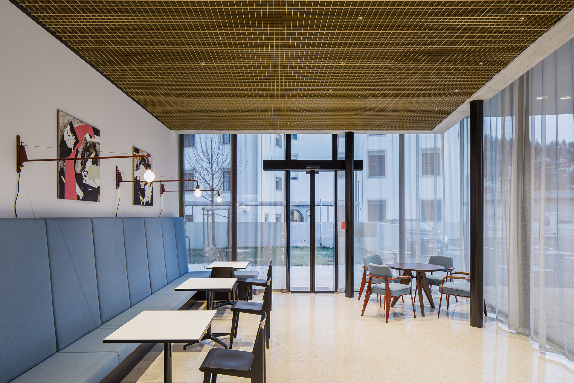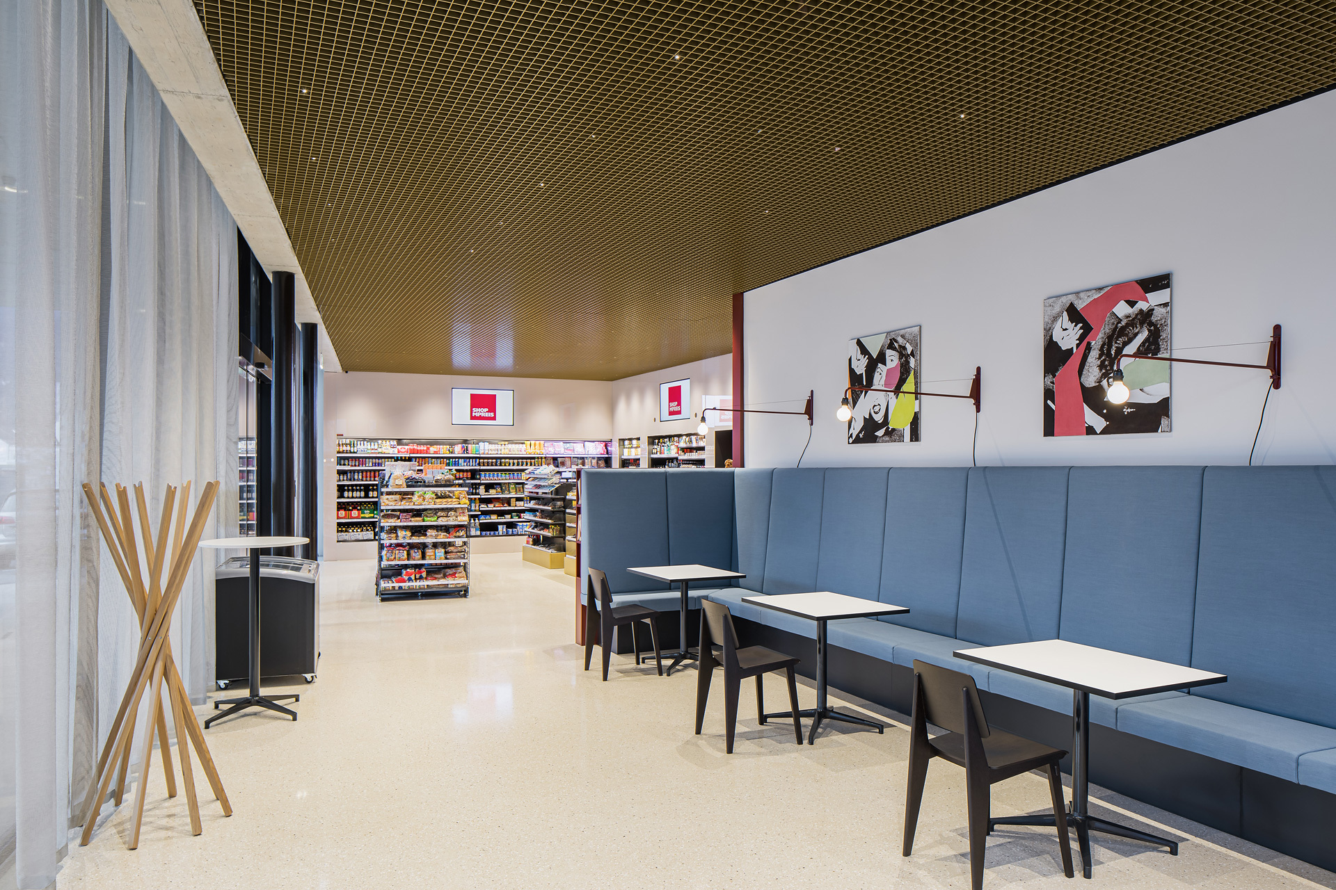 Die darunterliegende Tankstelle ist im Gegenzug mit einer vollflächigen Glasfassade in den Außenraum geöffnet. Neben einem kleinen Shop wurde ein sonst für Tankstellen unüblicher, attraktiver Cafébereich geschaffen. Der Bereich zwischen dem Neubau und dem „Leuthaus“, über den man von der Straße aus in das Stiftsareal kommt, wurde neugestaltet und als Grünanlage bzw. Terrasse für das Café aufgewertet. (Text: Claudia Wedekind)