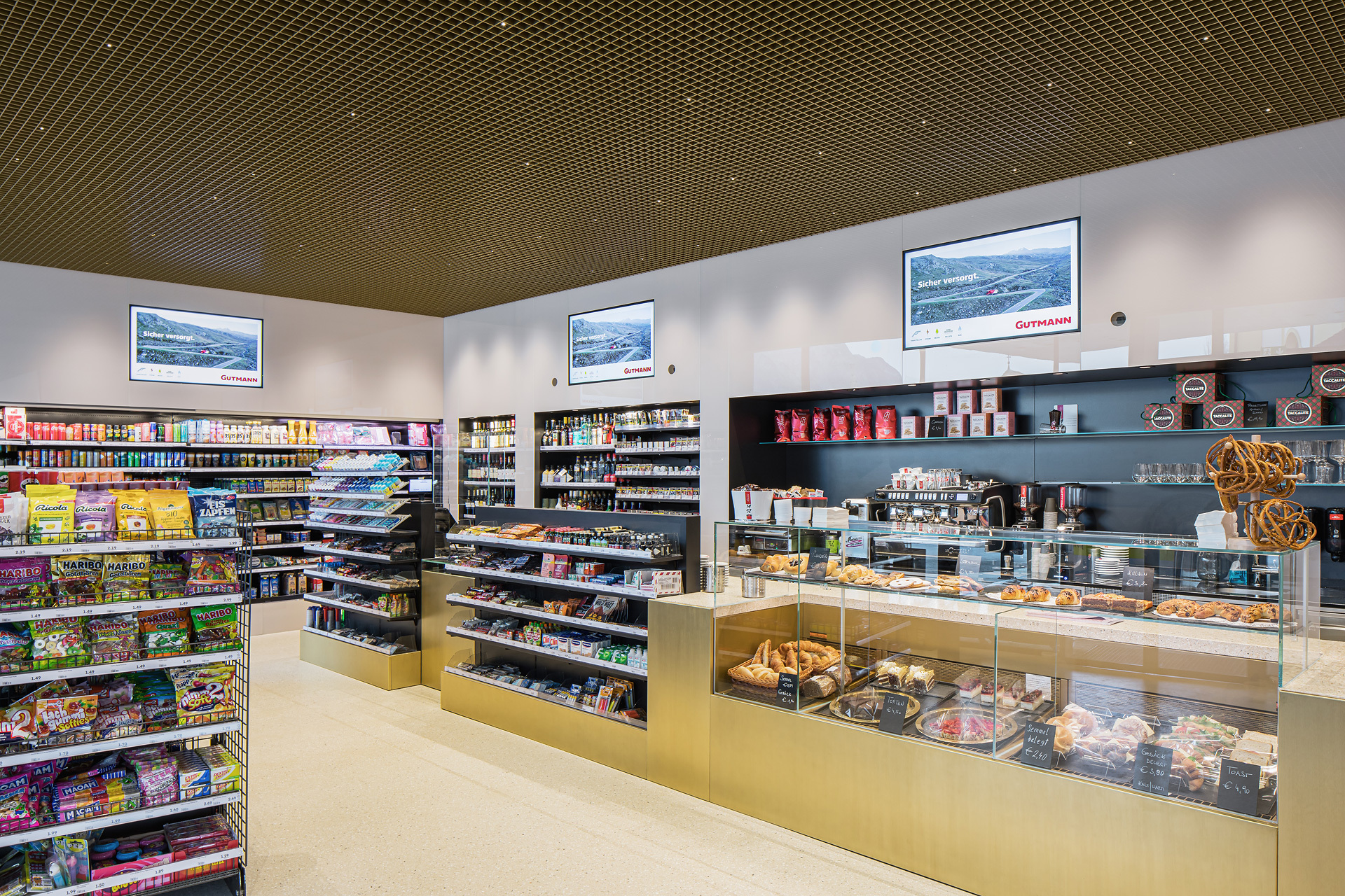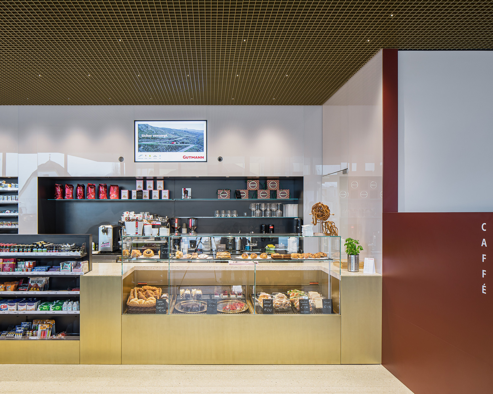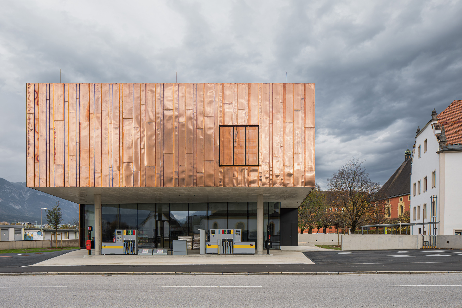 Entstanden ist ein weitgehend geschlossener Baukörper, der straßenseitig die Betankungsinsel überkragt und mit seiner durchgehenden Außenhaut aus naturbelassenem Kupferblech selbstbewusst in Erscheinung tritt. Über diese Materialwahl wird Bezug zu den umliegenden historischen Bauwerken wie der Wiltener Basilika und dem Leuthaus hergestellt.