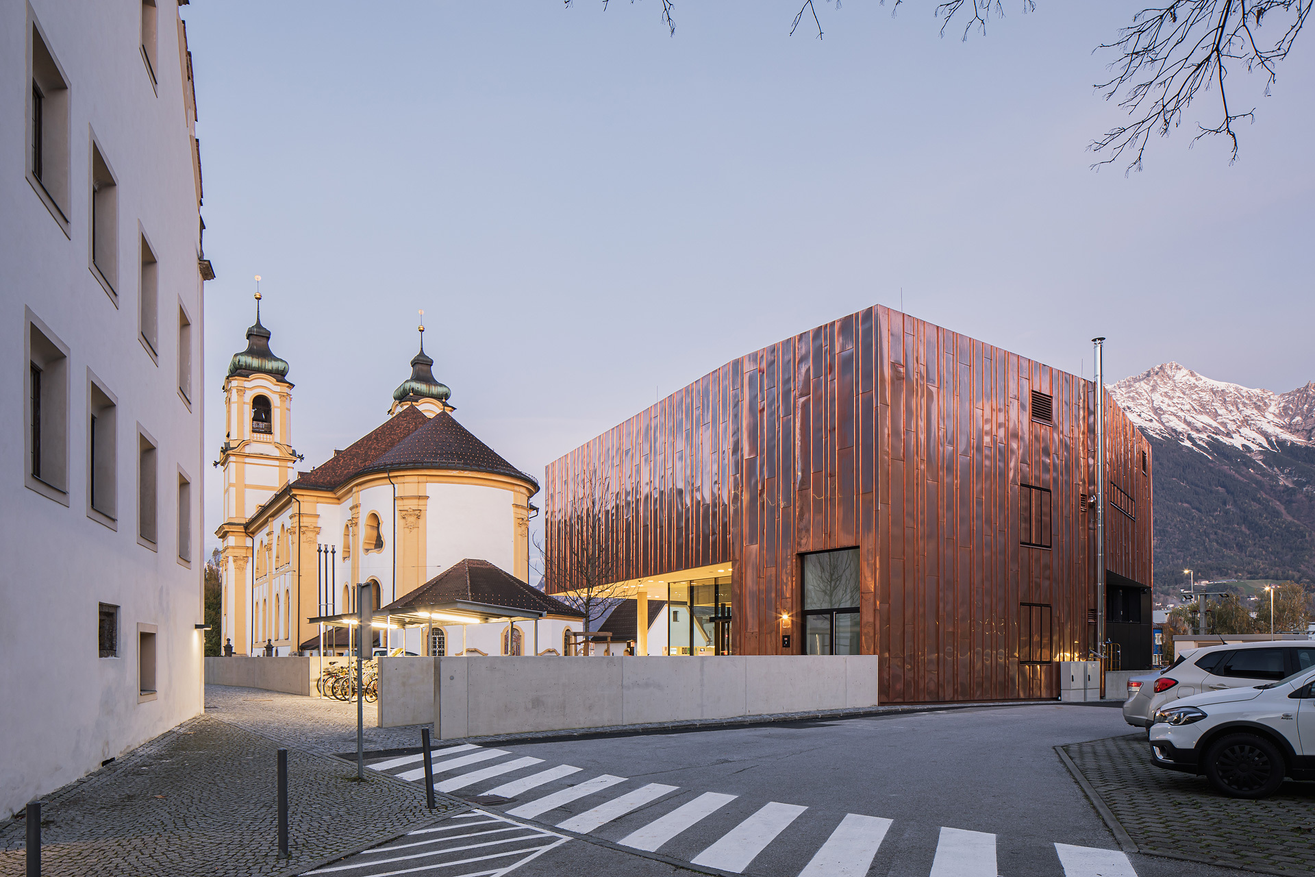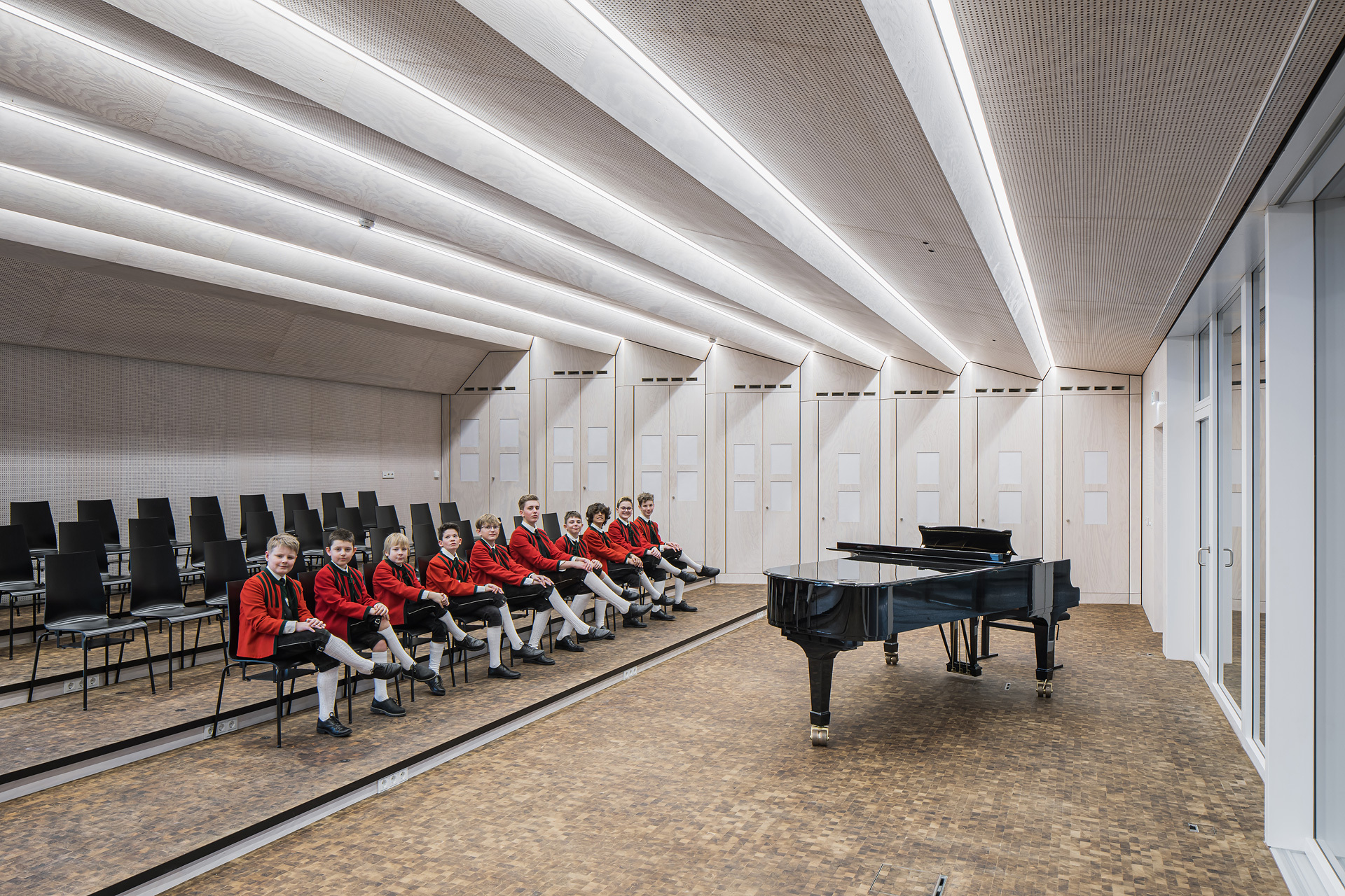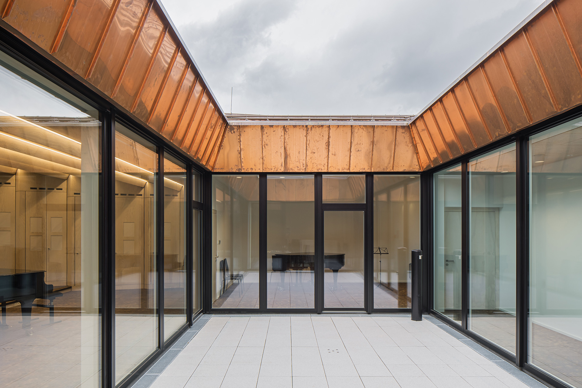 Die neuen Räumlichkeiten der Wiltener Sängerknaben erreicht man über eine Treppe im hinteren Bereich des Gebäudes. Rund um ein nach oben offenes Atrium liegen der große, schalloptimierte Saal, ein Büro, Lager- und Garderobenräume, Sanitäreinrichtungen und ein kleines Foyer. Aufgrund der Lage an einer verkehrsreichen Einfallsstraße und um möglichst wenig durch den Tankstellenbetrieb beeinträchtig zu werden, gibt es nur sehr wenige Öffnungen nach Außen, die fassadenbündig mit gelochten „Kupferläden“ überblendet sind. Die Belichtung und Belüftung des Probelokals übernimmt das Atrium, das von den Sängerknaben als ruhiger Aufenthaltsort im Freien genutzt werden kann.