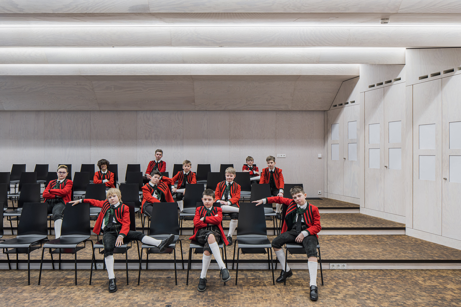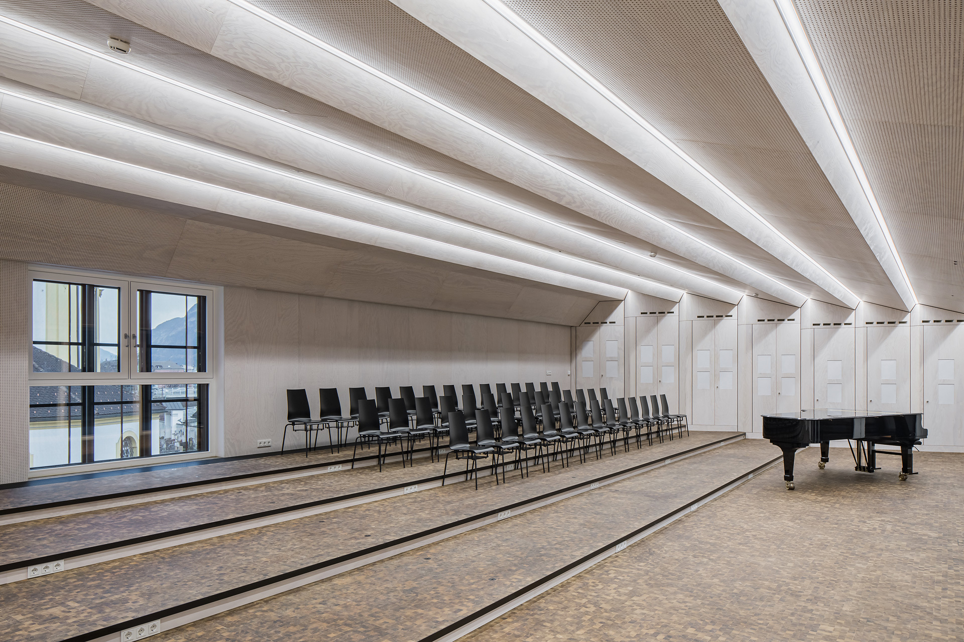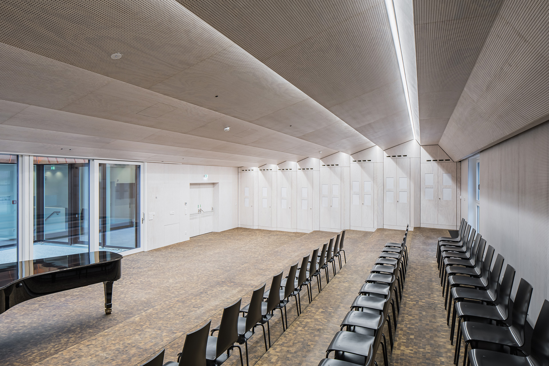 Die neuen Räumlichkeiten der Wiltener Sängerknaben erreicht man über eine Treppe im hinteren Bereich des Gebäudes. Rund um ein nach oben offenes Atrium liegen der große, schalloptimierte Saal, ein Büro, Lager- und Garderobenräume, Sanitäreinrichtungen und ein kleines Foyer. Aufgrund der Lage an einer verkehrsreichen Einfallsstraße und um möglichst wenig durch den Tankstellenbetrieb beeinträchtig zu werden, gibt es nur sehr wenige Öffnungen nach Außen, die fassadenbündig mit gelochten „Kupferläden“ überblendet sind. Die Belichtung und Belüftung des Probelokals übernimmt das Atrium, das von den Sängerknaben als ruhiger Aufenthaltsort im Freien genutzt werden kann.