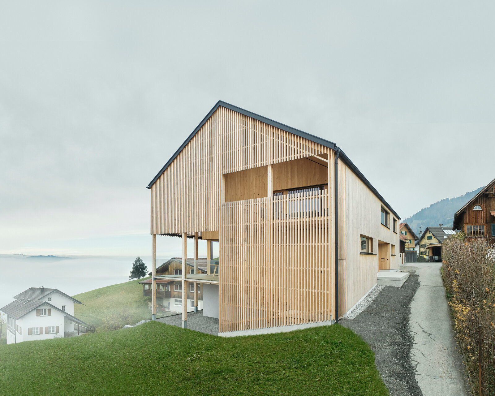Ein bestimmendes Element der Fassade ist der räumliche Filter mit perforierter Holzlattung, den Mähr als vorgestellte Holzkonstruktion auf der Hangseite des Gebäudes anordnete. Er ersetzt einen länglichen Betonbalkon, kragt aber im Unterschied zu diesem nicht aus, sondern steht mit seinen Stützen auf einem kleinen Vorsprung an der Hangkante. Dabei umschließt er als eine Art Schopf den Sockelbereich im UG, der weiß verputzt belassen wurde. So wird das Thema der homogenen Hülle konsequent fortgeführt. Gleichzeitig ermöglicht der Filter geschützte Außenbereiche in den beiden darüberliegenden Geschossen durch eingehängte Holzplattformen.