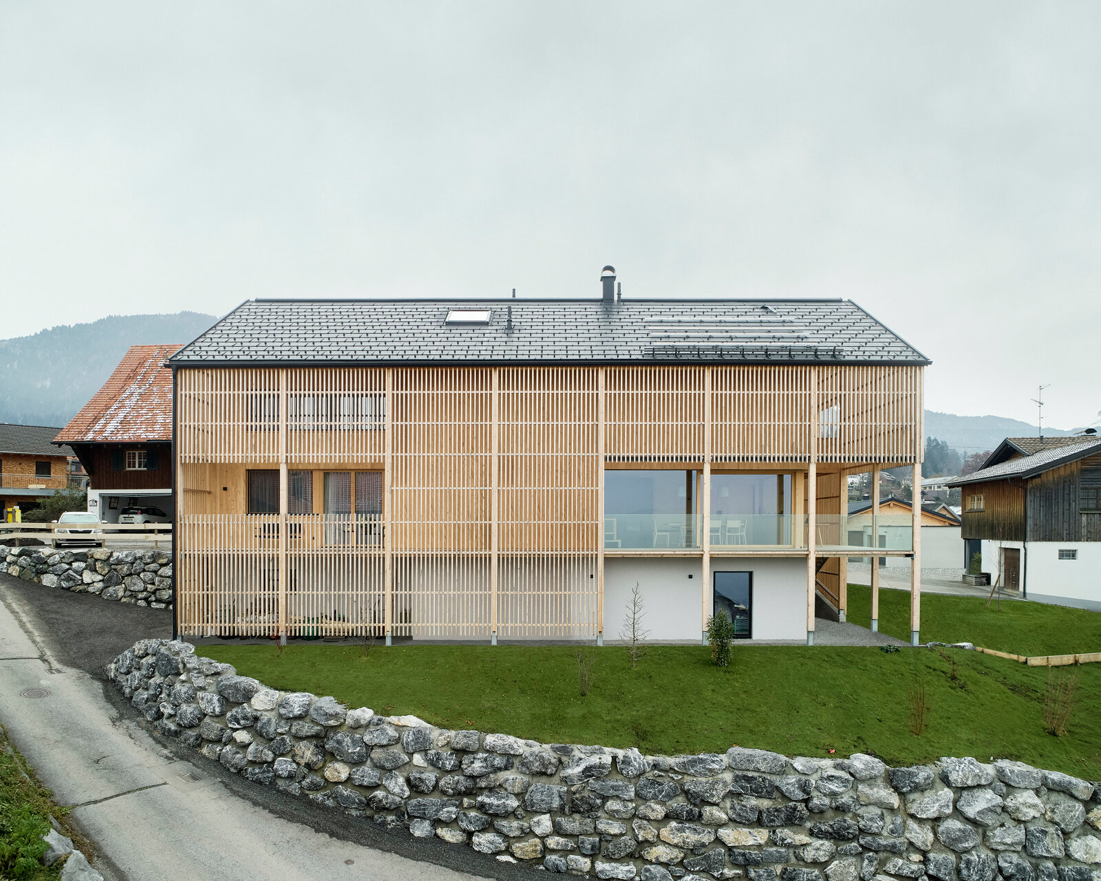 Wie geht man mit einem Einfamilienhaus aus den 1980er-Jahren um, das keine architektonischen Qualitäten aufweist? Und das nun Platz für drei Generationen bieten soll? Ein Abriss liegt da nahe, zumal es sich – zumindest anfangs –, um die kostengünstigere Variante handelte. Trotzdem entschieden sich die Bauherren des Generationenhauses in einem kleinen Vorarlberger Bergdorf für den größtmöglichen Erhalt der Bausubstanz. Der Grund ist in der Geschichte des Gebäudes zu finden, wie Lukas Mähr von MWArchitekten erläutert: »Die Familie errichtete das Haus ursprünglich selbst und setzte das sehr hochwertig um. Im Bestand steckten also gute Materialien und viel Herzblut.« Für den Umbau verfolgte Mähr das Konzept einer umschließenden Holzhülle. Sie verwandelt das Konglomerat aus Wohnhaus und Doppelgarage in ein homogenes Ganzes, das nun wie selbstverständlich an seinem Platz sitzt. Dabei hielt die Lage des Hauses aufgrund der Erschließungssituation und der vorhandenen Bebauungsdichte einige Herausforderungen bereit. Das kleine Dorf, oberhalb des Rheintals gelegen und über Serpentinen mit dem Auto erreichbar, weist einen historisch gewachsenen Kern auf. Traditionelle Holzbauten mit einer Mischnutzung aus Wohnen und Landwirtschaft prägen den Ort. Alles ist über enge und steile Gassen miteinander verbunden – und so war die Erschließung eines der ersten Probleme, die der Architekt lösen musste. Um mehr Wohnraum zu schaffen, wurde die ursprünglich im EG befindliche Garage auf die nördliche Querseite des im Hang sitzenden UGs verlegt. Damit die Zufahrt funktioniert, dürfen die Bauherren nun beim gegenüberliegenden Nachbarn rangieren.
