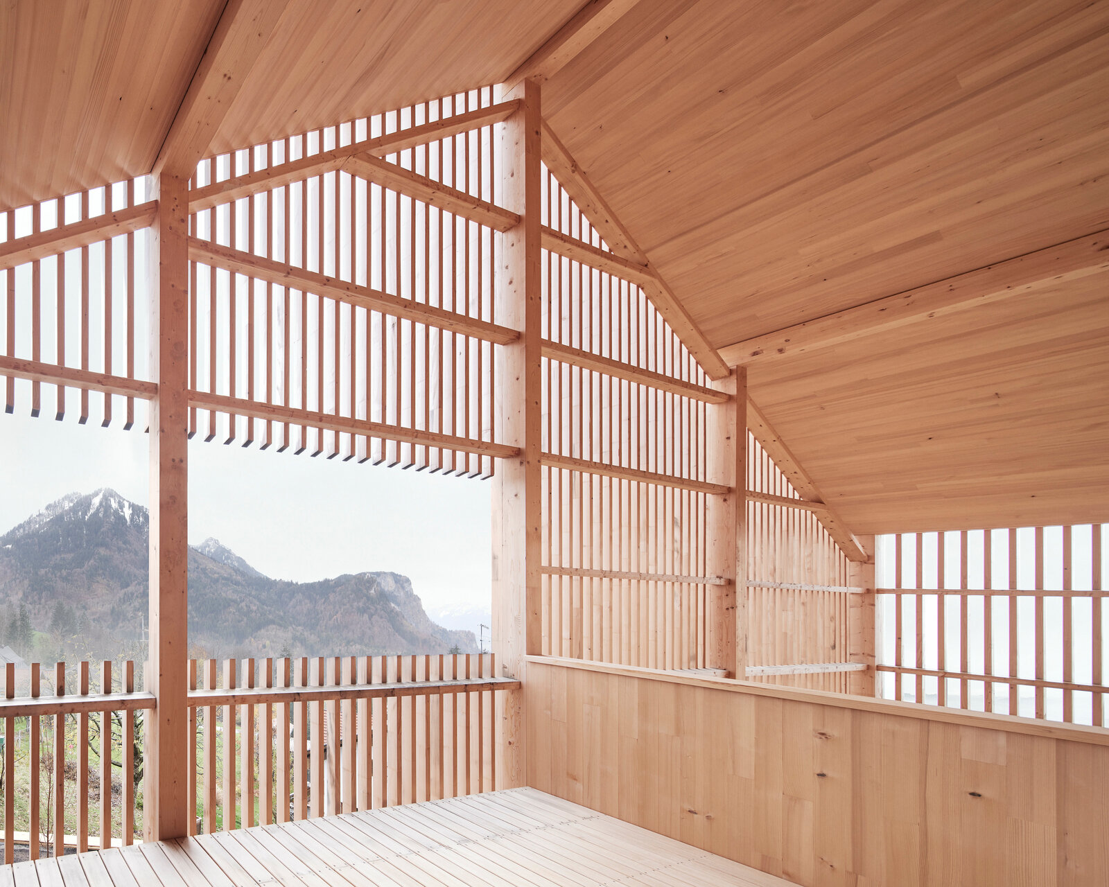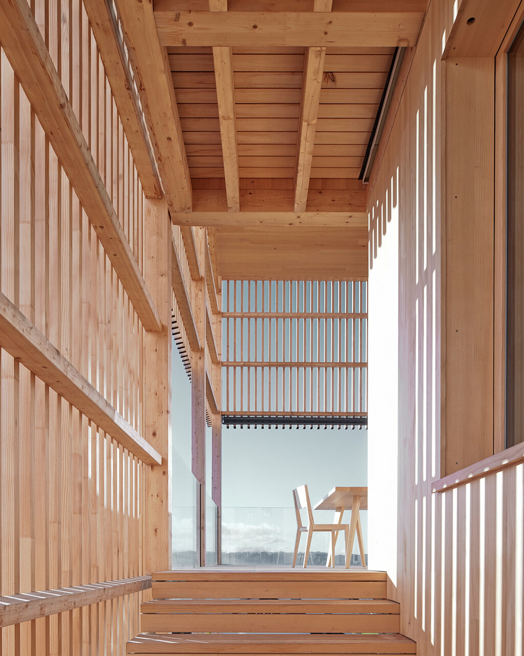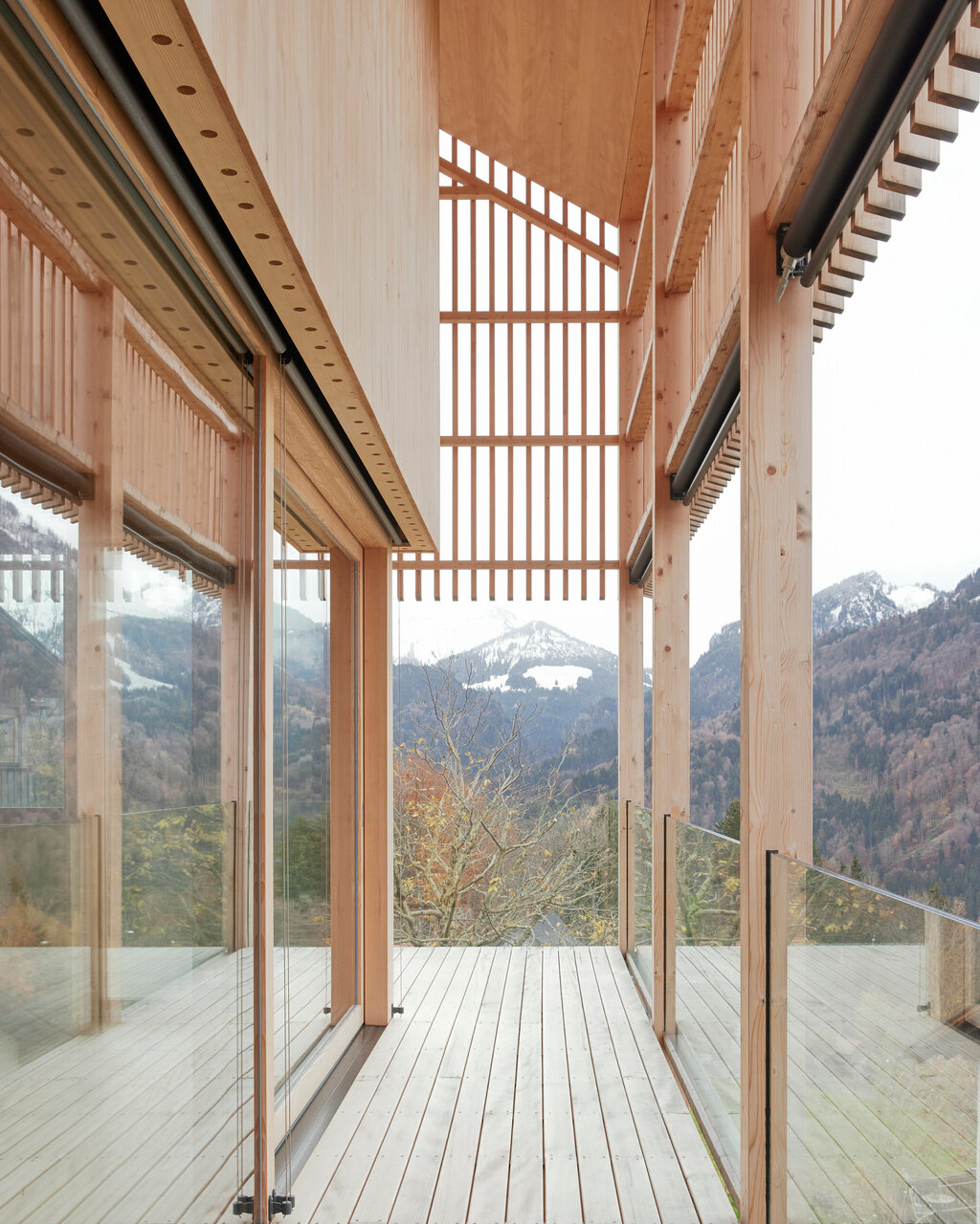 Mittels großzügiger Öffnungen wird hier der Außen- mit dem Innenraum verwoben. Der Essbereich öffnet sich in der größeren Wohnung mit Fenstern und Glasschiebetüren über Eck zu einem umlaufenden Balkon, der auch von der Einliegerwohnung genutzt werden kann. Die Latten sind so perforiert, dass sie als Sichtschutz zu den Nachbarn funktionieren und trotzdem Ausblicke ermöglichen, wie Mähr erklärt: »Wir haben viel mit dem Abstand zwischen den Holzlatten experimentiert und verschiedene Muster gebaut, um das richtige Verhältnis von offen und geschlossen hinzubekommen.« Zudem gibt es gezielte Ausschnitte in der Lattung, die u. a. beeindruckende Ausblicke auf den angrenzenden Hausberg und das Rheintal inklusive Bodensee freigeben, ohne das kompakte Erscheinungsbild des Baus zu stören.
