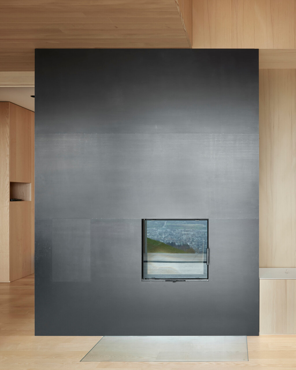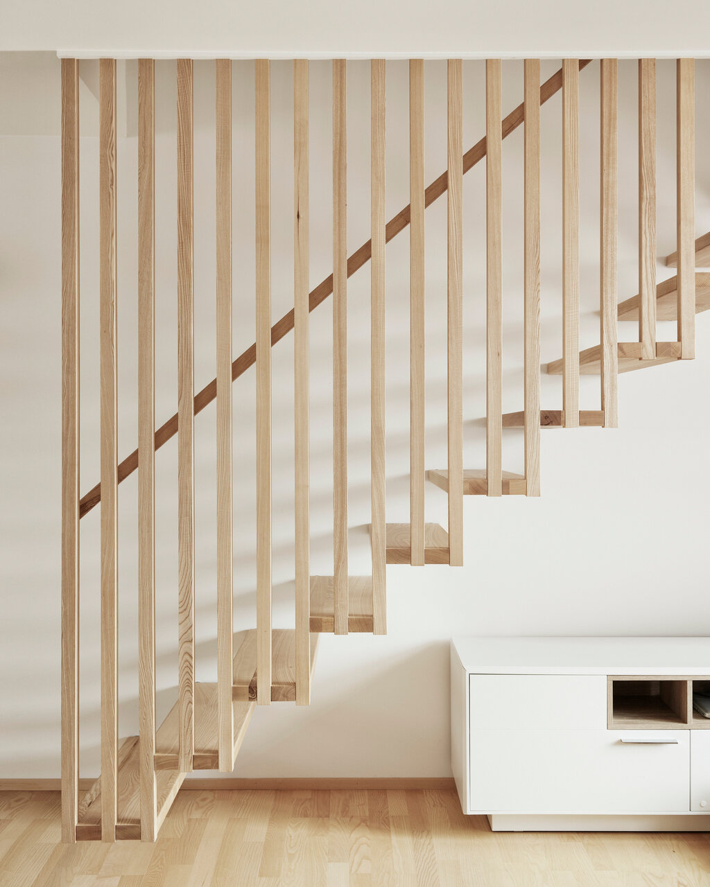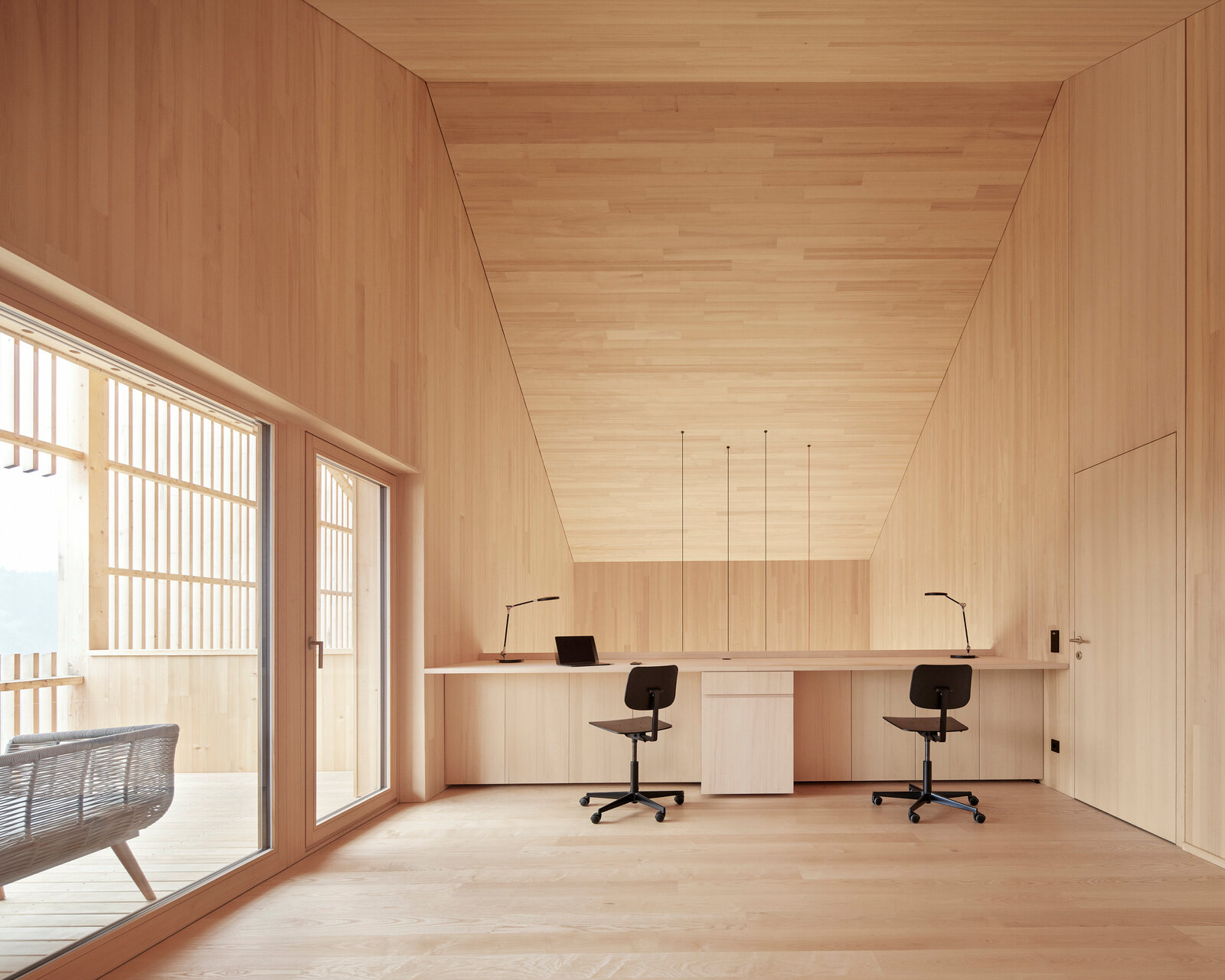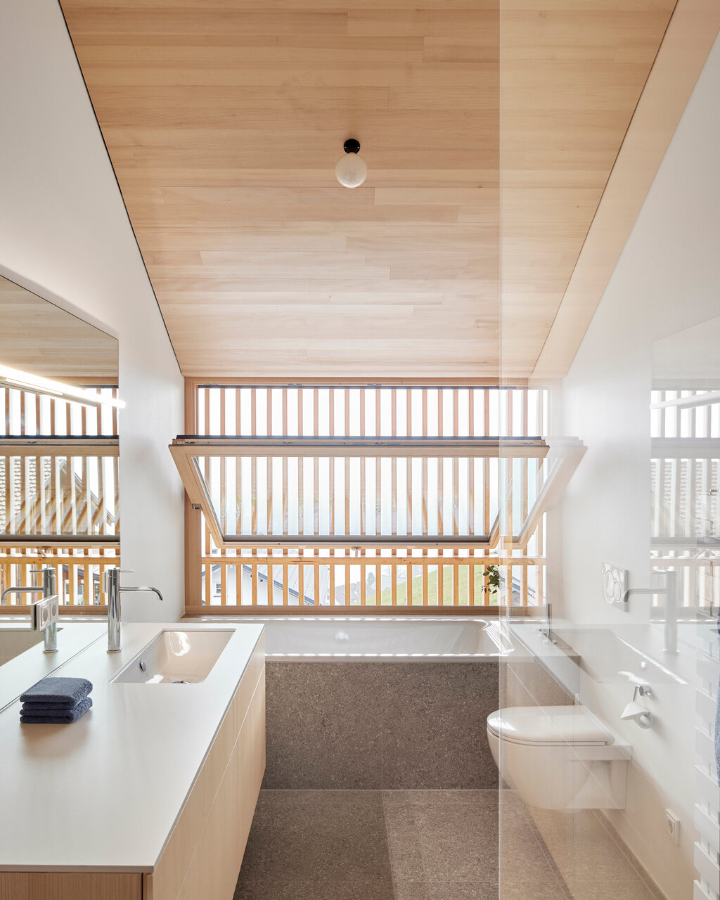 Mittels großzügiger Öffnungen wird hier der Außen- mit dem Innenraum verwoben. Der Essbereich öffnet sich in der größeren Wohnung mit Fenstern und Glasschiebetüren über Eck zu einem umlaufenden Balkon, der auch von der Einliegerwohnung genutzt werden kann. Die Latten sind so perforiert, dass sie als Sichtschutz zu den Nachbarn funktionieren und trotzdem Ausblicke ermöglichen, wie Mähr erklärt: »Wir haben viel mit dem Abstand zwischen den Holzlatten experimentiert und verschiedene Muster gebaut, um das richtige Verhältnis von offen und geschlossen hinzubekommen.« Zudem gibt es gezielte Ausschnitte in der Lattung, die u. a. beeindruckende Ausblicke auf den angrenzenden Hausberg und das Rheintal inklusive Bodensee freigeben, ohne das kompakte Erscheinungsbild des Baus zu stören.