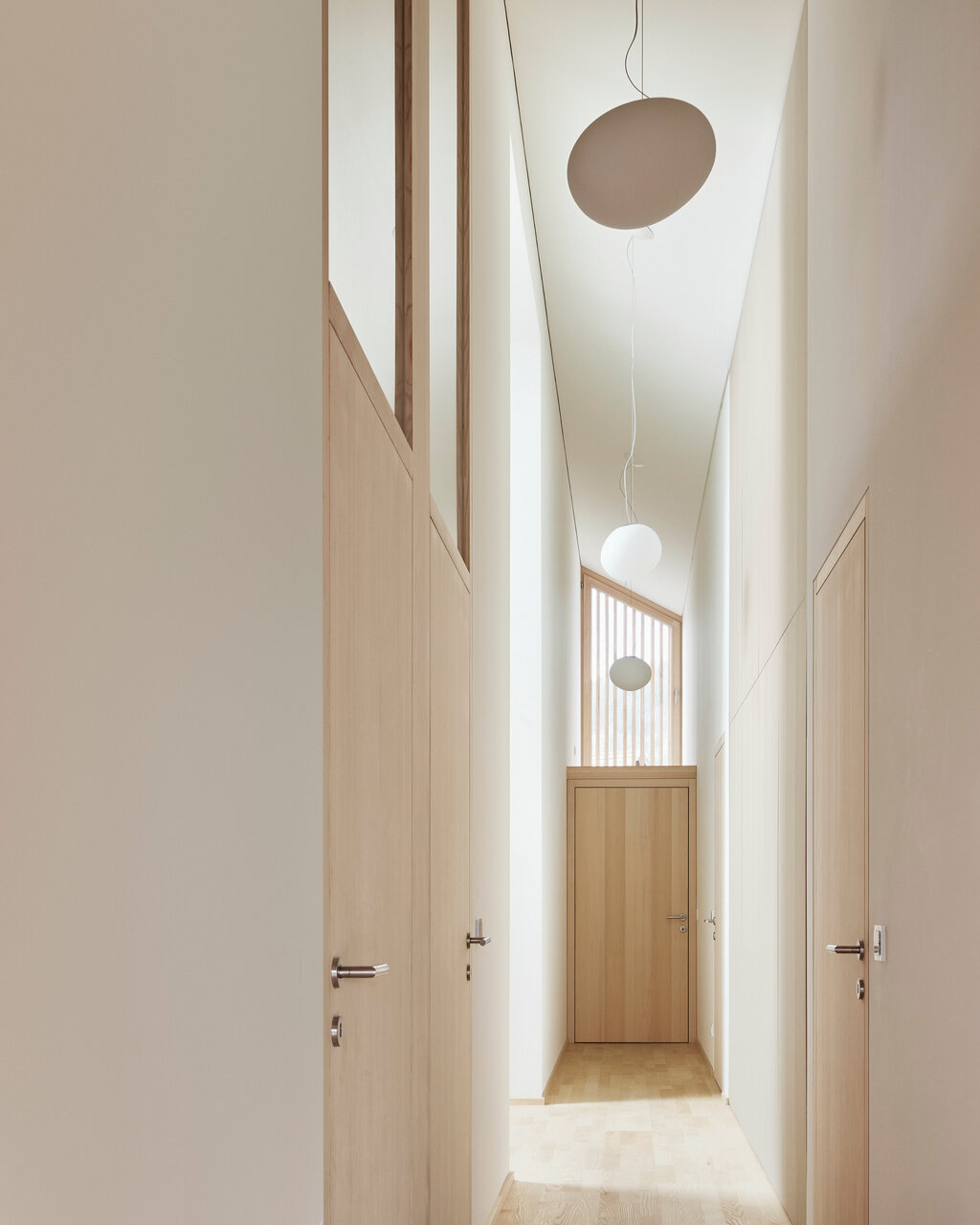Beeindruckend ist auch die handwerkliche Präzision des Filters: So wurden die Latten als Schwalbenschwanzverbindung ausgeführt, was ein ruhiges und wohlproportioniertes Erscheinungsbild erzeugt. Die Scheiben der Glasbrüstung kommen ohne sichtbare Verbindungselemente aus und wurden stattdessen in Ausfräsungen an den tragenden Stützen eingefasst. Ein weiteres gelungenes Detail ist die Hinterlüftung der Fassade, die aus kreisrunden Löchern besteht und dezent zum grafischen Erscheinungsbild beiträgt. Der Wille zur handwerklichen Präzision findet sich auch im Innern wieder. Ein Beispiel ist der Essbereich in der Familienwohnung, dessen zwei Stockwerke umfassende Wände inklusive überspannendem Satteldach mit unbehandelter Weißtanne verkleidet sind. Trotz seiner sakral anmutenden Höhe wird der Raum zum behaglichen Wohnmöbel mit Sitznische. Das restliche Mobiliar wie auch die angrenzende Küche oder die Einbauschränke in den Erschließungsbereichen wurden ebenfalls vom Architekten geplant, wie Mähr erläutert: »Wir achten sehr darauf, dass die von uns verwendeten heimischen Hölzer wie Esche für Boden, Möbel und Türen oder Weißtanne für die Fenster und Verkleidungen im Zusammenspiel ein homogenes Ganzes bilden.« Dadurch ergibt sich innen wie außen ein stimmiges Gesamtbild, dem man zu keiner Zeit ansieht, dass es sich hier um einen Umbau handelt. Die Entscheidung, den Bestand zu erhalten, lohnte sich für die Bauherren schlussendlich auch finanziell, da einsetzende Lieferschwierigkeiten die Preise für neue Bauprodukte in die Höhe trieben. Damit zeigt das Projekt exemplarisch, dass die Entscheidung für die Bewahrung eines Gebäudes ökologisch und ökonomisch sinnvoll sein kann. Umso besser, wenn dabei gelungene Architektur entsteht.