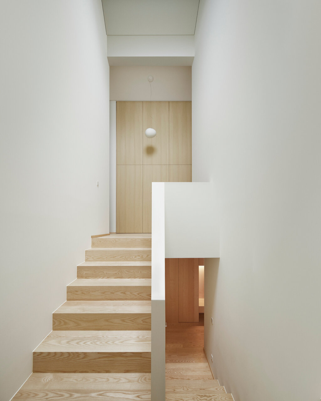 Die Verlegung der Garage ermöglichte eine neue Zonierung des EGs, wobei sich der Architekt an die ursprüngliche Aufteilung von Betongarage und Mauerwerkshaus hielt: Die ehemalige Außenwand des Gebäudes dient im Norden nun als Trennwand für zwei Wohneinheiten, die sich jeweils über das EG und das 1. OG verteilen. In der ehemaligen Garage im Norden ist nun eine Einliegerwohnung mit 75 m² untergebracht. Das südlich gelegene Haupthaus bietet auf 175 m² Platz für eine fünfköpfige Familie. Beide verfügen über separate Eingänge, haben aber über entsprechend platzierte Türen im Innern Zugang zur Kellertreppe. Sie ist Teil der ehemaligen Haupterschließung in Form einer zweiläufigen Treppe, die in der Familienwohnung zum OG führt. In der Einliegerwohnung übernimmt das eine neue, im Wohnbereich platzierte Stichtreppe. Dabei achtete Mähr auf die größtmögliche Beibehaltung der räumlichen Zonierung und damit auch auf die Bewahrung der Bausubstanz. Eine vorhandene Mauerwerkswand in der größeren Wohnung trennt etwa das Wohnzimmer auf der Straßenseite vom Ess- und Kochbereich auf der Hangseite. Gleichzeitig wird sie durch Schiebetüren perforiert, die fließende räumliche Übergänge erzeugen. Im Gegensatz zu den beiden Geschossen darunter handelt es sich beim 1. OG um eine neue Konstruktion in Holzständerbauweise mit Zellulosedämmung. Sie ersetzt das alte DG, das einen zu niedrigen Kniestock hatte. Durch die dazugewonnene Raumhöhe konnten drei Schlafzimmer, ein großes Arbeitszimmer und zwei Bäder in der Familienwohnung untergebracht werden. Der Grundriss ist flexibel gehalten und ohne größere Baumaßnahmen neu konfigurierbar. Ein Beispiel ist das durch einen Luftraum mit dem darunterliegenden Ess- und Kochbereich verbundene Arbeitszimmer. Es kann in ein räumlich abgetrenntes Schlafzimmer umgewandelt werden, da die Unterteilung der im Süden gelegenen Fenstertüren das Andocken einer neuen Trennwand ermöglicht.