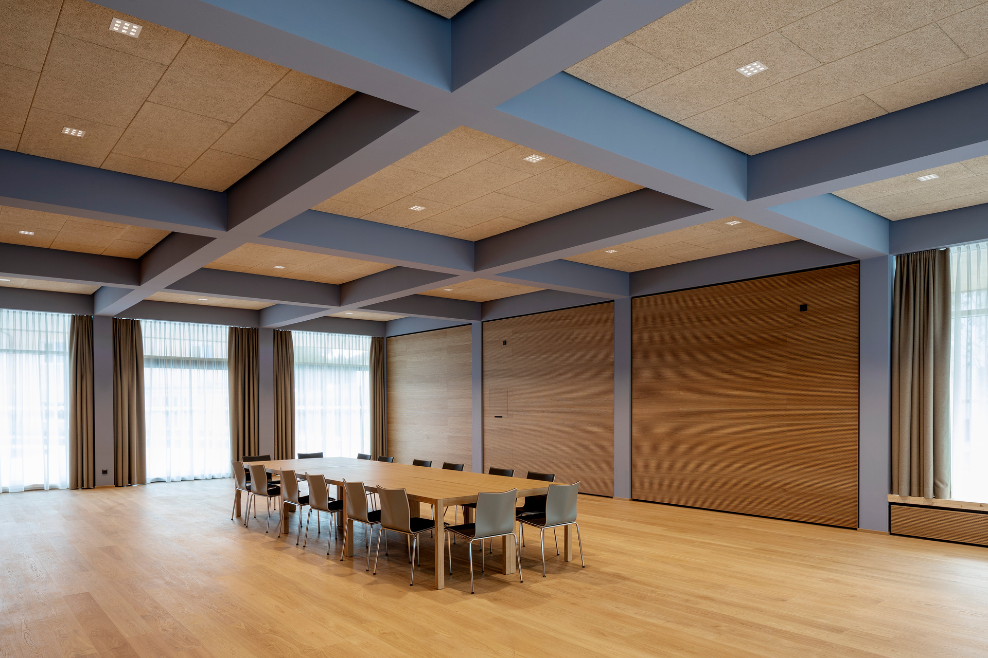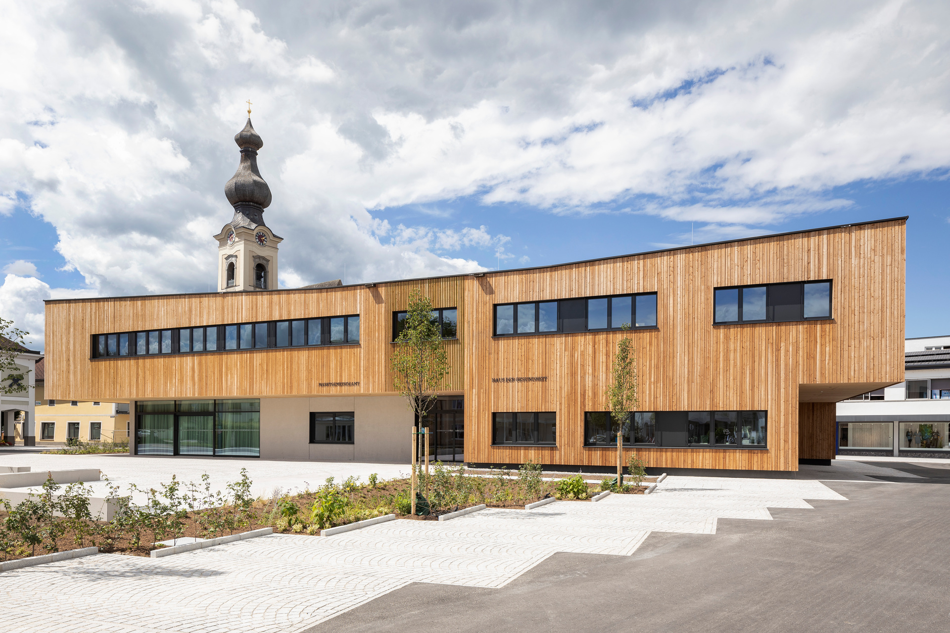 Das Gebäude ist in zwei weitgespannte zweigeschossige Gebäudeflügel gegliedert. Im Erdgeschoss des Westflügels befindet sich der Veranstaltungssaal. In Massivbauweise ausgeführt, bieten seine breiten, raumhohen Fenster großzügige Sichtbeziehungen und damit Verbundenheit zum umgebenden dörflichen Leben. Das als Amtshaus genutzte Obergeschoss wurde hingegen konsequent als Holzkonstruktion errichtet. Seine Fassade besteht aus bündig gesetzten Latten, die ein feines, farblich abwechslungsreiches Vertikalrelief erzeugen.